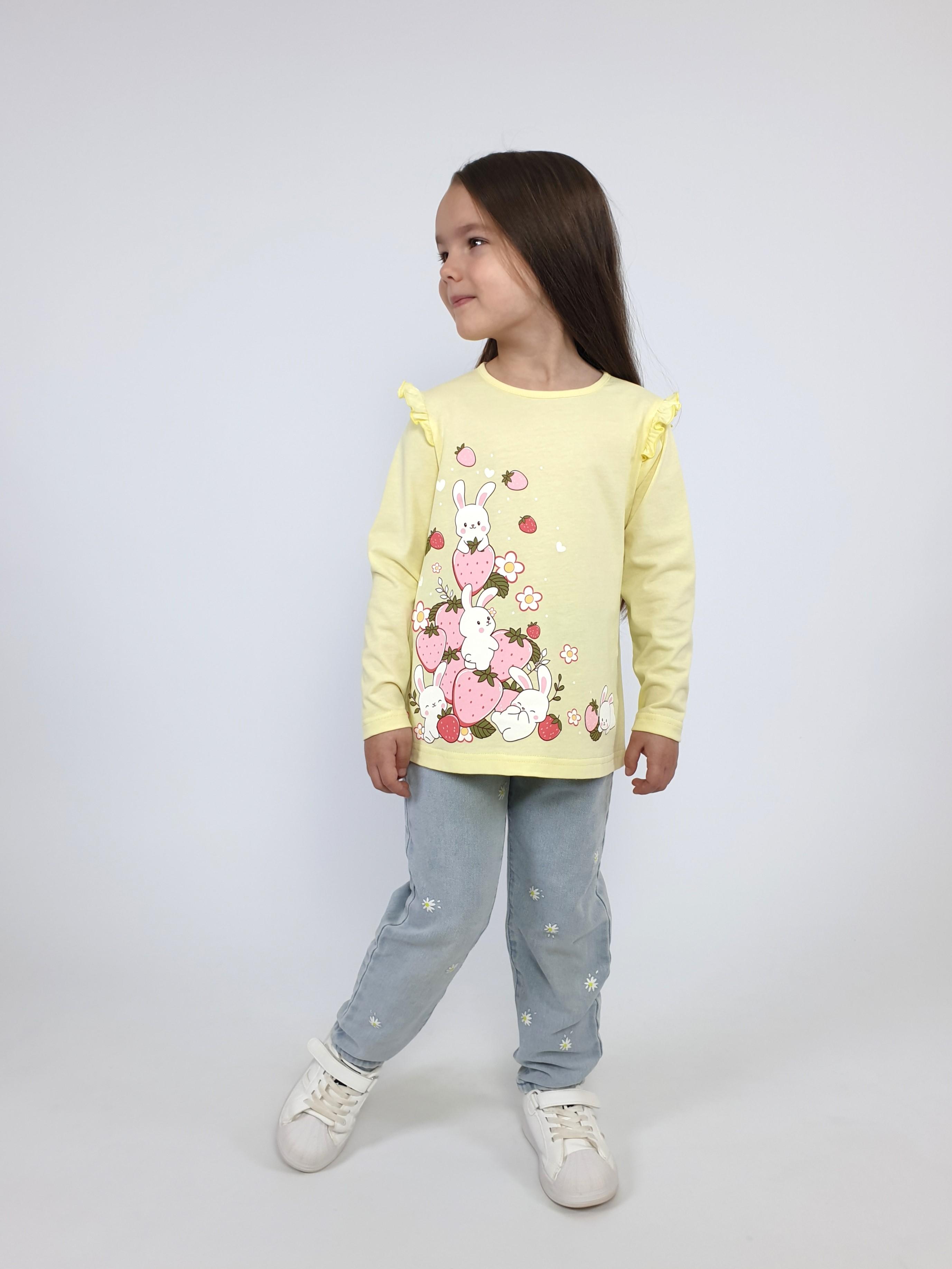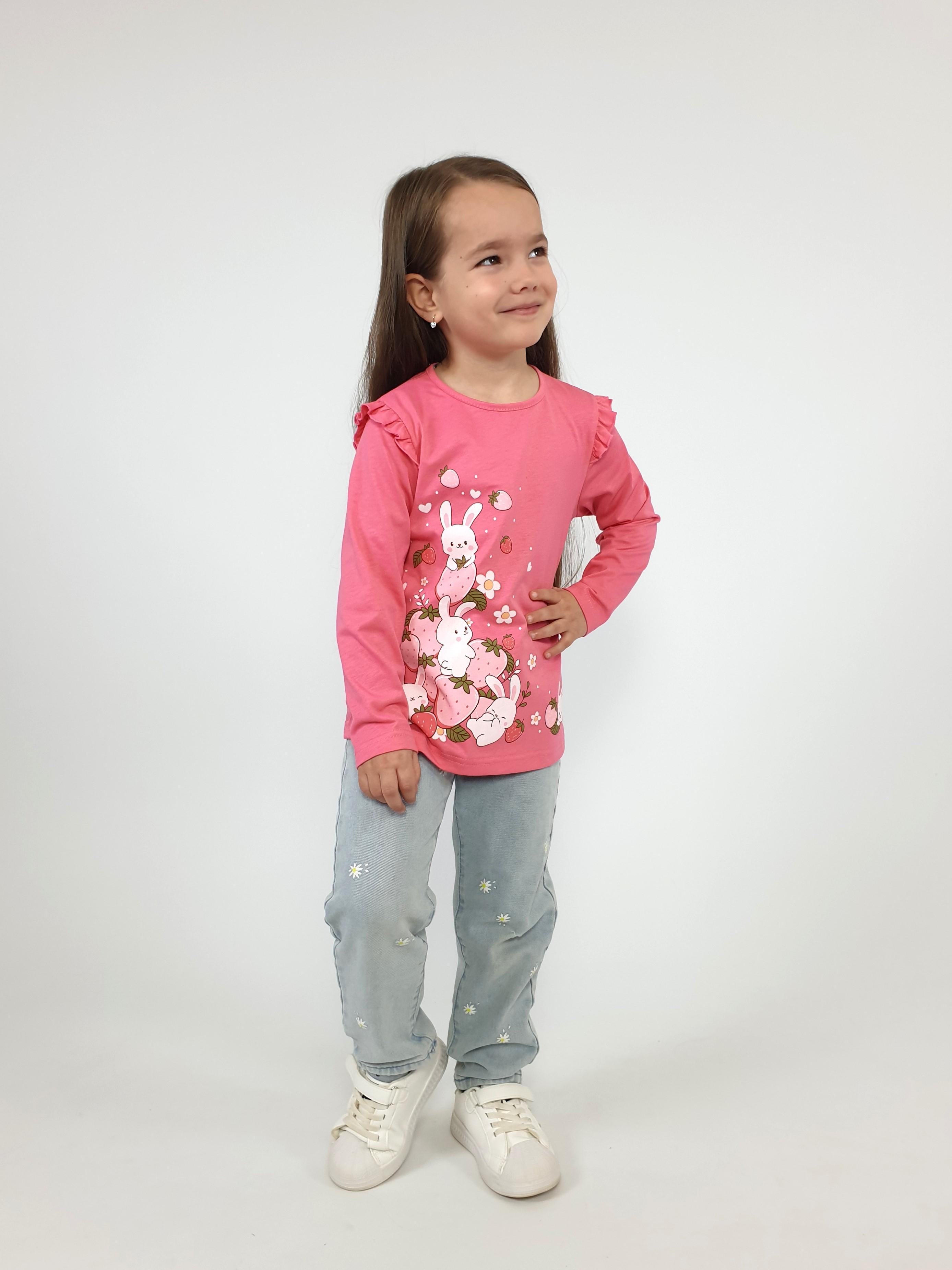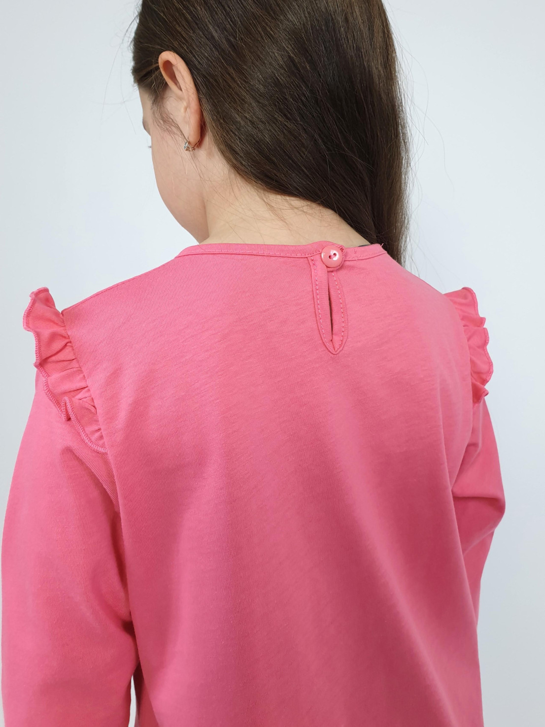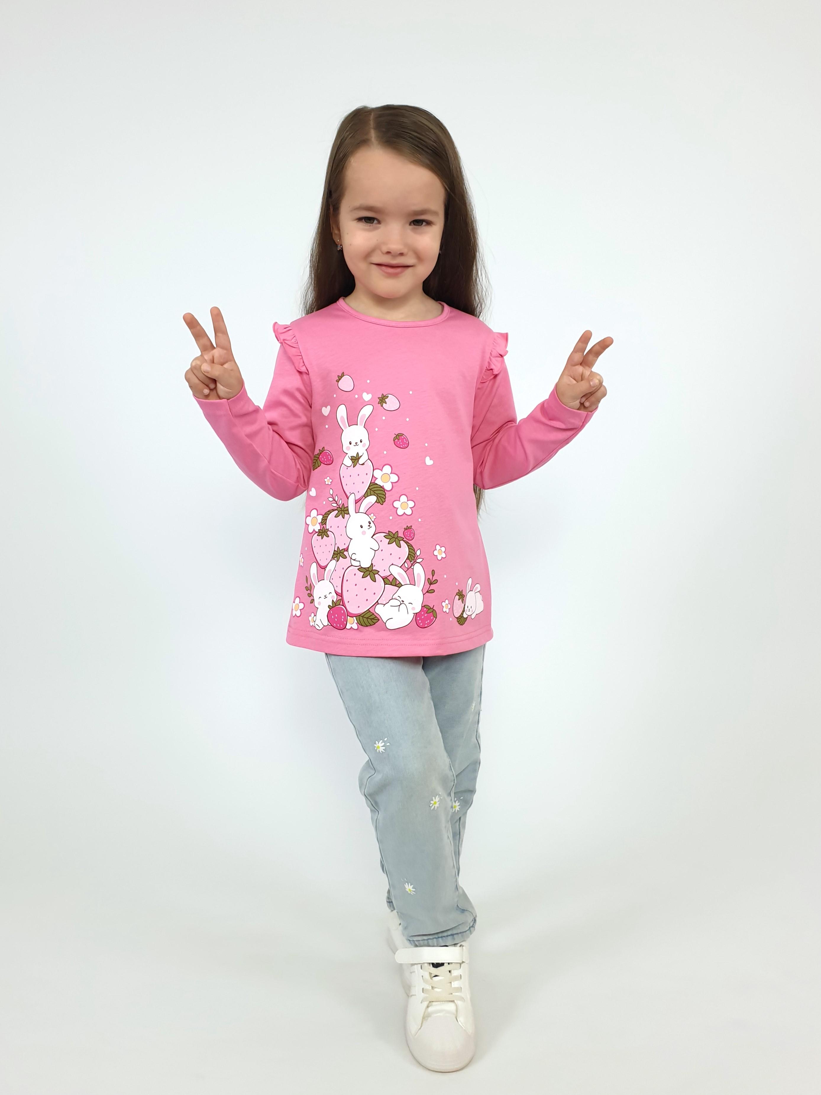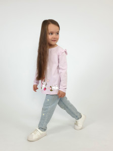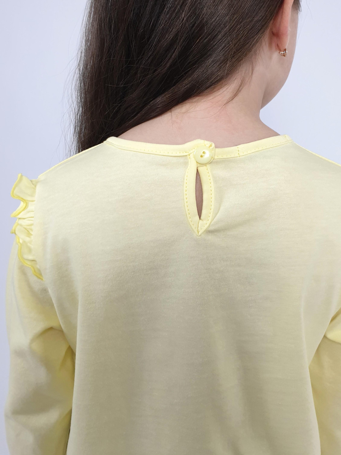 Кулирное полотно:100% х/б. Джемпер-силуэт трапеция,длинный втачной рукав,в пройме рюша.Горловина окантована,застежка на пуговицу по спинке.Печать на переде.