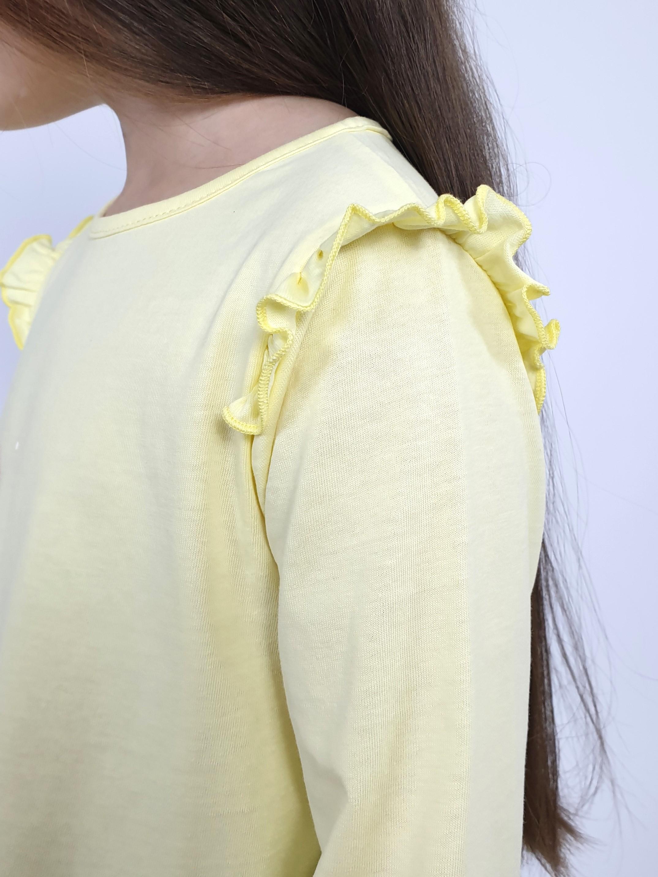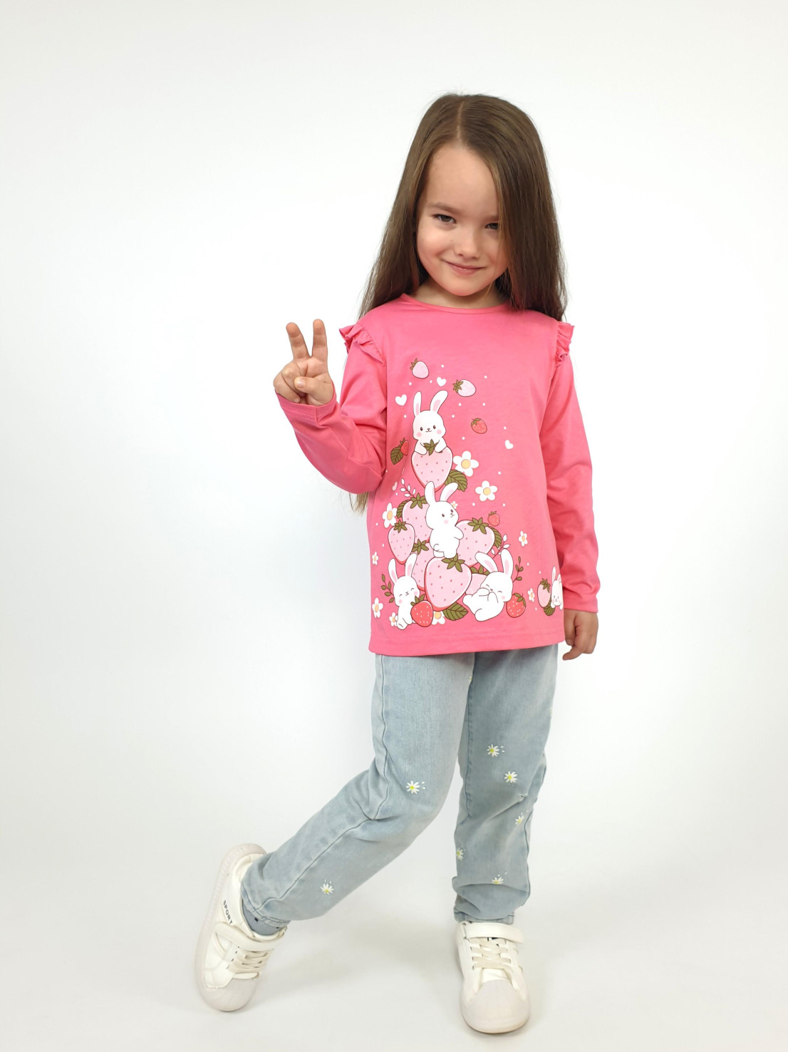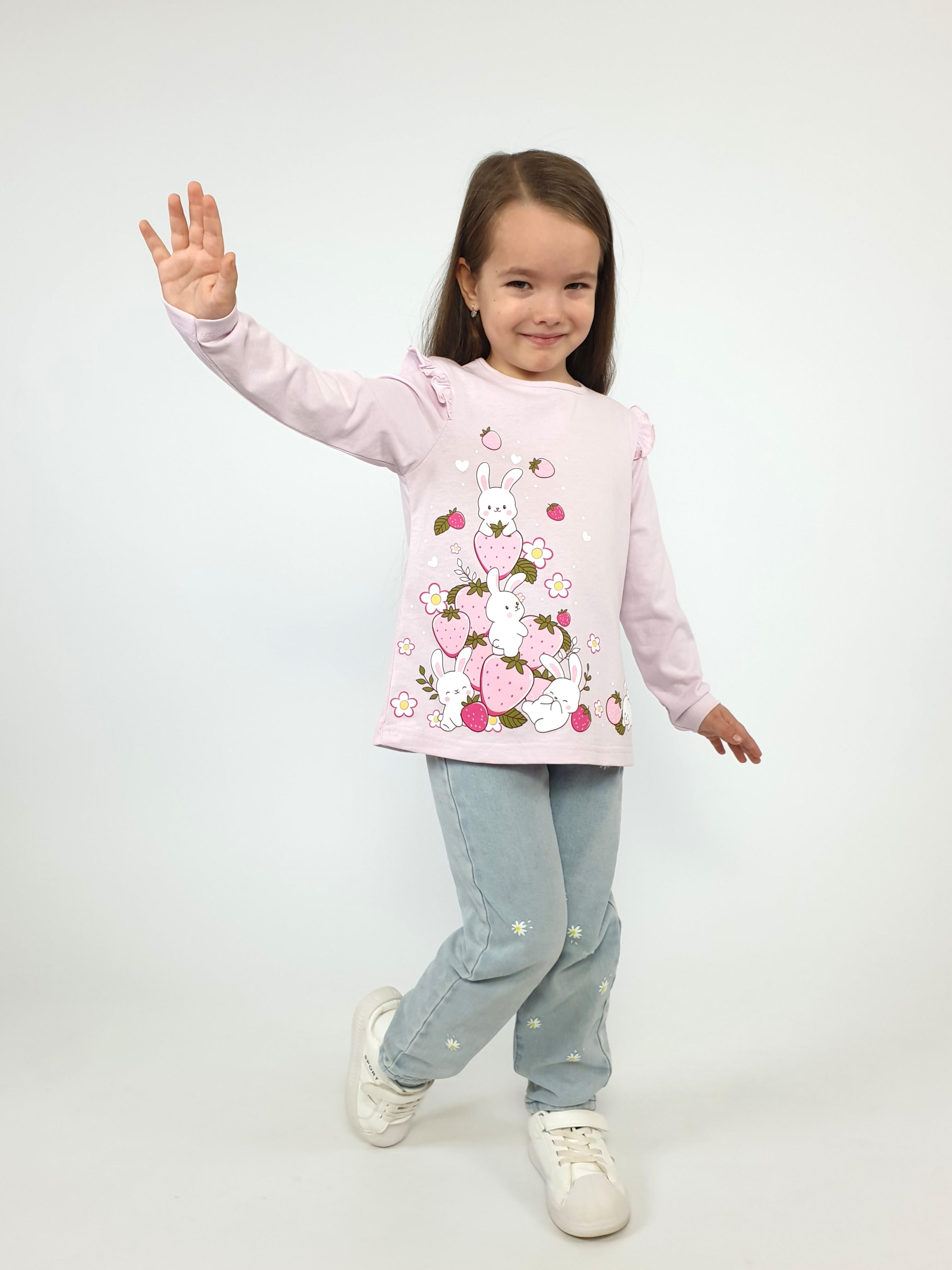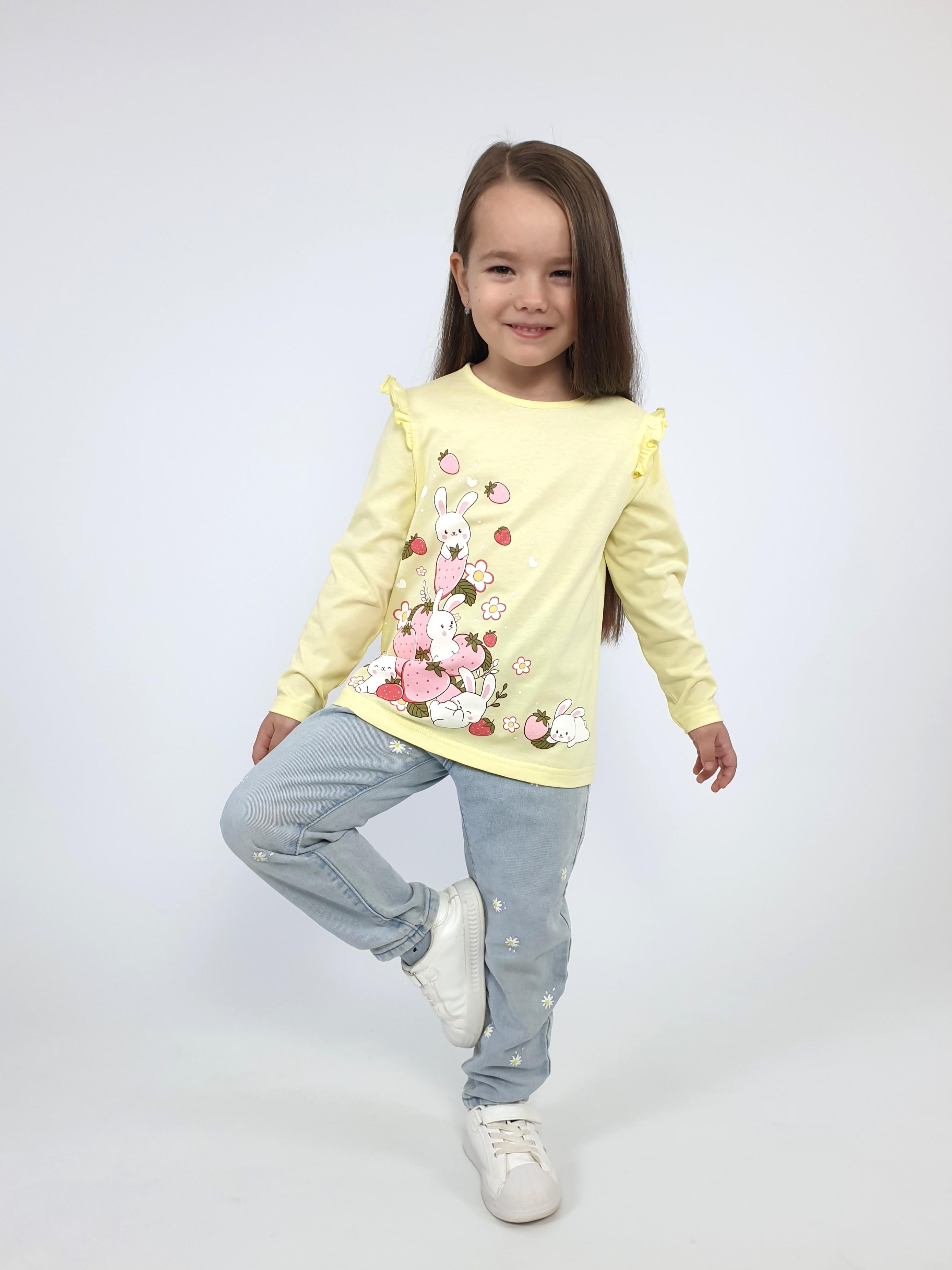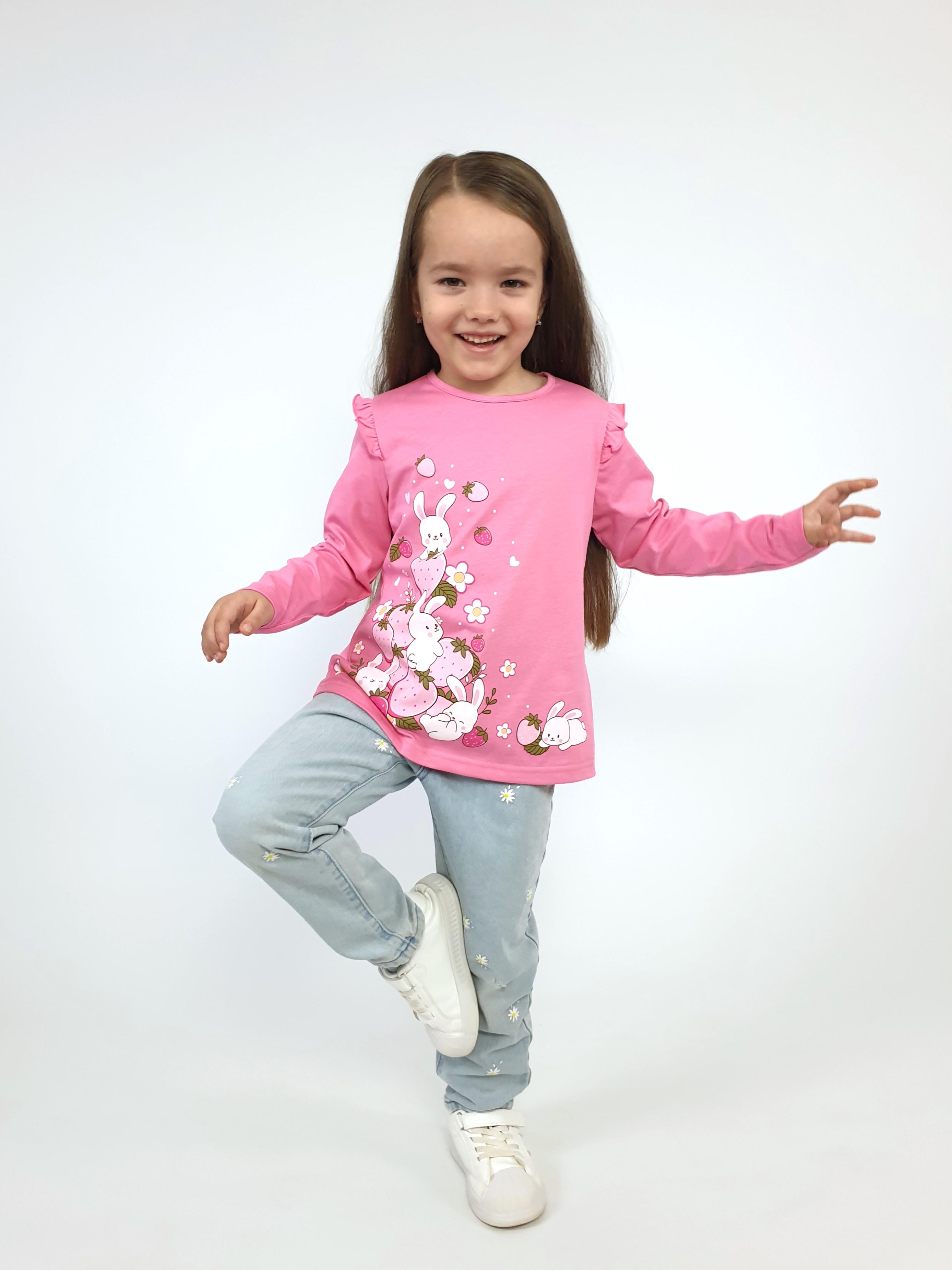 Кулирное полотно:100% х/б. Джемпер-силуэт трапеция,длинный втачной рукав,в пройме рюша.Горловина окантована,застежка на пуговицу по спинке.Печать на переде.