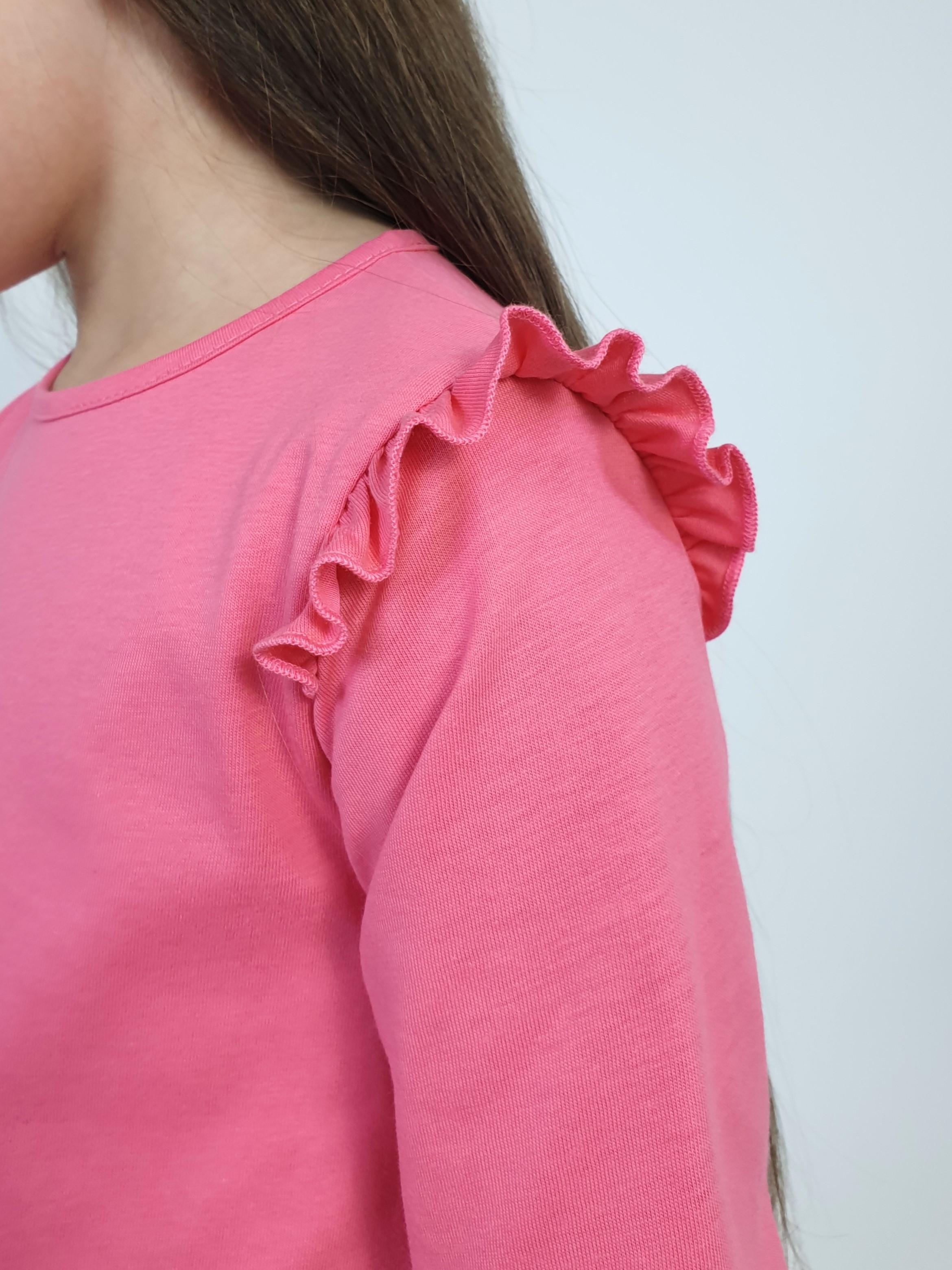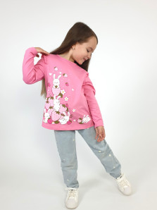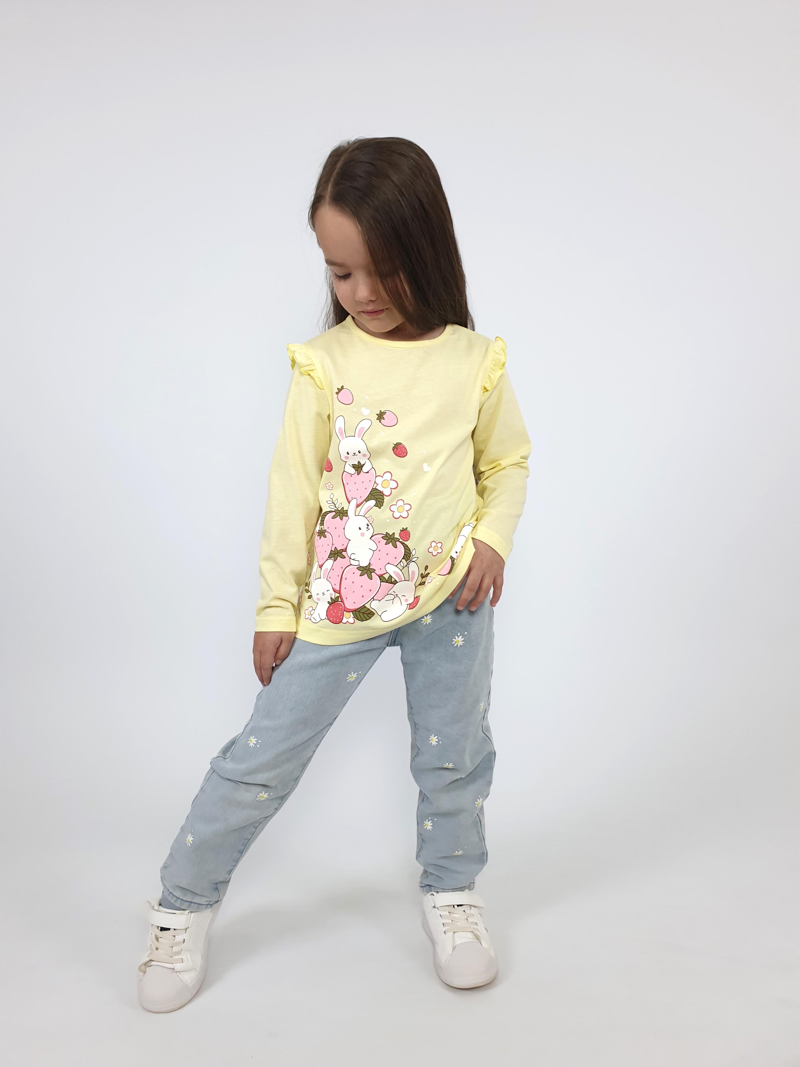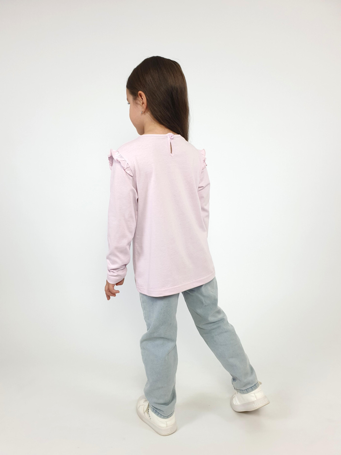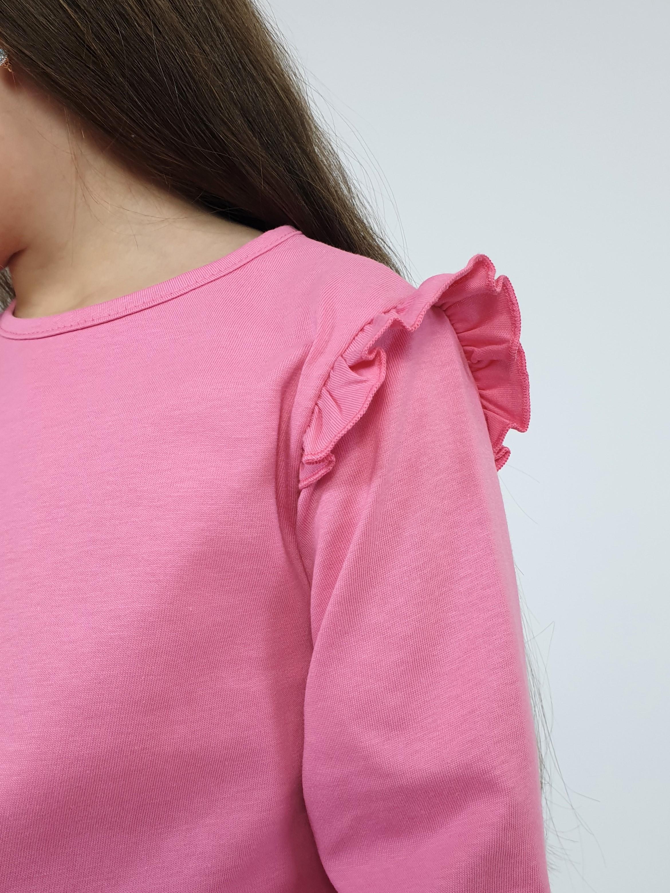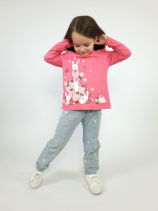 Кулирное полотно:100% х/б. Джемпер-силуэт трапеция,длинный втачной рукав,в пройме рюша.Горловина окантована,застежка на пуговицу по спинке.Печать на переде.