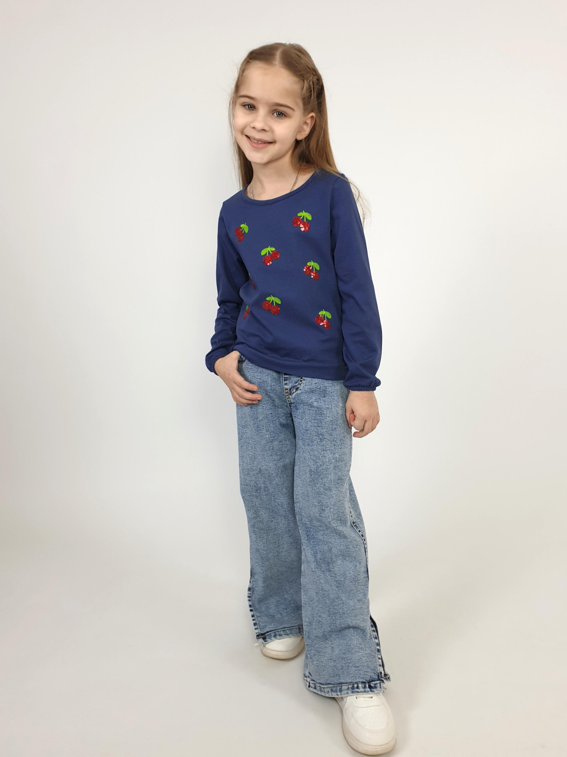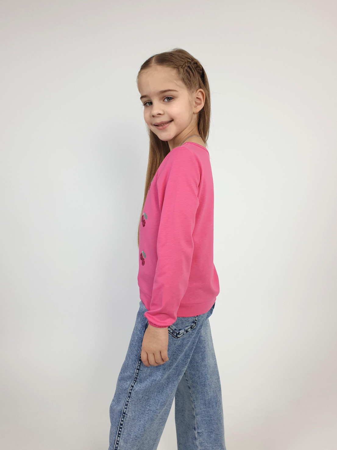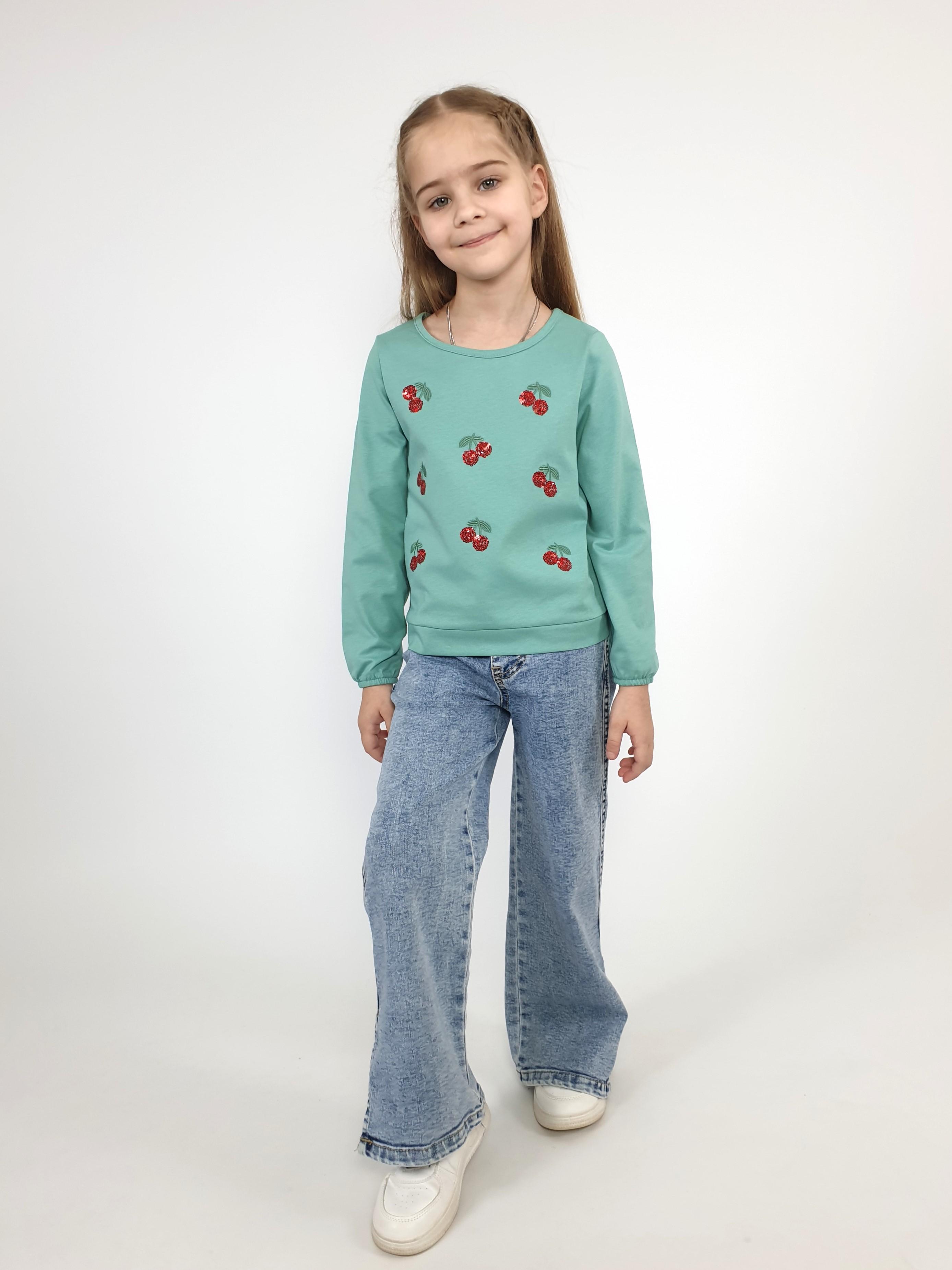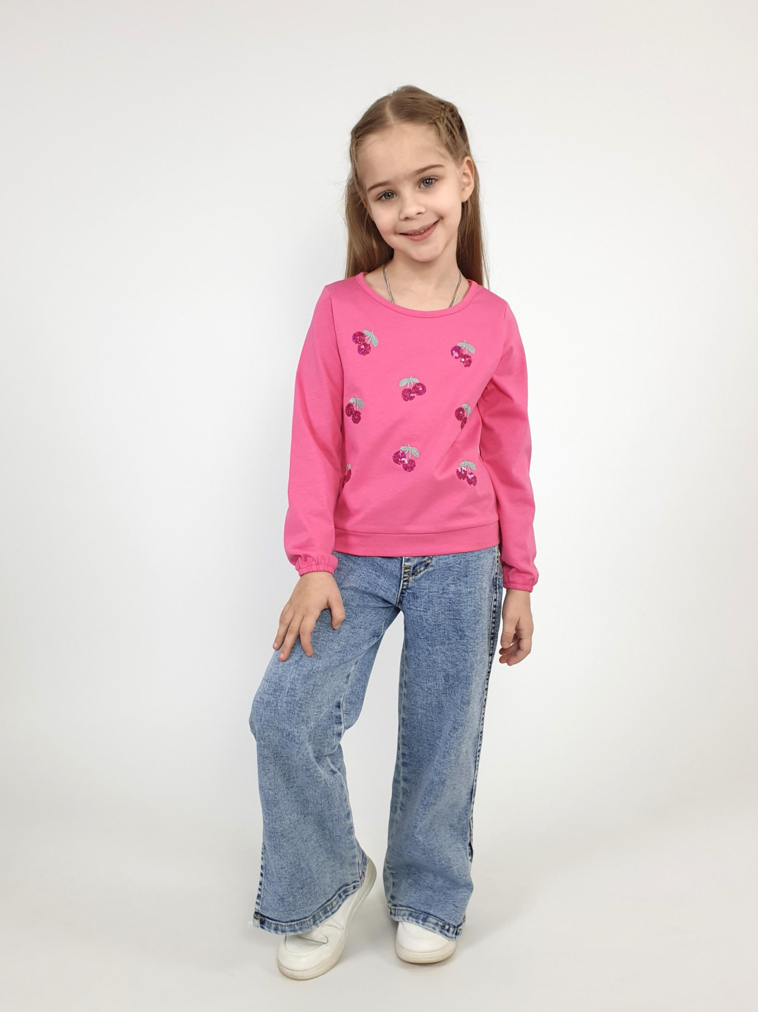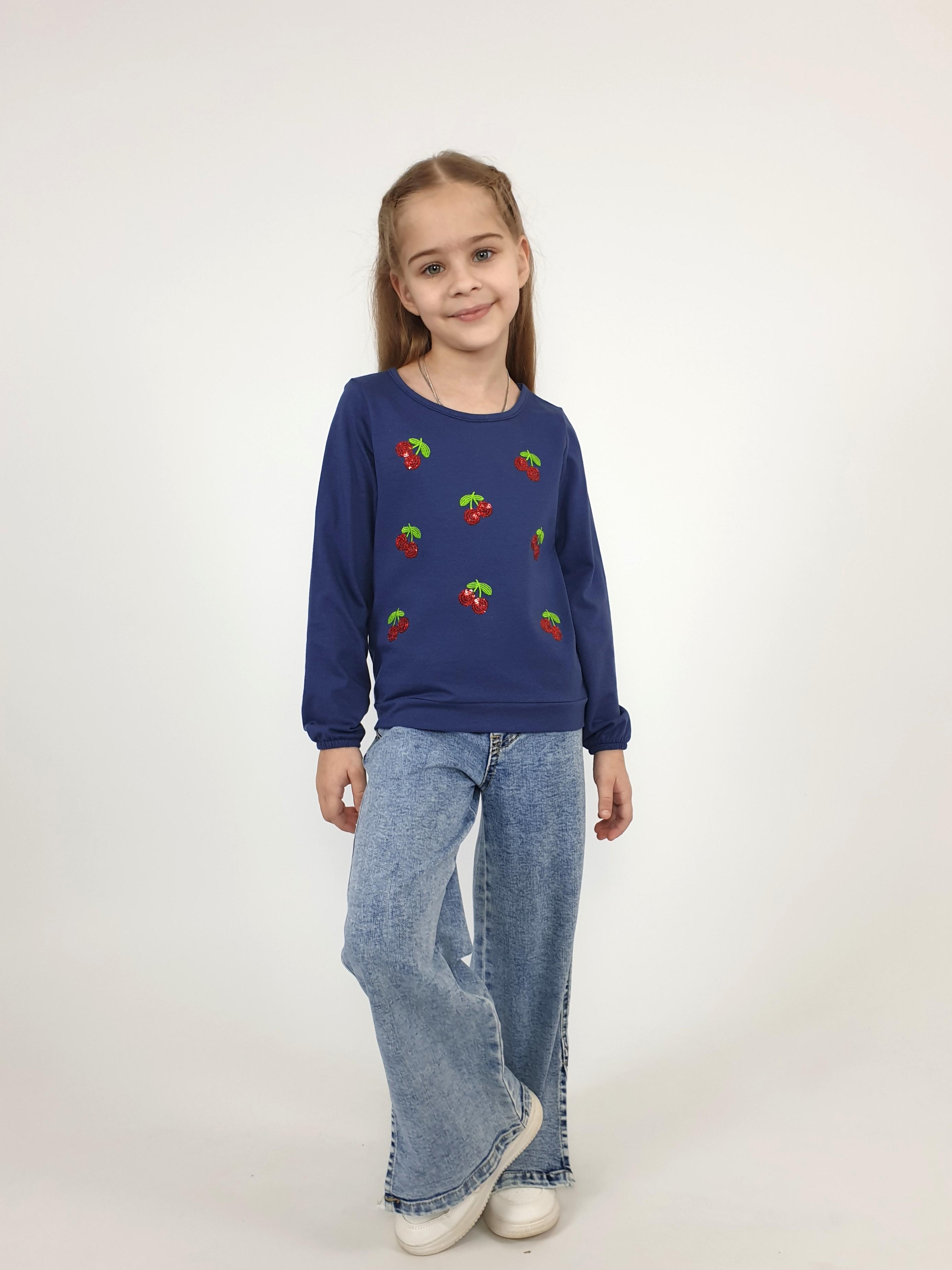 Кулирное полотно:100% х/б. Джемпер-прямого силуэта,на поясе.Перед с вышивкой(пайетки),втачной длинный рукав на резинке.Горловина окантована.