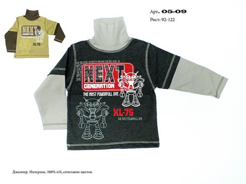 Джемпер. Интерлок, 100% х/б, сочетание цветов. Печать на переде, рукав втачной, длинный из двух частей; декоративная отстрочка. Низ рукава, низ изделия подшит декоративной строчкой. Воротник – стойка из ластика.