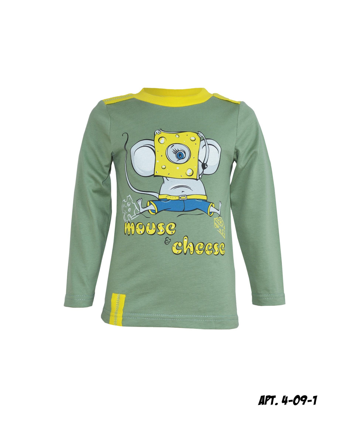 Кулирное полотно, 100% х/б. Фуфайка-прямая, перед с печатью, отделочными полосками из ластика по плечам и низу изделия. Рукав втачной, длинный. Горлолвина обработана ластиком.