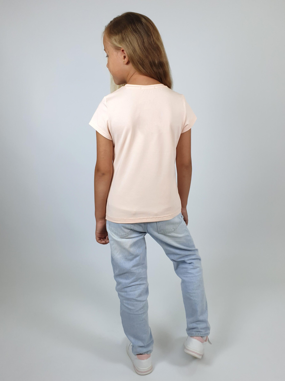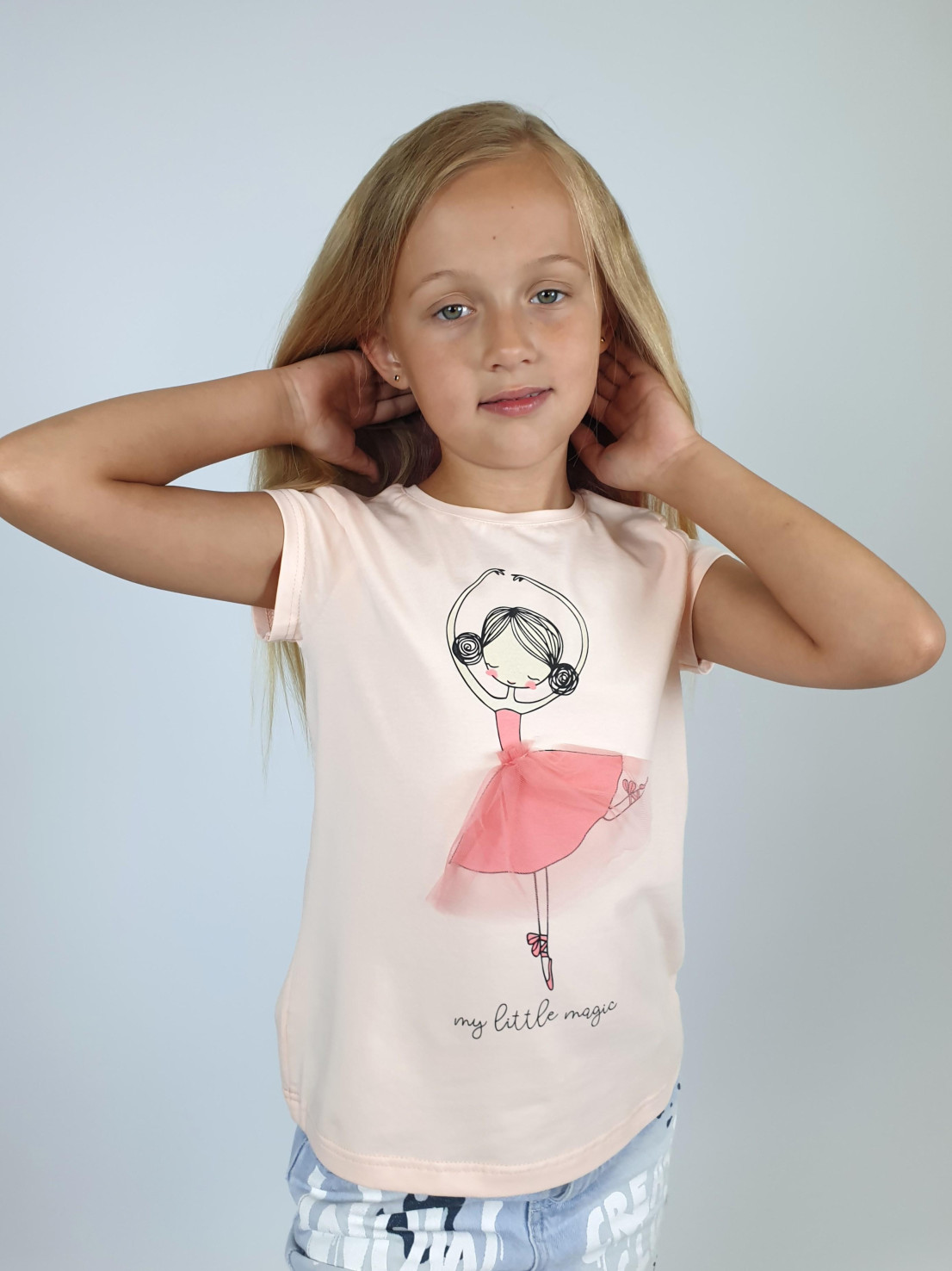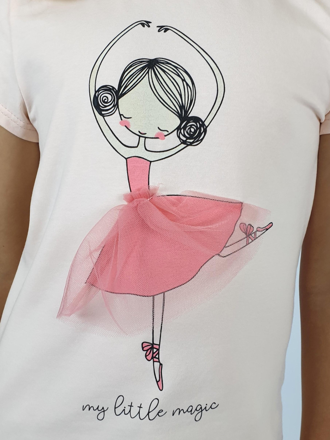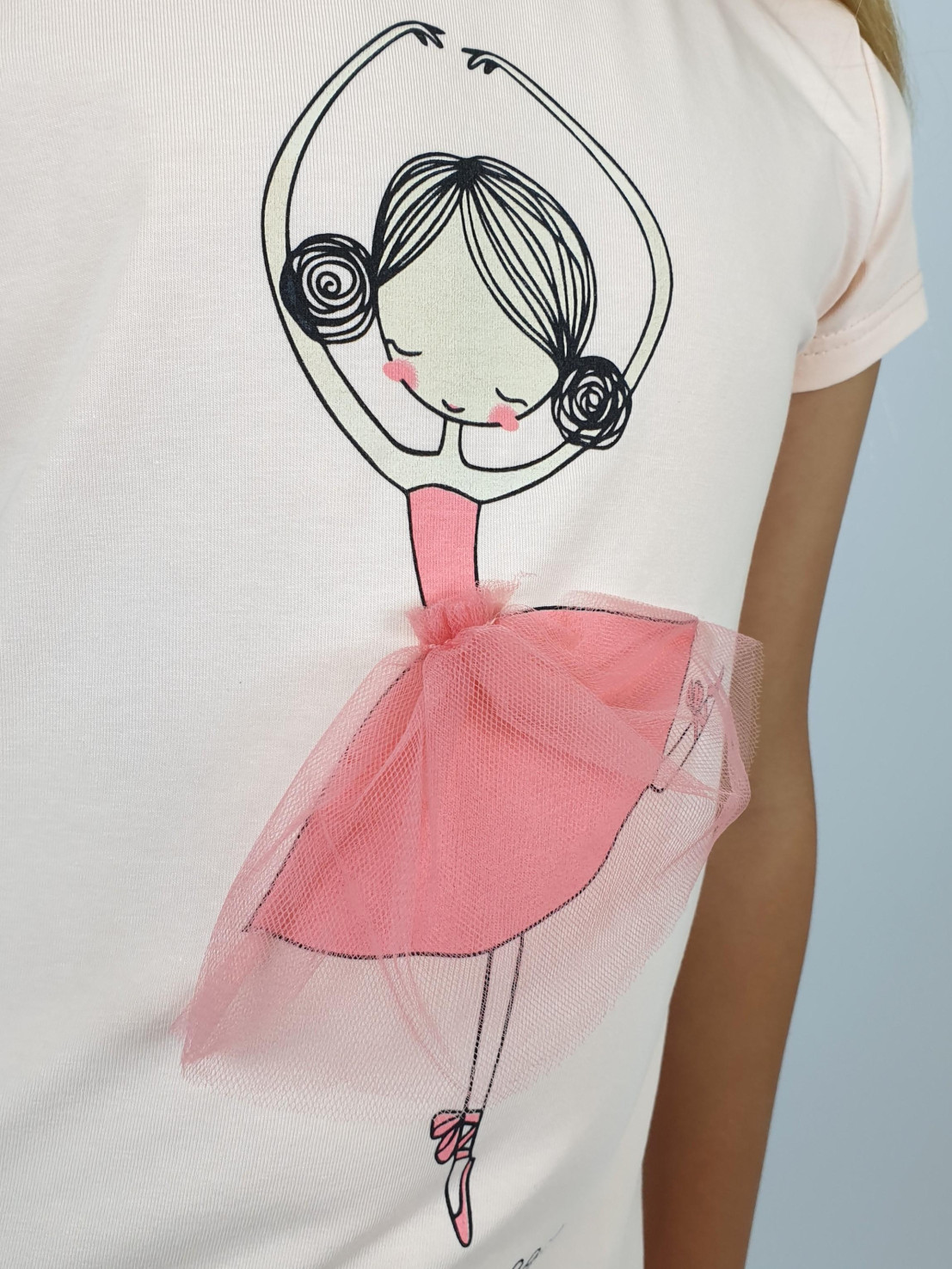 Кулирное полотно: 95% х/б,5% лайкра. Фуфайка-полуприлегающий силуэт,печать на переде с отделочным элементом из сетки"юбка".Горловина обработана притачной планкой.Рукав короткий втачной.Низ рукава и низ изделия подшит.