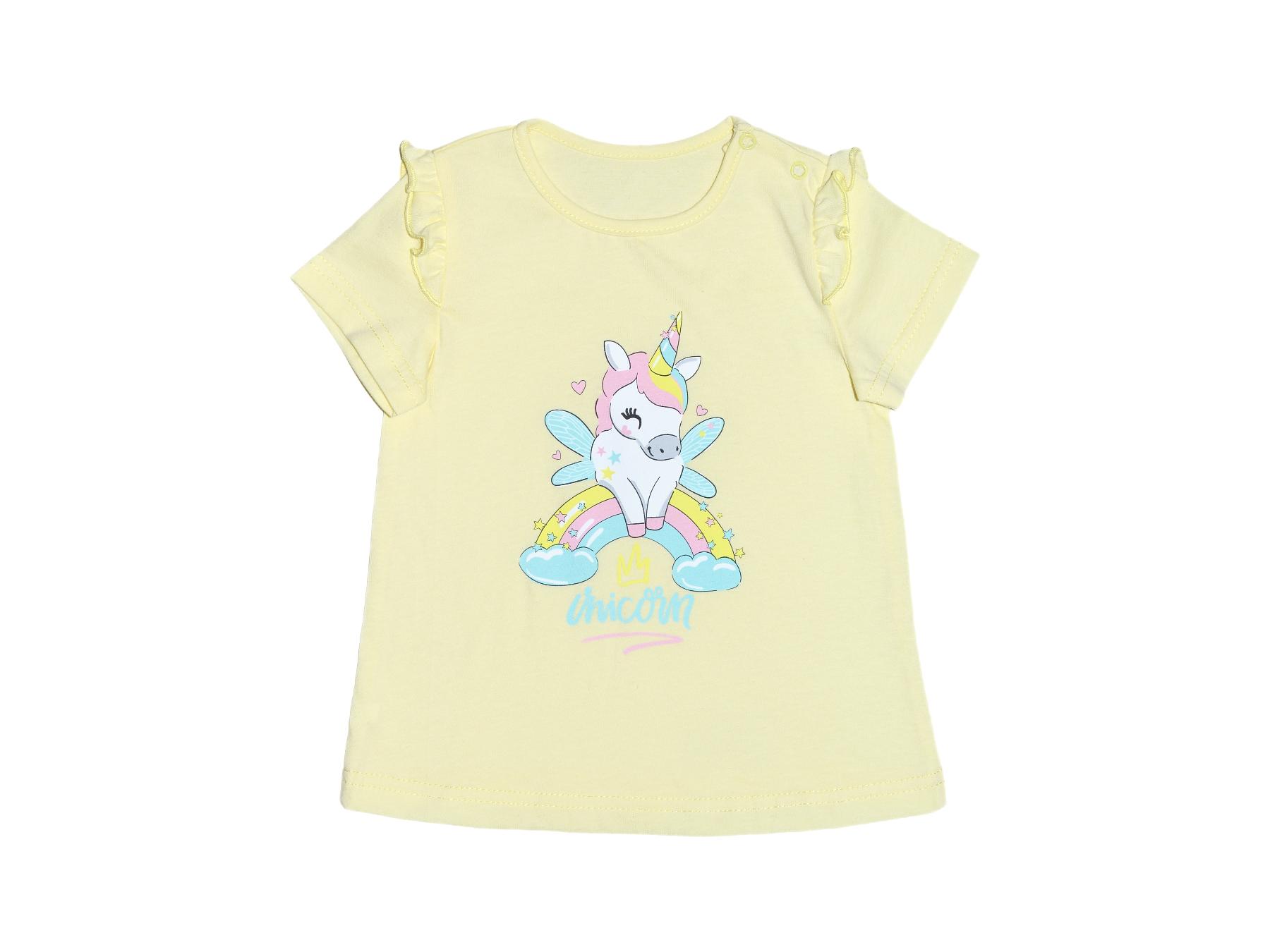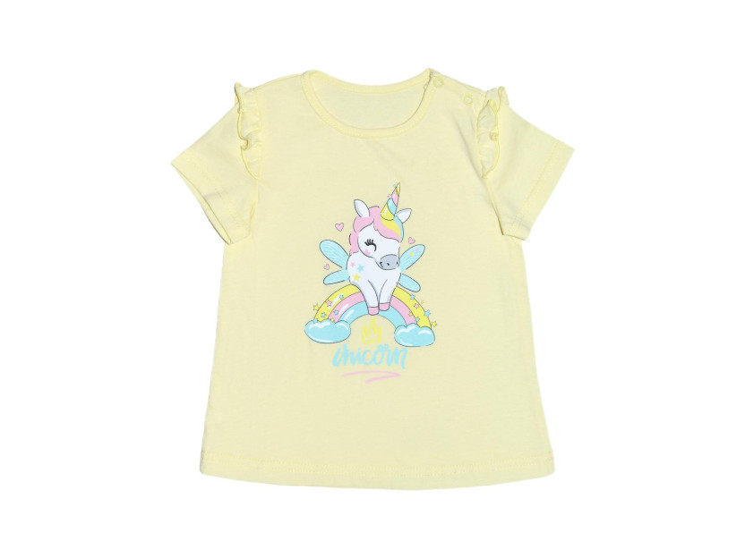 Кулирное полотно: 100% х/б. Фуфайка- силуэт трапеция,короткий втачной рукав,в пройме рюша.Горловина окантована,застежка в плечевом шве на кнопки.Печать на переде.
