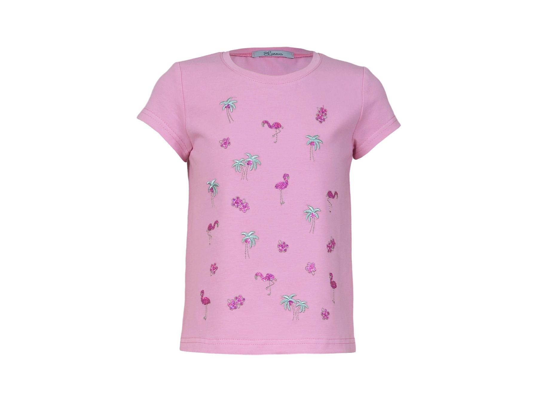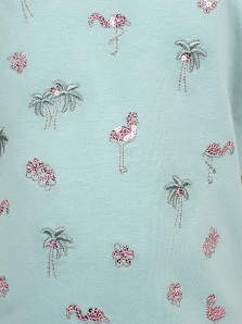 Кулирное полотно: 95% х/б,5% лайкра. Фуфайка-полуприлегающий силуэт,вышивка(пайетки)на переде.Горловина обработана притачной планкой.Рукав короткий втачной.Низ рукава и изделия подшит.