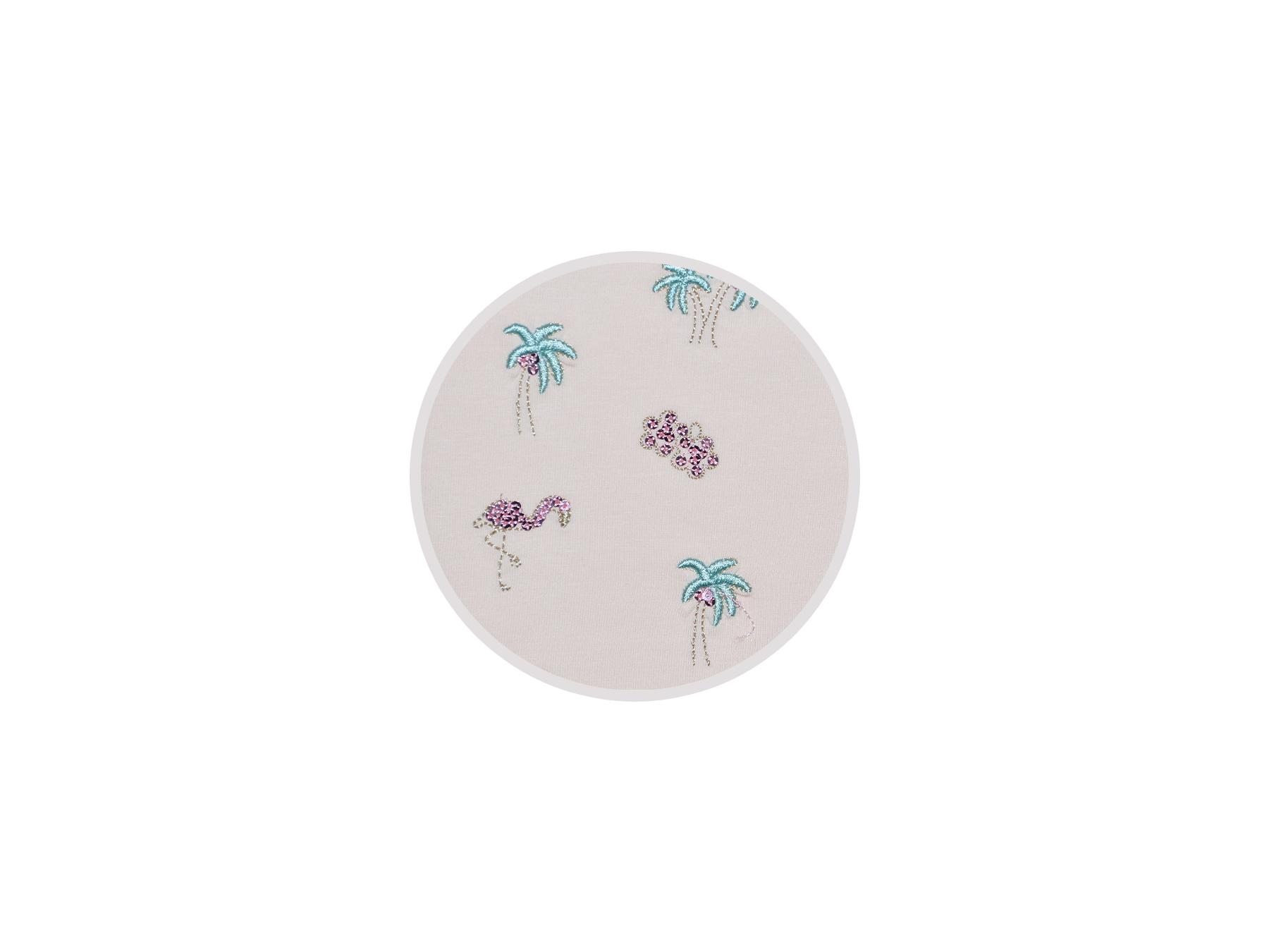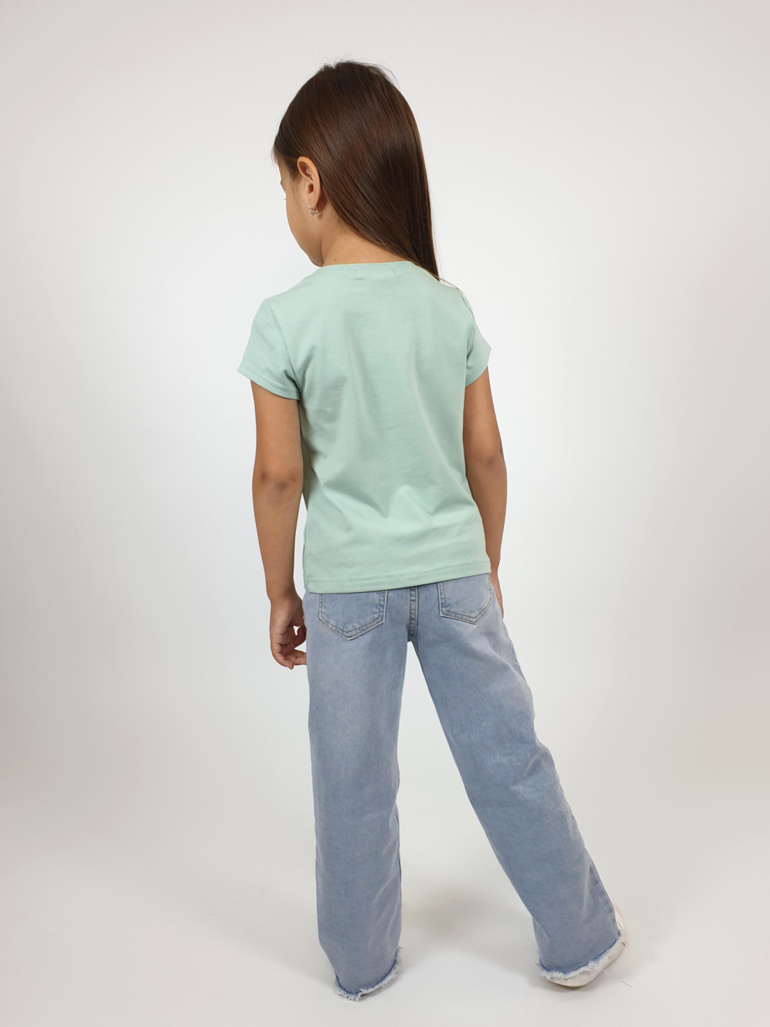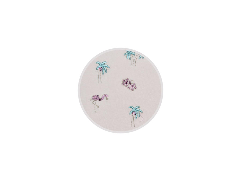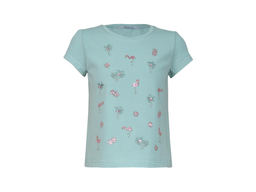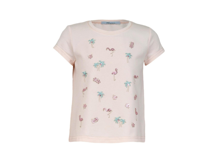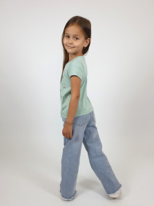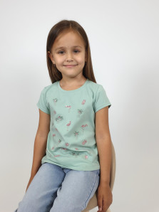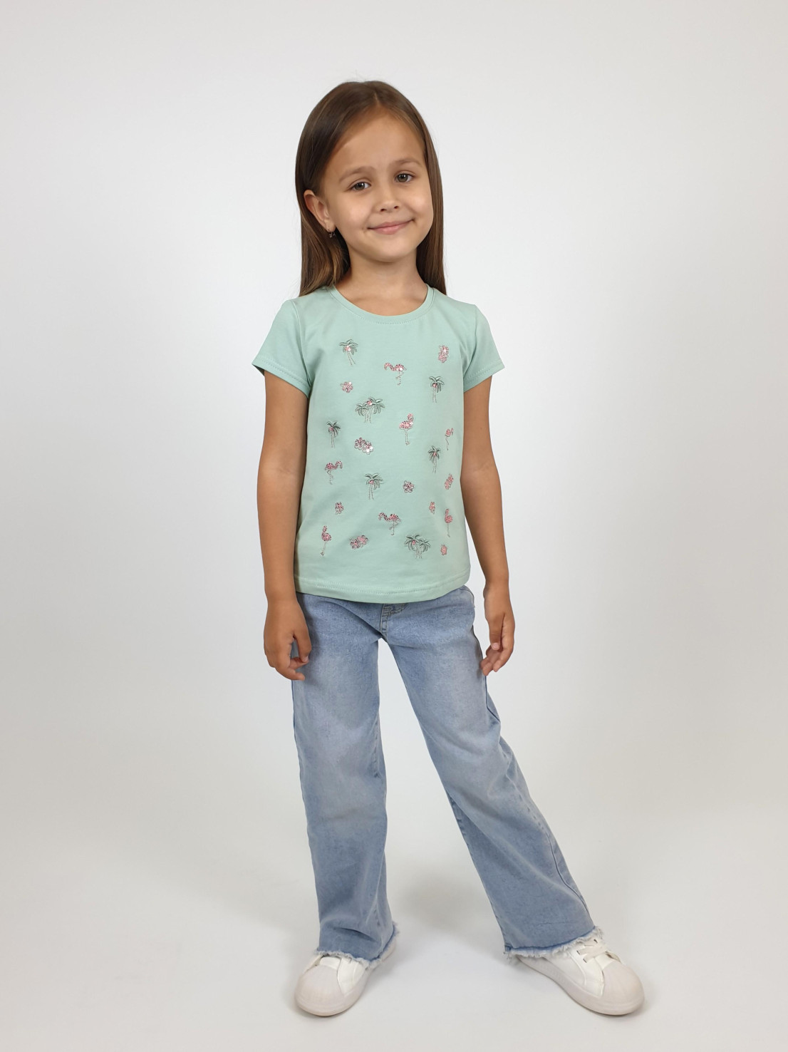 Кулирное полотно: 95% х/б,5% лайкра. Фуфайка-полуприлегающий силуэт,вышивка(пайетки)на переде.Горловина обработана притачной планкой.Рукав короткий втачной.Низ рукава и изделия подшит.