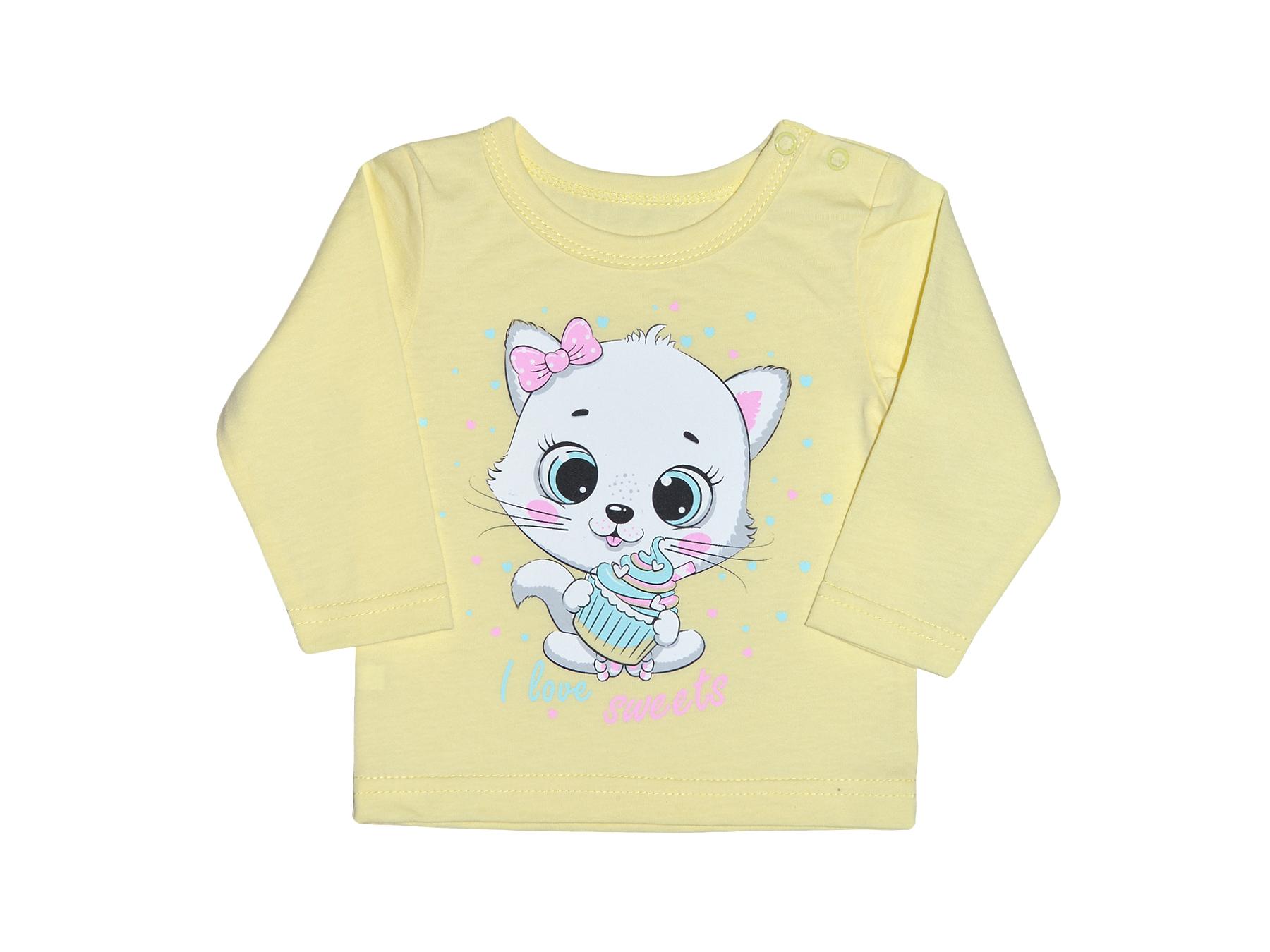 Кулирное полотно: 100% х/б. Фуфайка- прямой силуэт,длинный втачной рукав,застежка на кнопки в плечевом шве.Горловина окантована.Печать на переде.