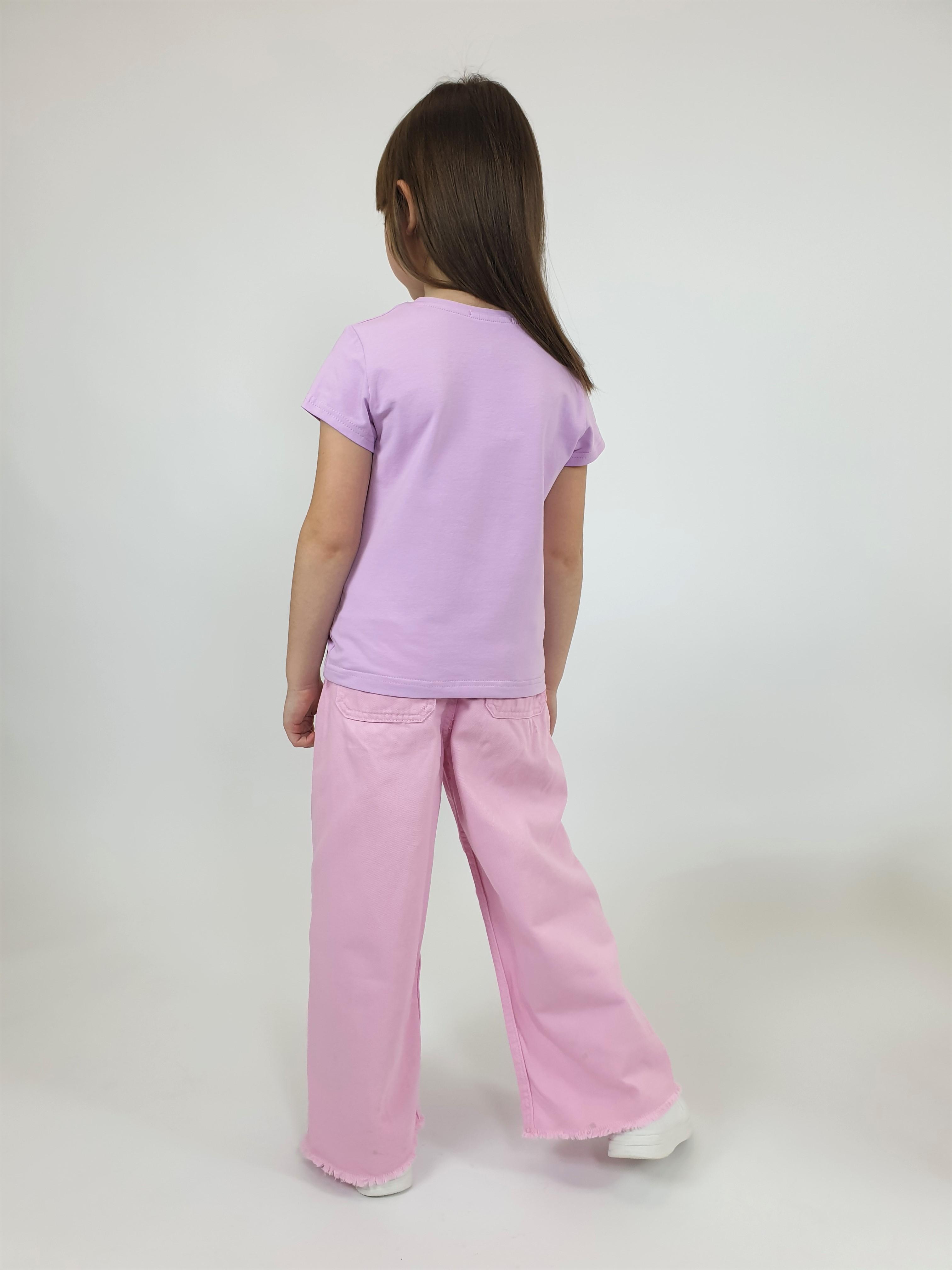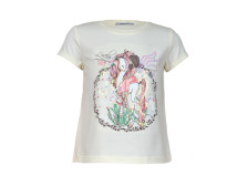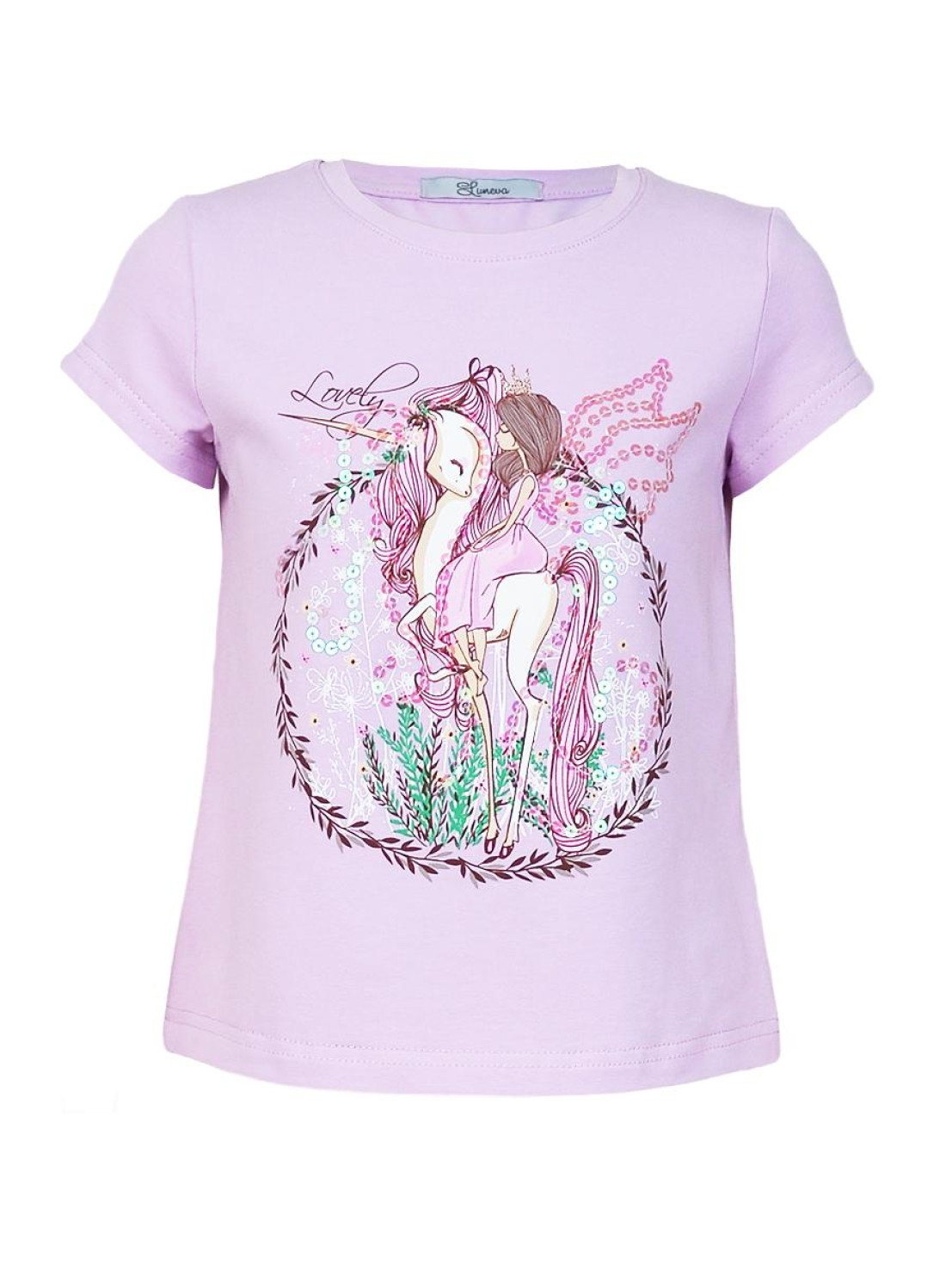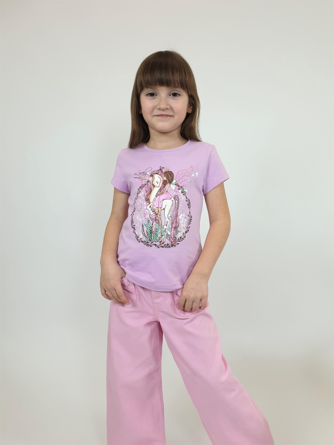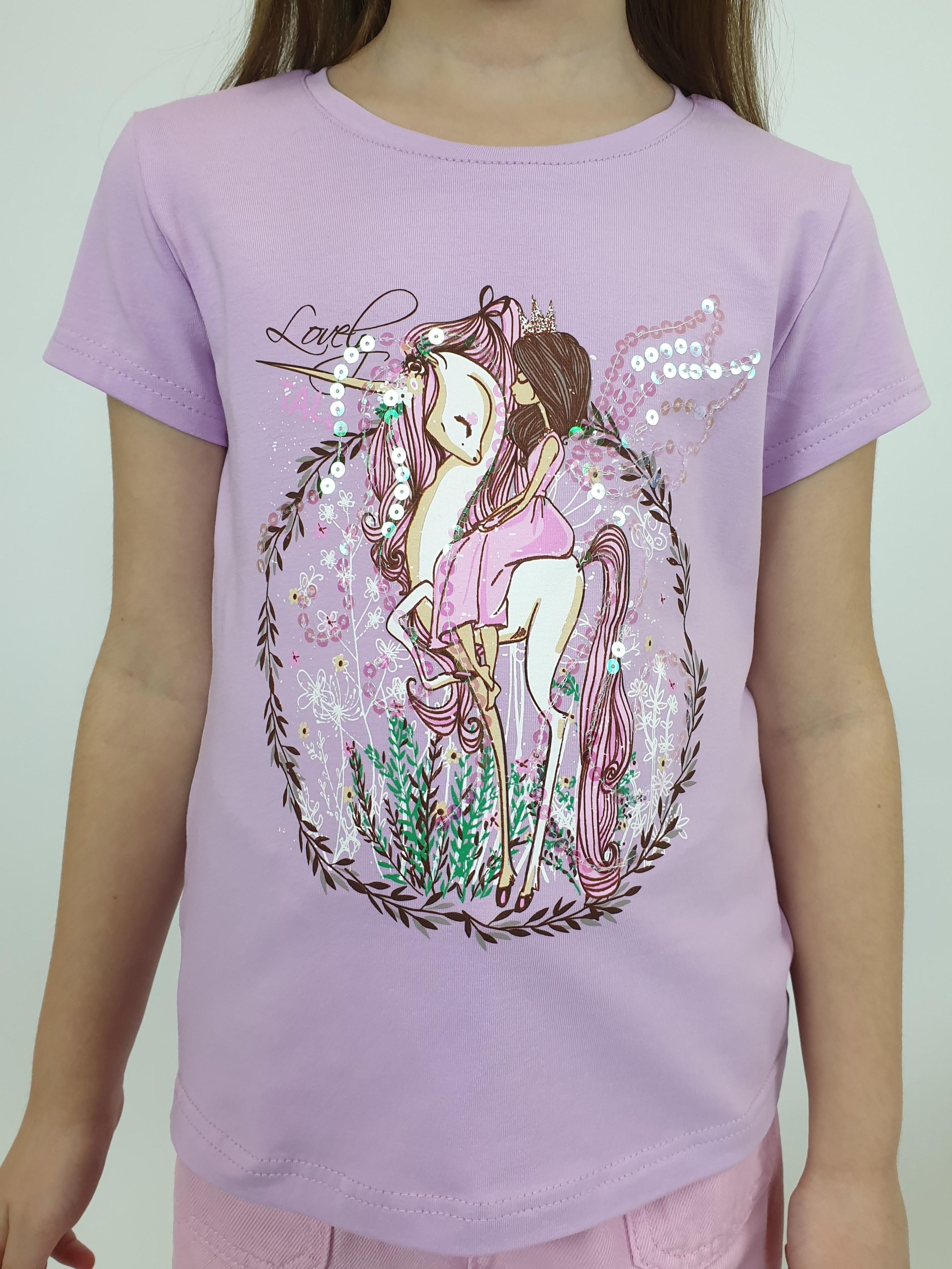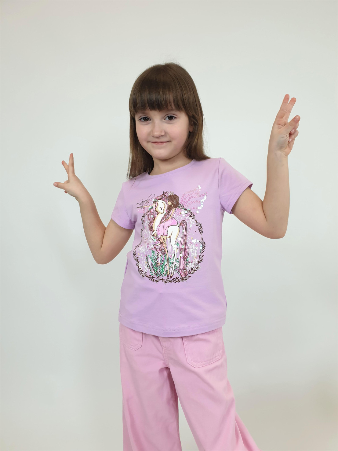 Кулирное полотно: 95% х/б,5% лайкра. Фуфайка-полуприлегающий силуэт,вышивка(пайетки) и печать на переде.Горловина обработана притачной планкой.Рукав короткий втачной.Низ рукава и низ изделия подшит.