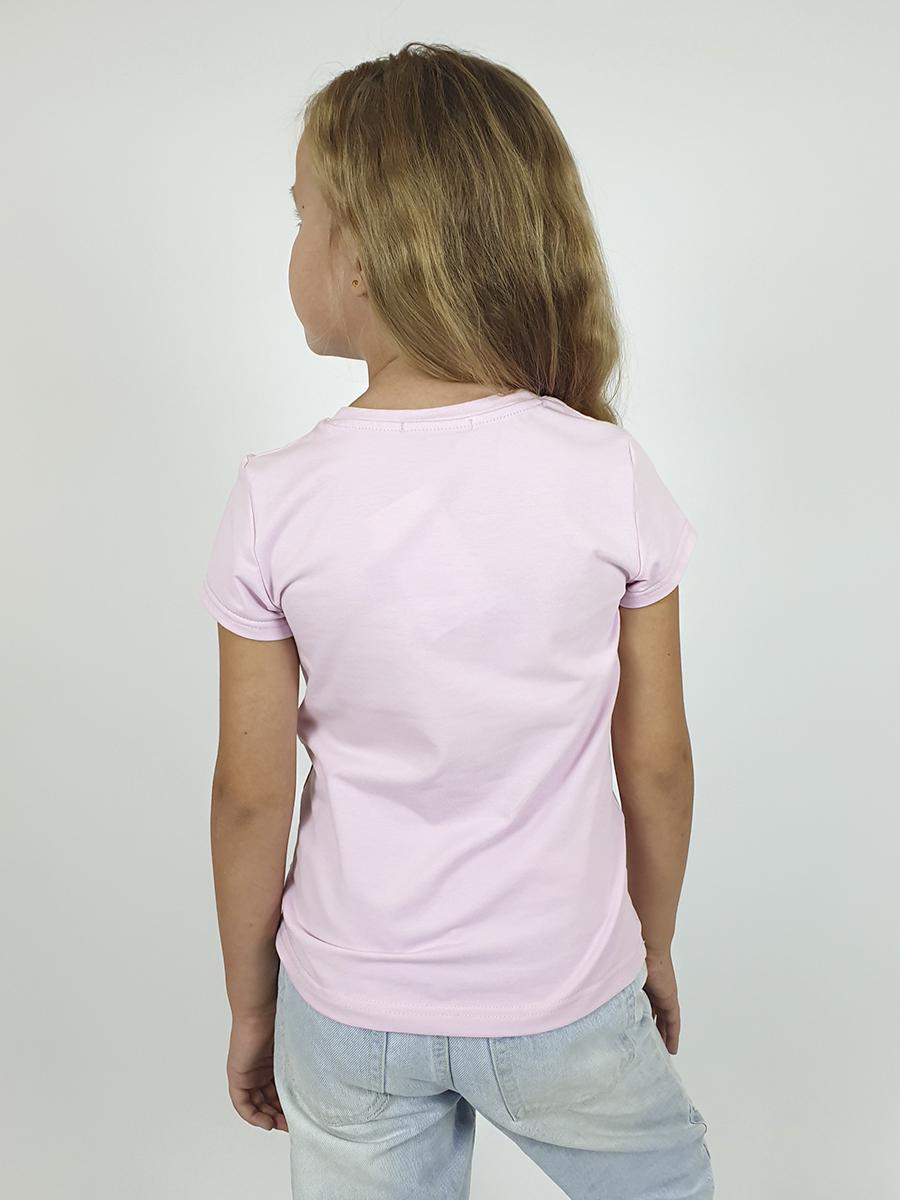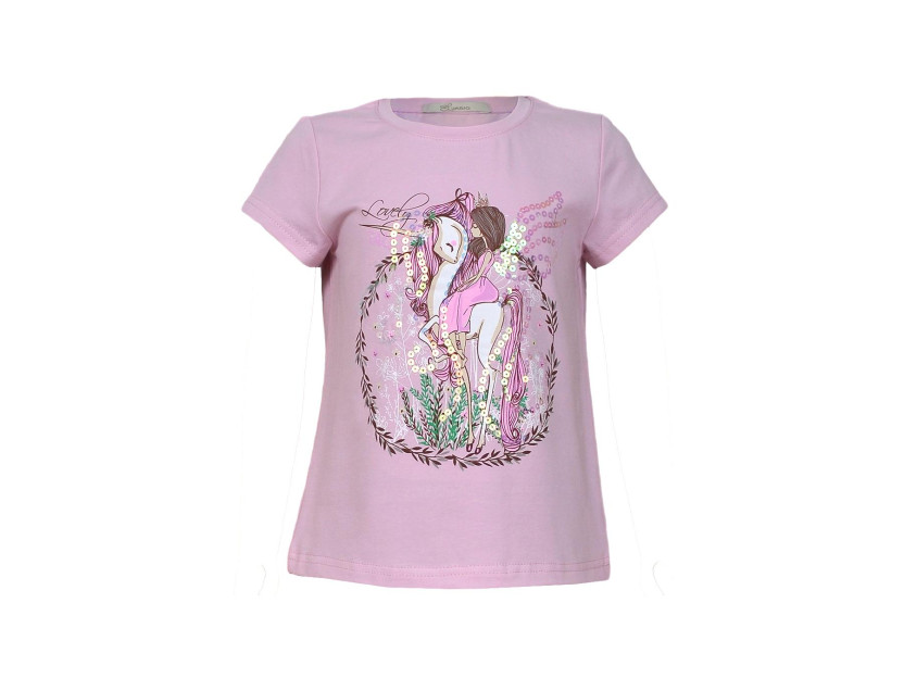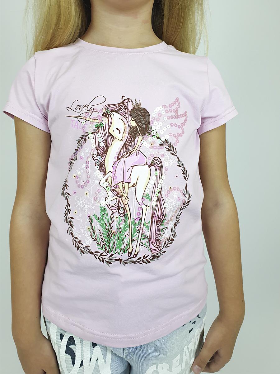 Кулирное полотно: 95% х/б,5% лайкра. Фуфайка-полуприлегающий силуэт,вышивка(пайетки) и печать на переде.Горловина обработана притачной планкой.Рукав короткий втачной.Низ рукава и низ изделия подшит.