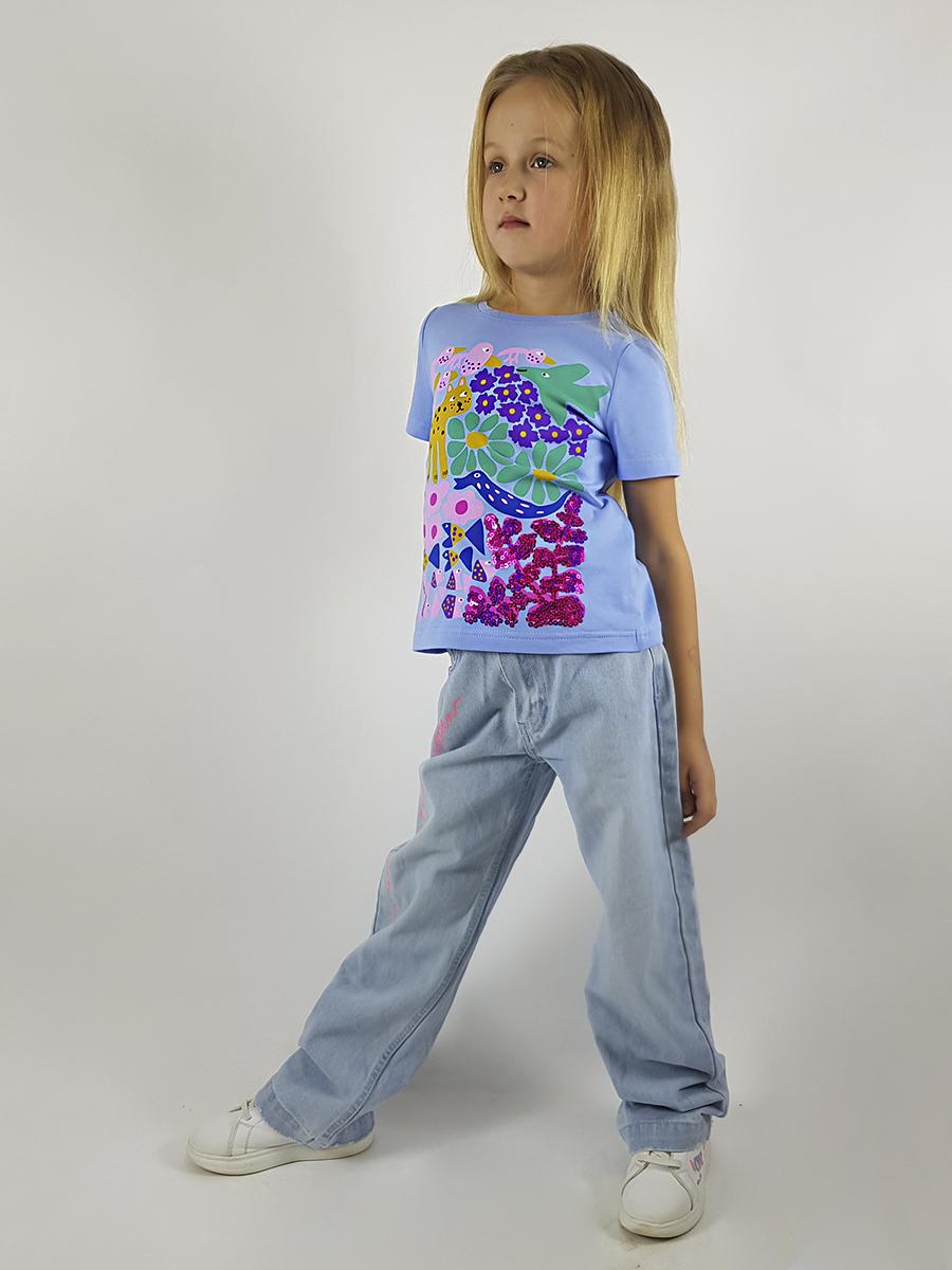 Кулирное полотно: 100% х/б. Фуфайка-прямой силуэт,печать и вышивка(пайетки)на переде,короткий втачной рукав.Низ рукава и фуфайки подшит.Горловина обработана ластиком.