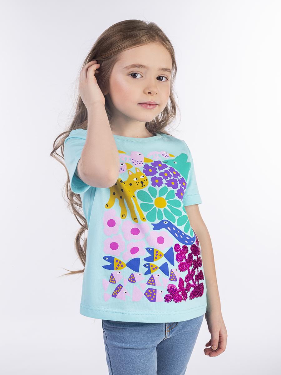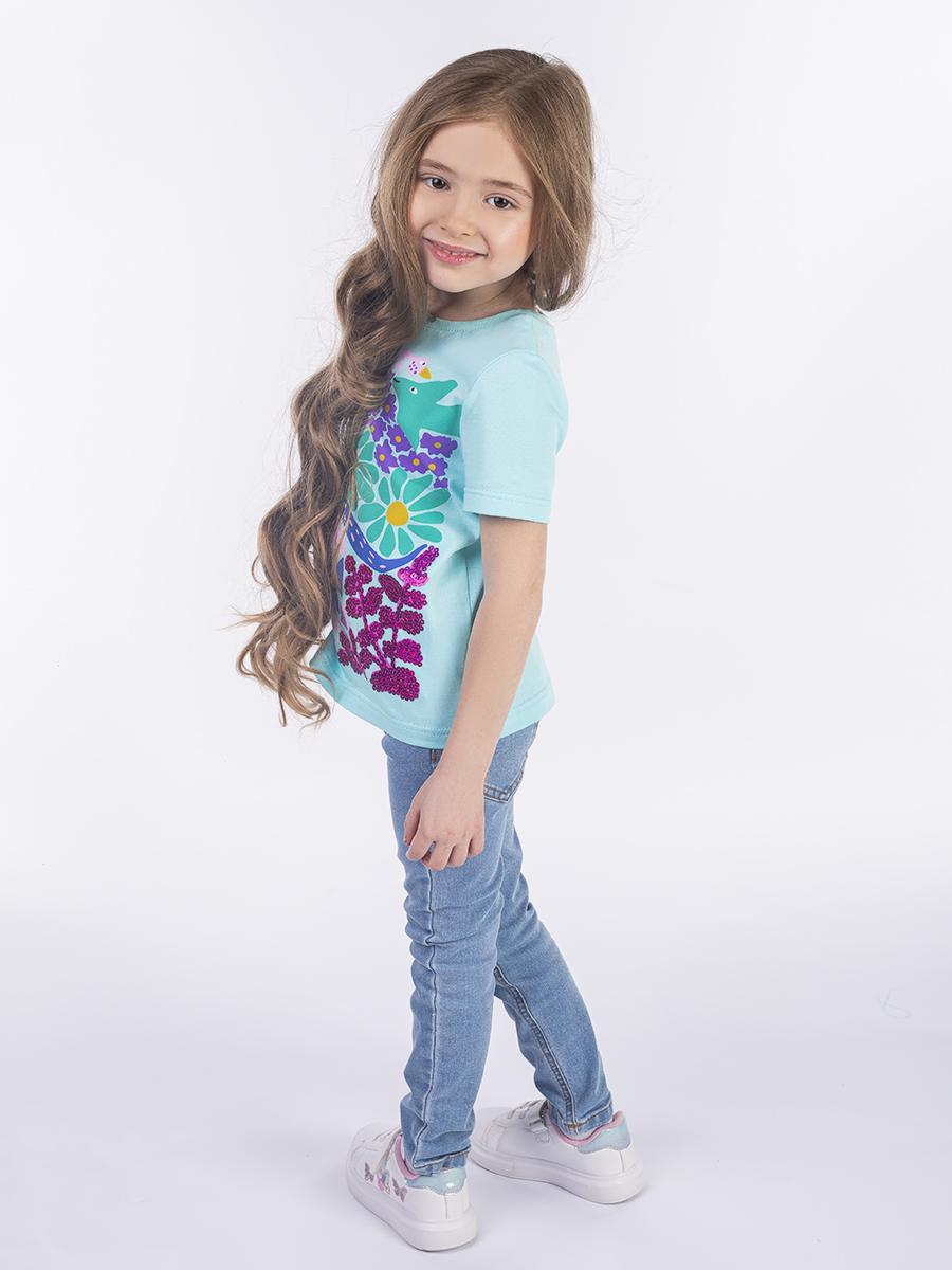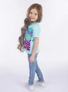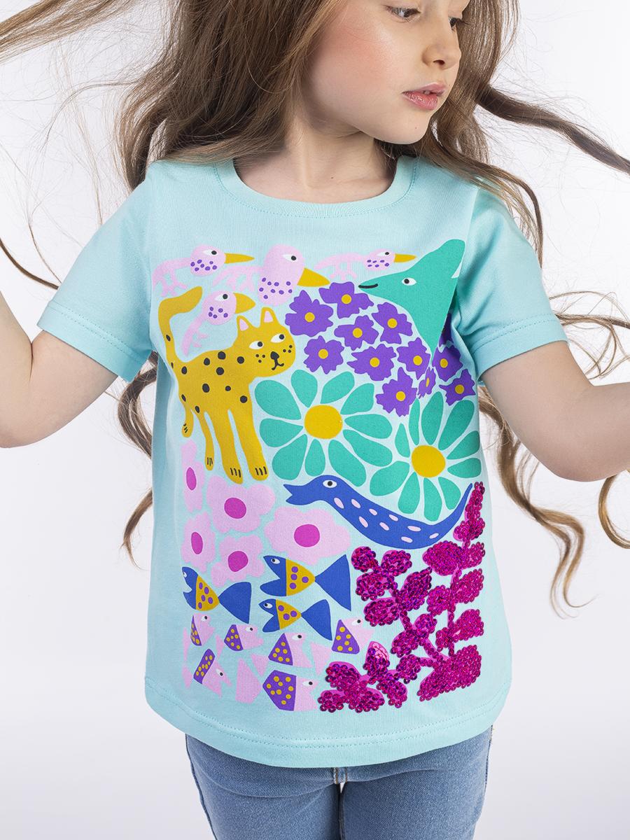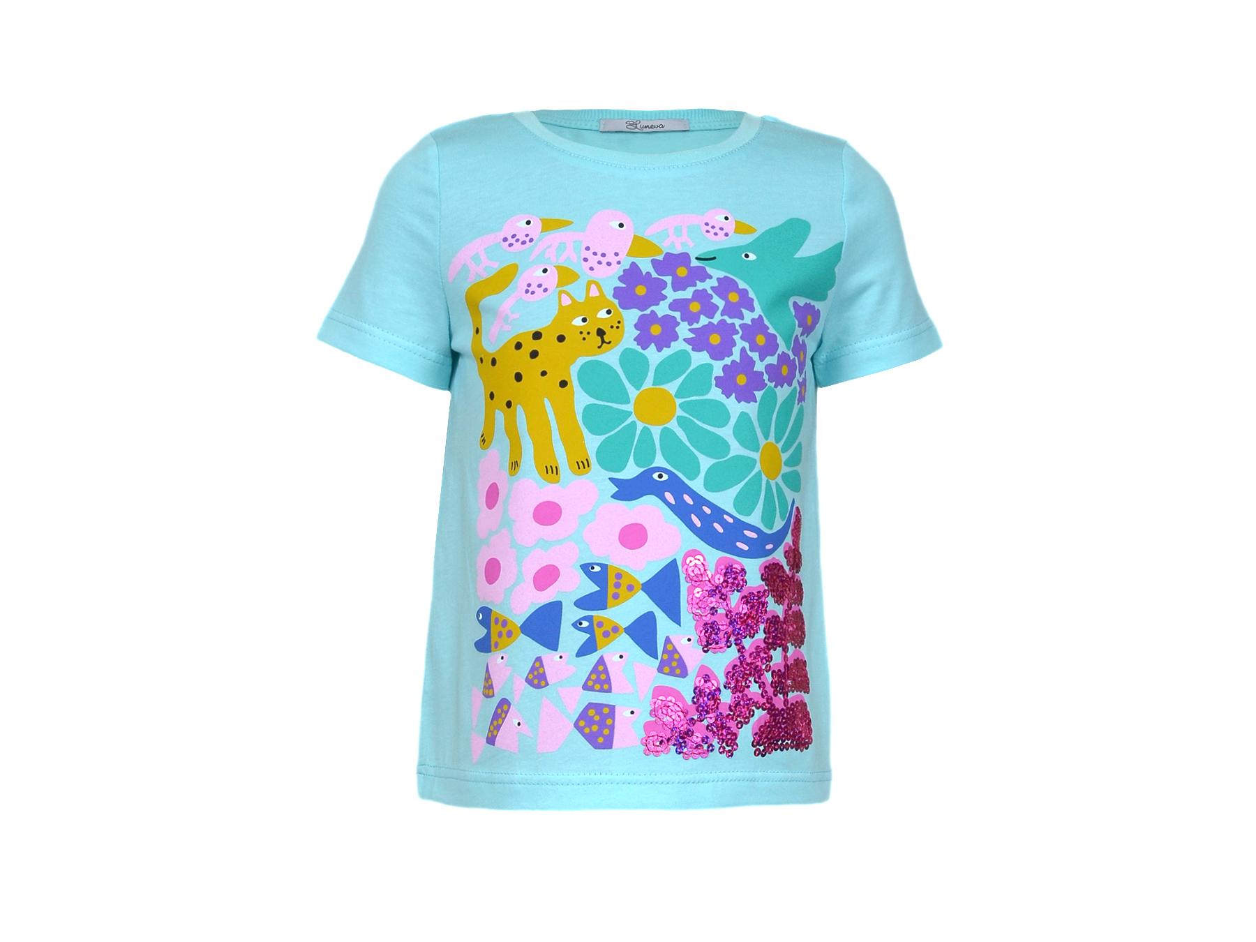 Кулирное полотно: 100% х/б. Фуфайка-прямой силуэт,печать и вышивка(пайетки)на переде,короткий втачной рукав.Низ рукава и фуфайки подшит.Горловина обработана ластиком.