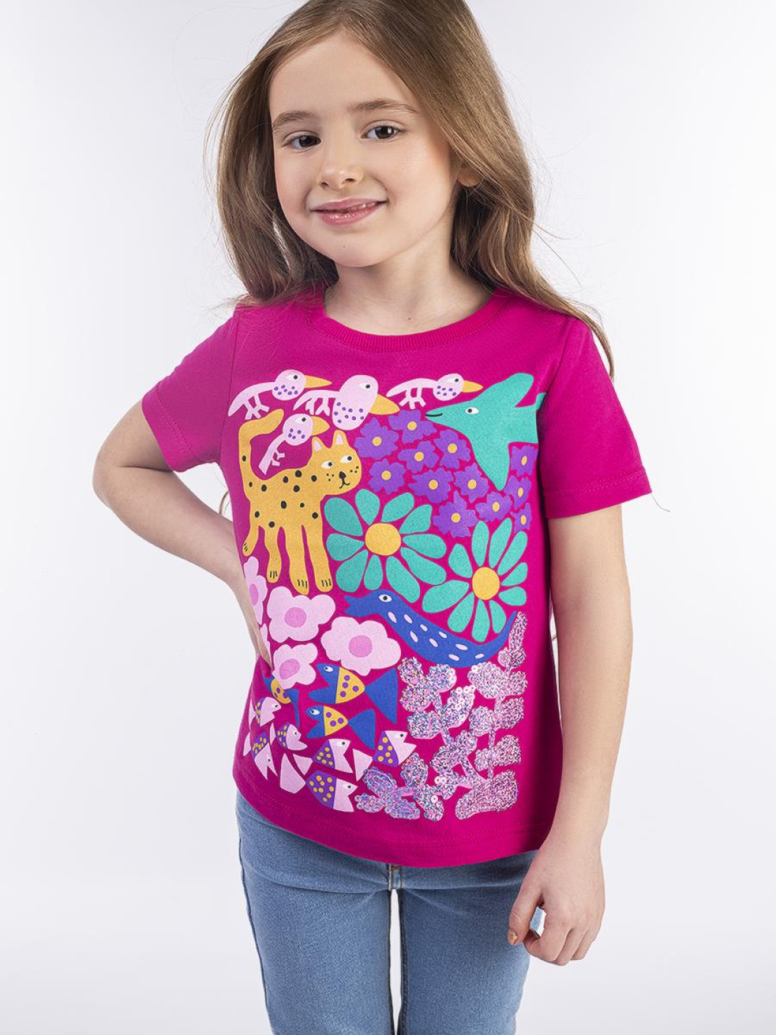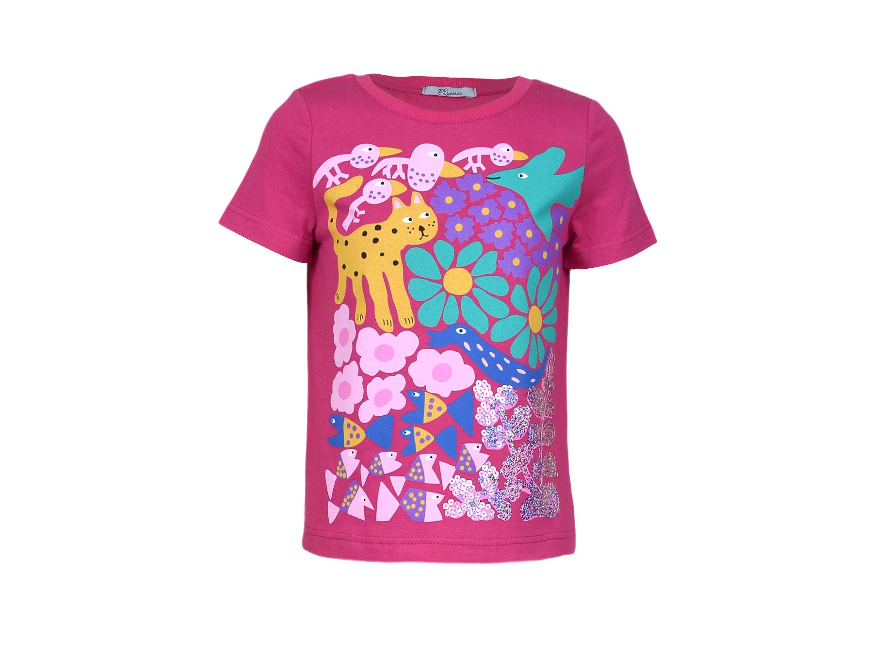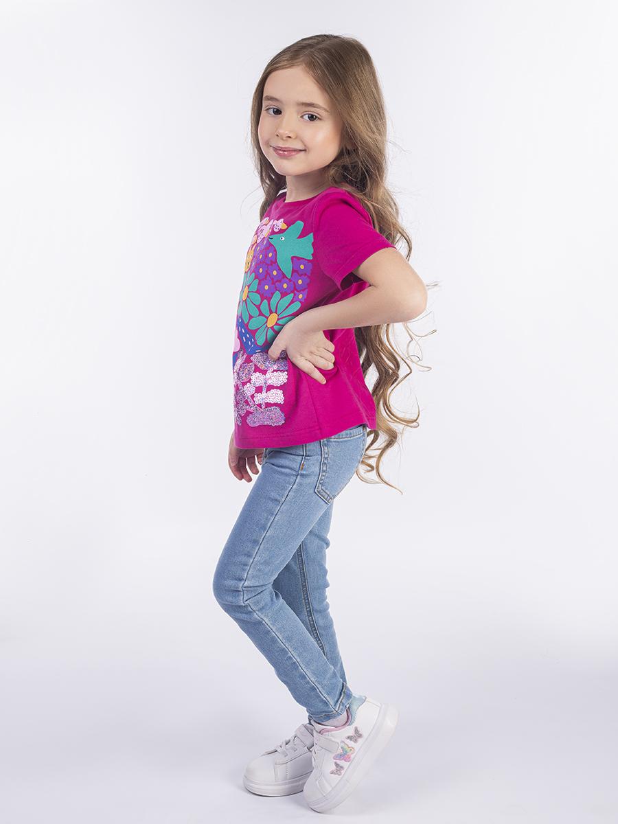 Кулирное полотно: 100% х/б. Фуфайка-прямой силуэт,печать и вышивка(пайетки)на переде,короткий втачной рукав.Низ рукава и фуфайки подшит.Горловина обработана ластиком.