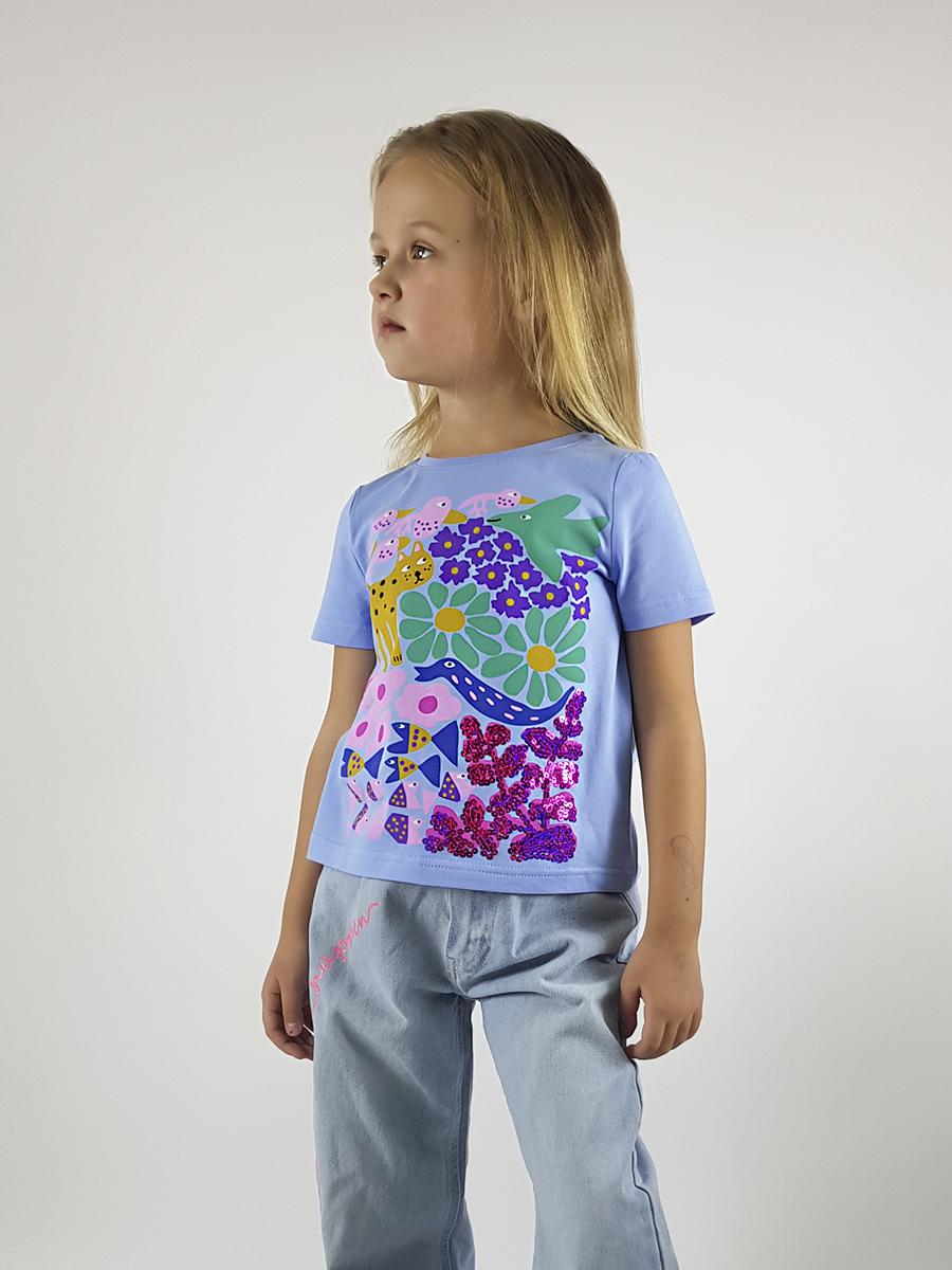 Кулирное полотно: 100% х/б. Фуфайка-прямой силуэт,печать и вышивка(пайетки)на переде,короткий втачной рукав.Низ рукава и фуфайки подшит.Горловина обработана ластиком.