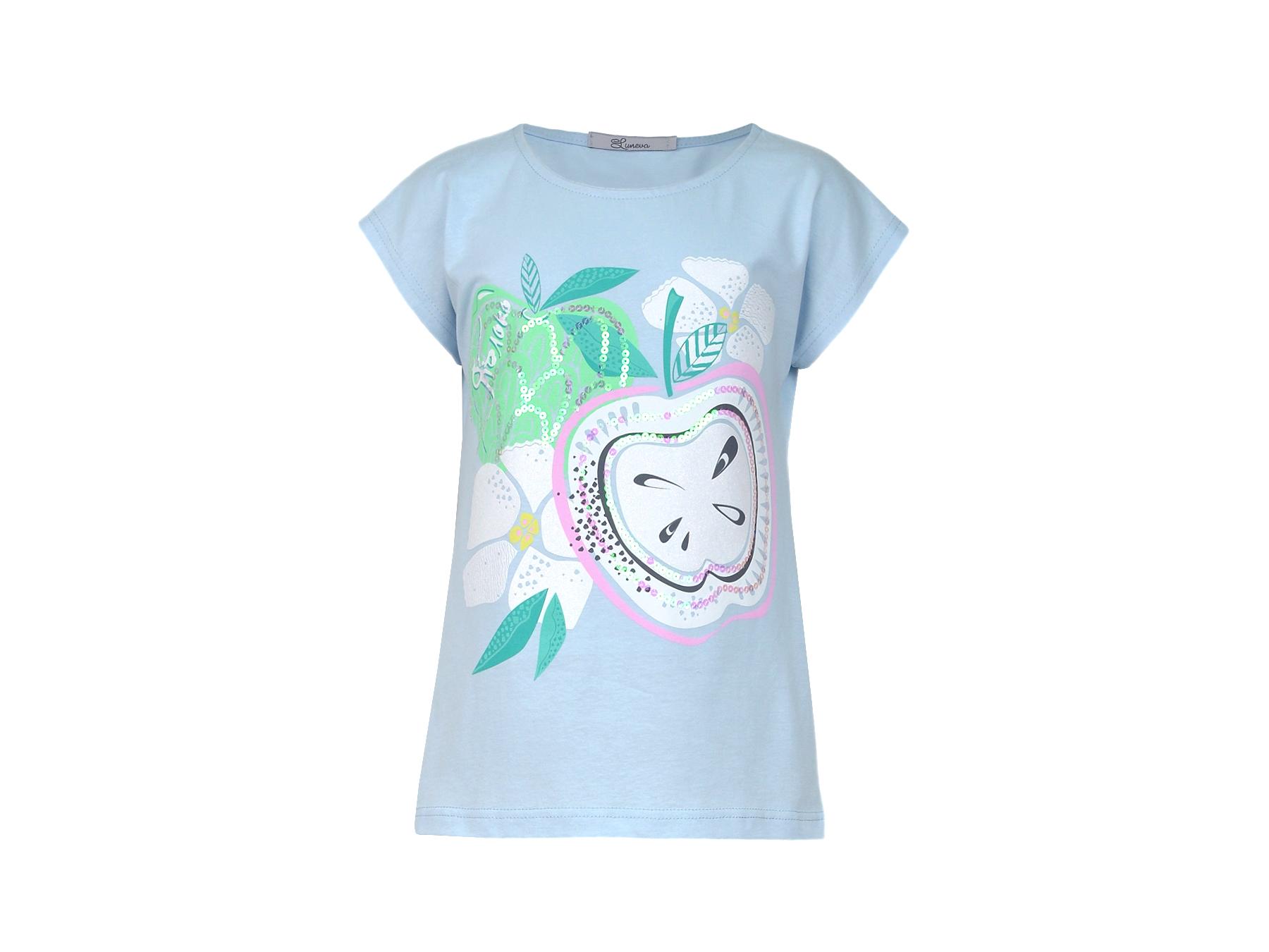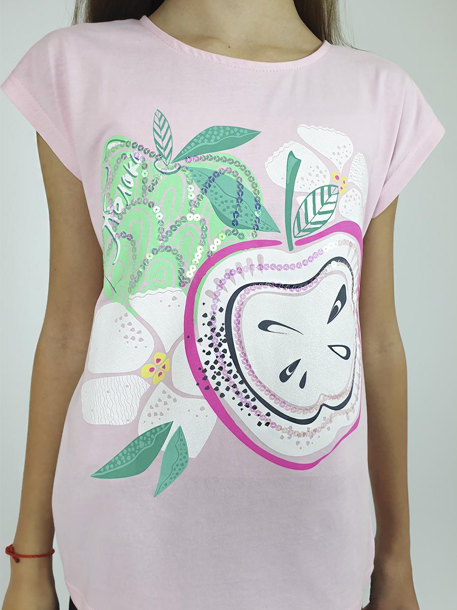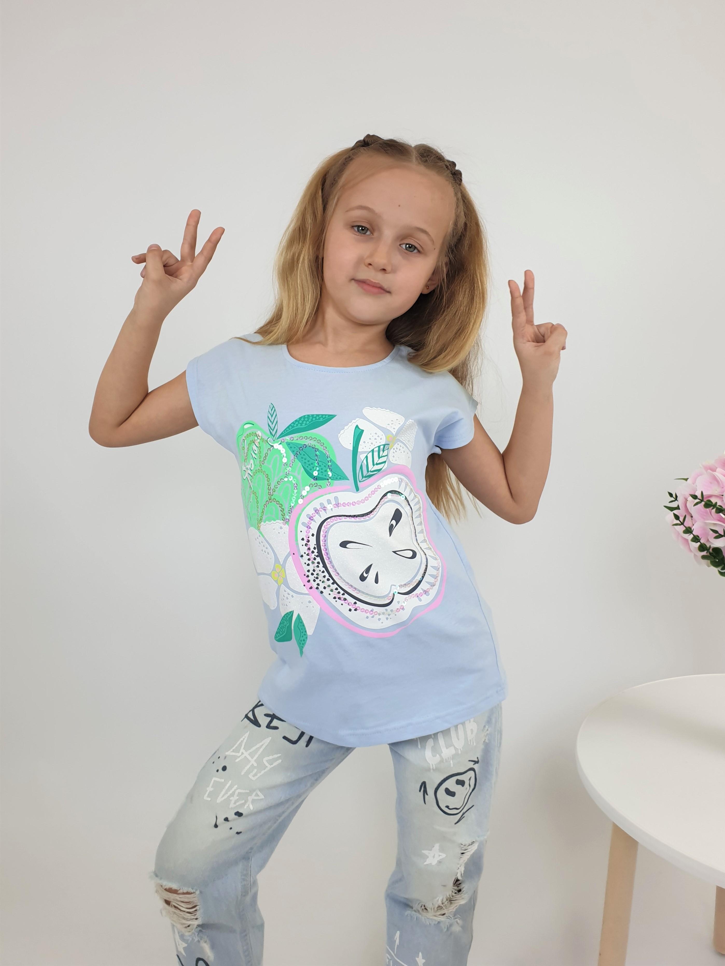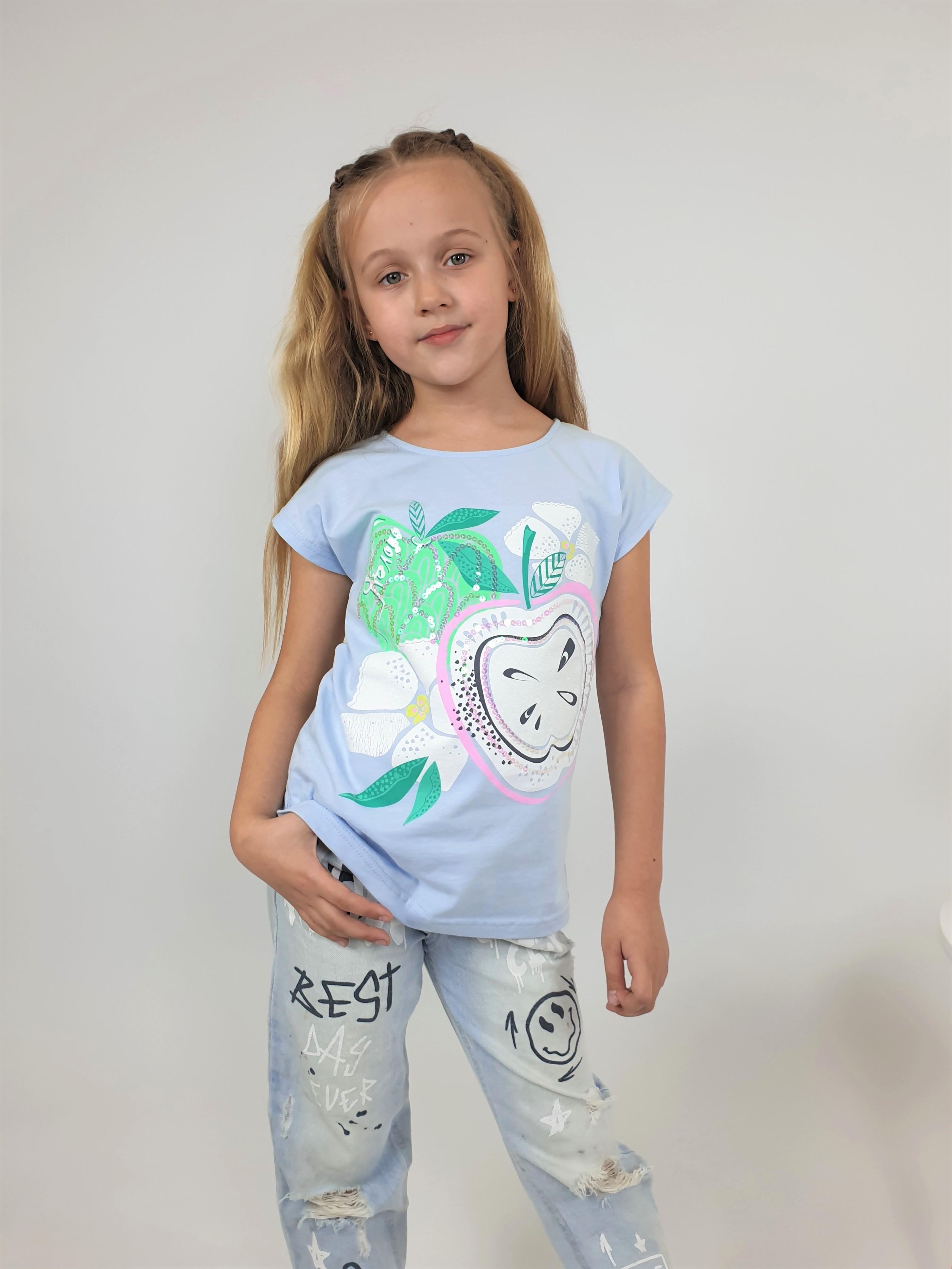 Кулирное полотно:100% х/б. Фуфайка-полуприлегающего силуэта с цельнокроеным рукавом.Перед с печатью и вышивкой(пайетки).Горловина окантована и подшита.