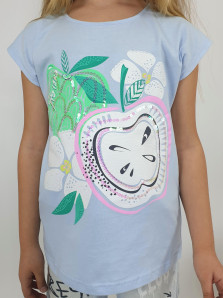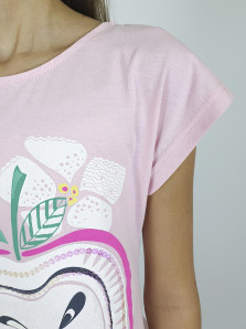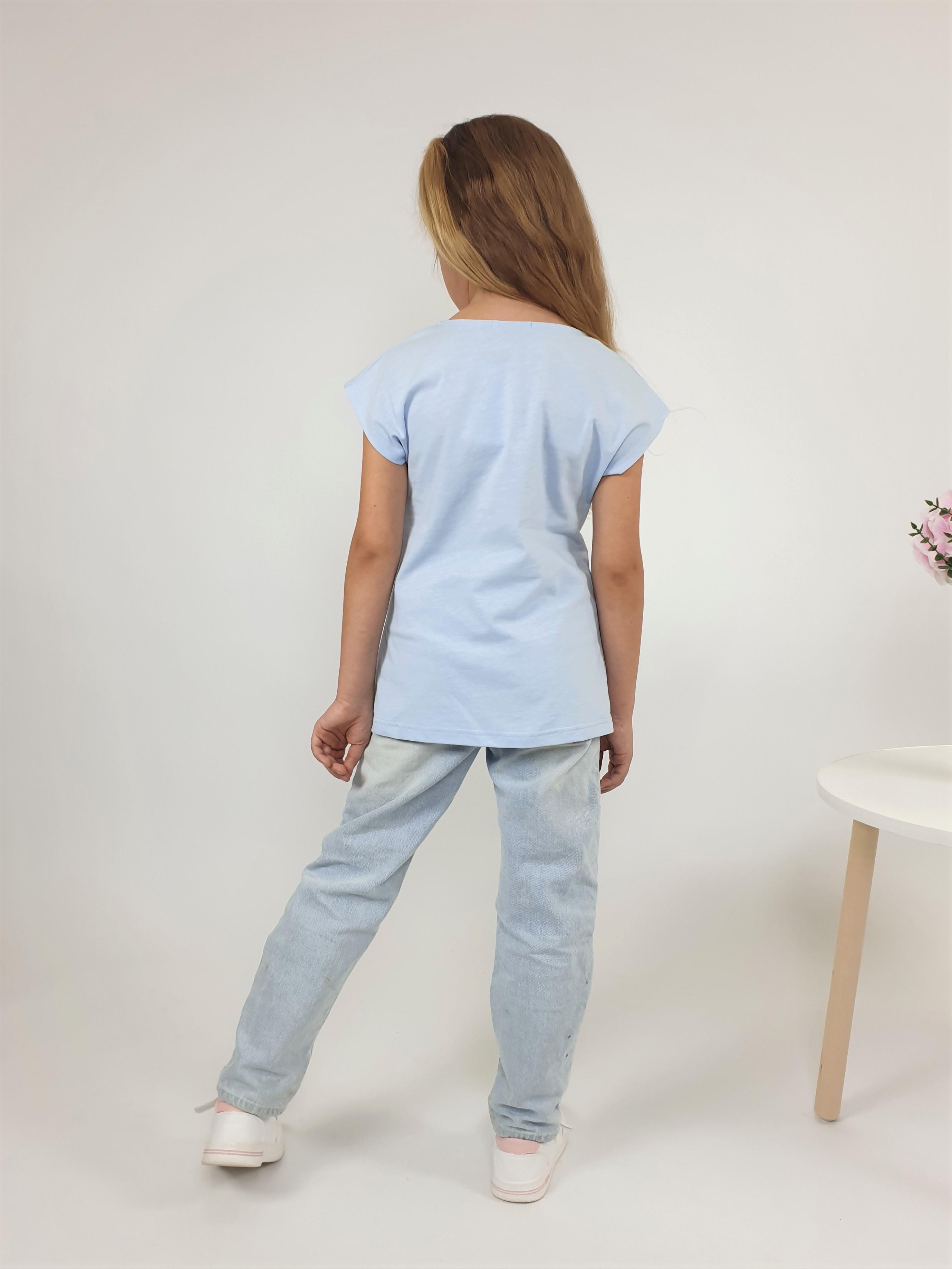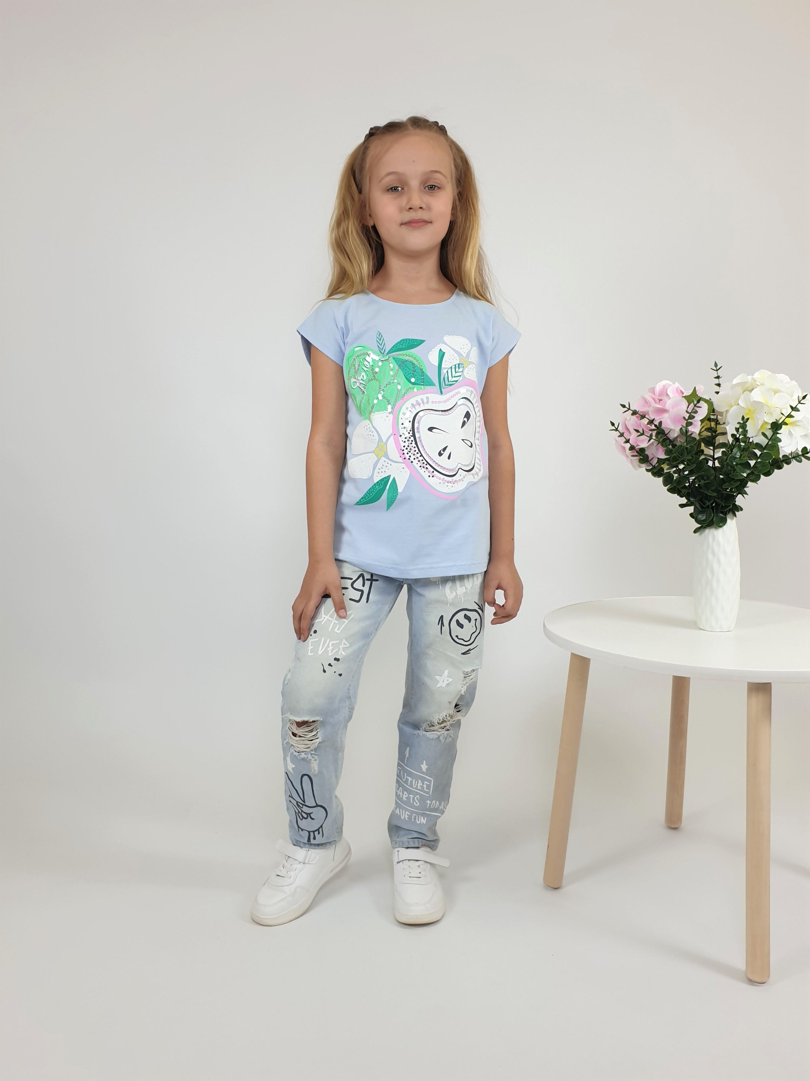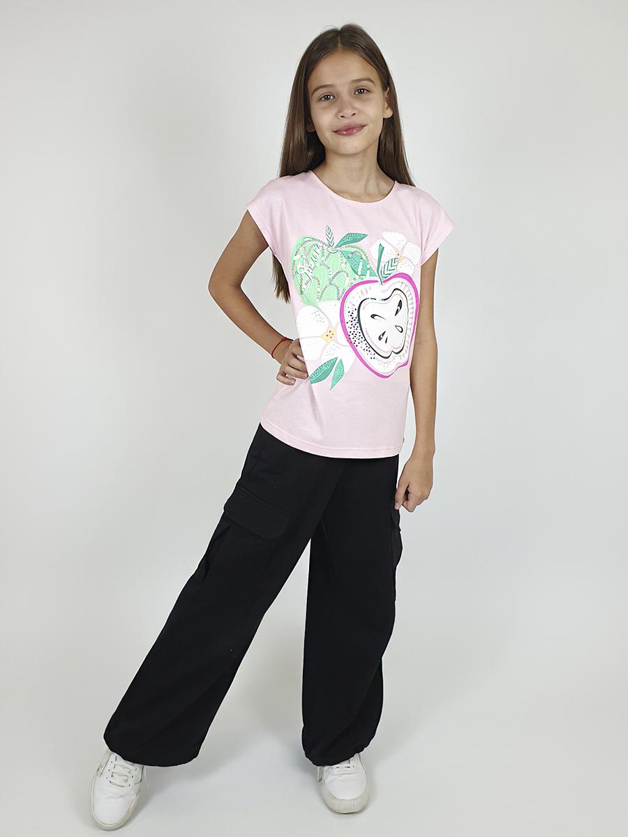 Кулирное полотно:100% х/б. Фуфайка-полуприлегающего силуэта с цельнокроеным рукавом.Перед с печатью и вышивкой(пайетки).Горловина окантована и подшита.