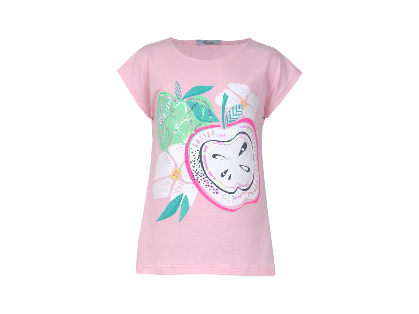 Кулирное полотно:100% х/б. Фуфайка-полуприлегающего силуэта с цельнокроеным рукавом.Перед с печатью и вышивкой(пайетки).Горловина окантована и подшита.