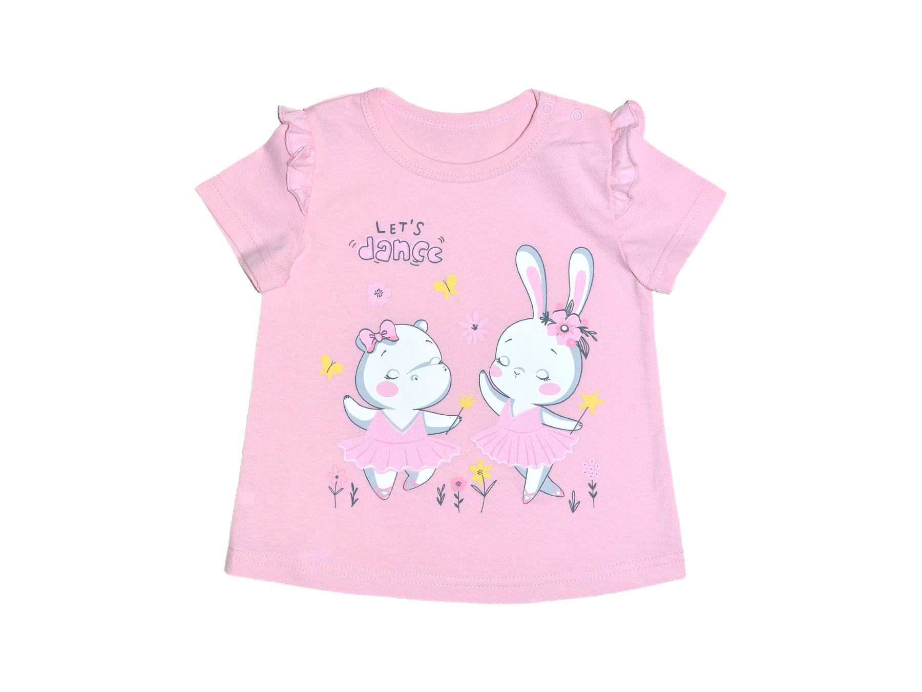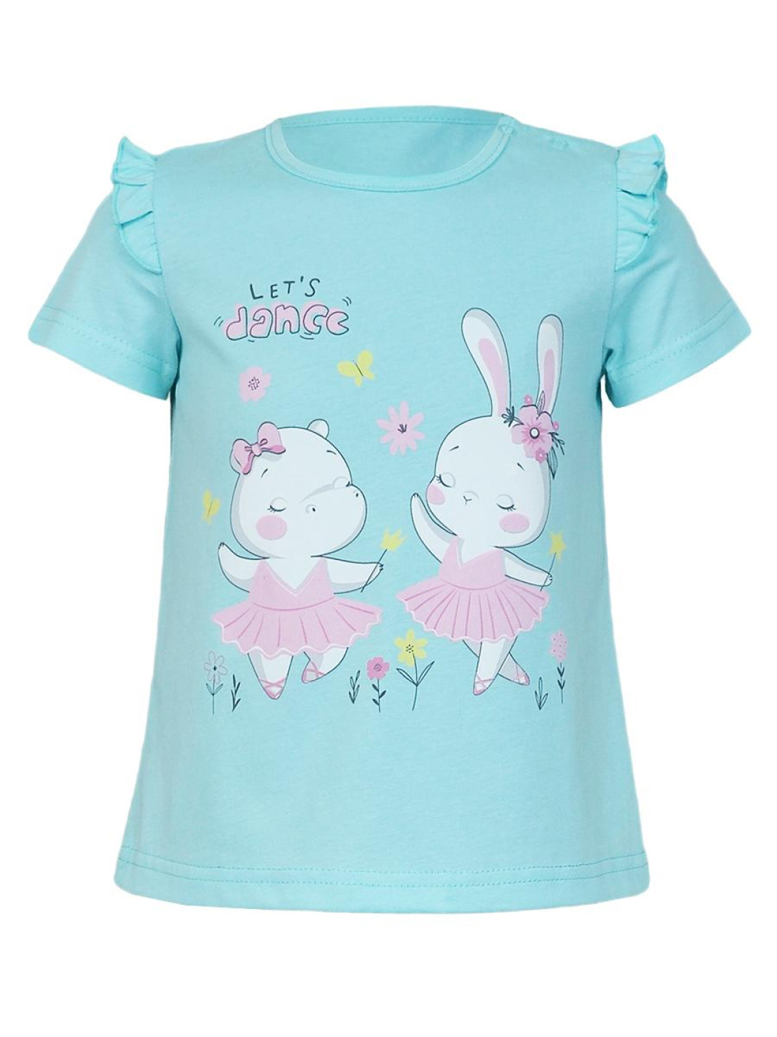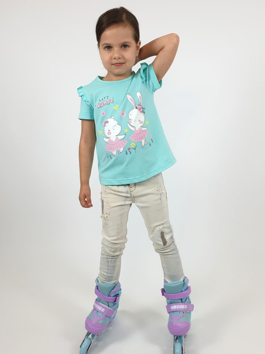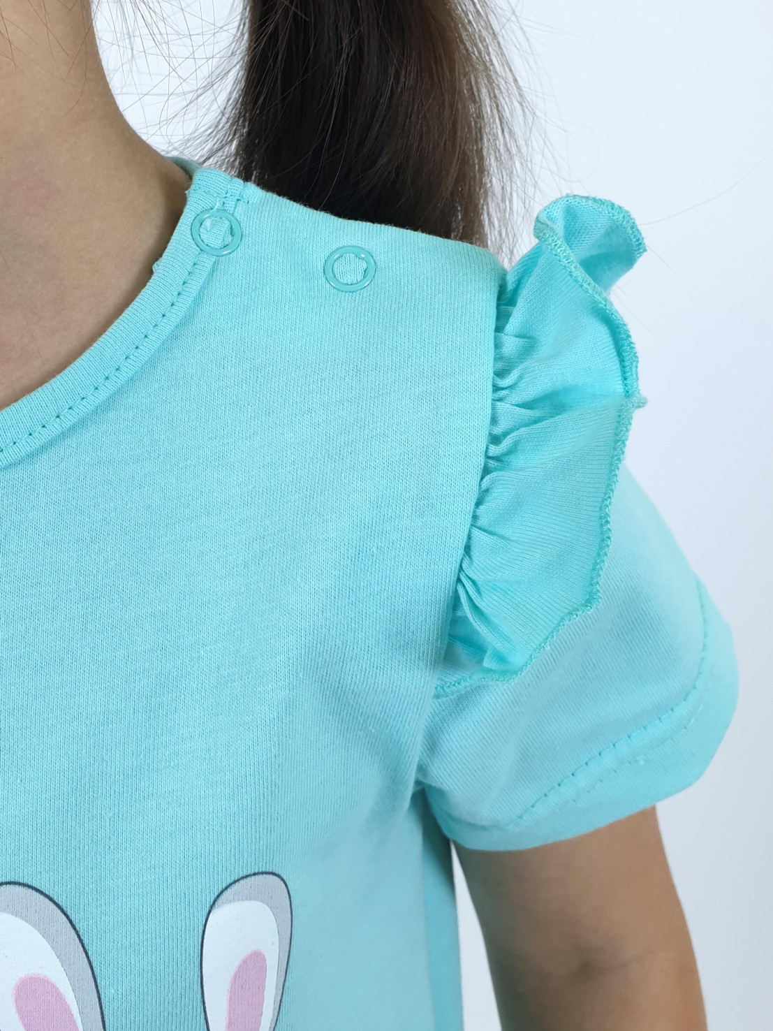 Кулирное полотно: 100% х/б. Фуфайка-силуэт трапеция,короткий втачной рукав,в пройме рюша..Горловина окантована,застежка в плечевом шве на кнопки.Печать на переде.