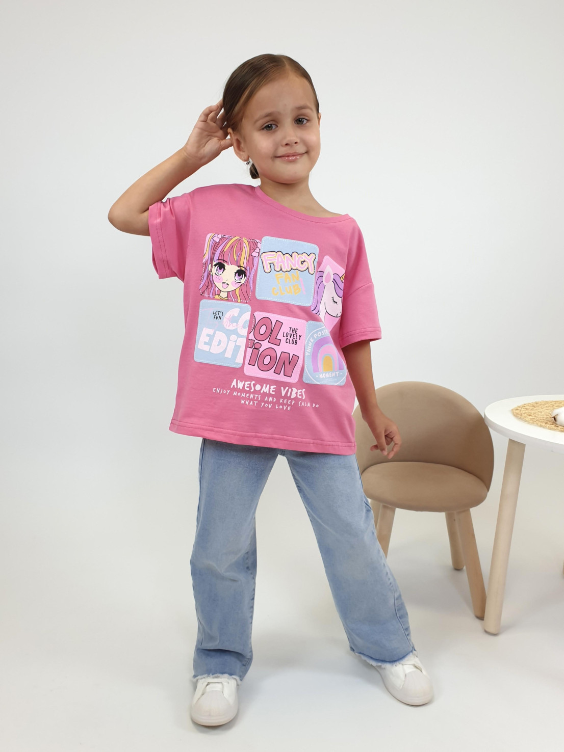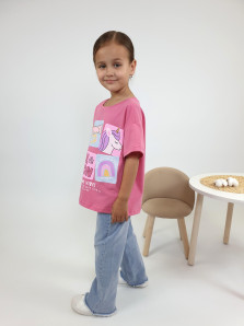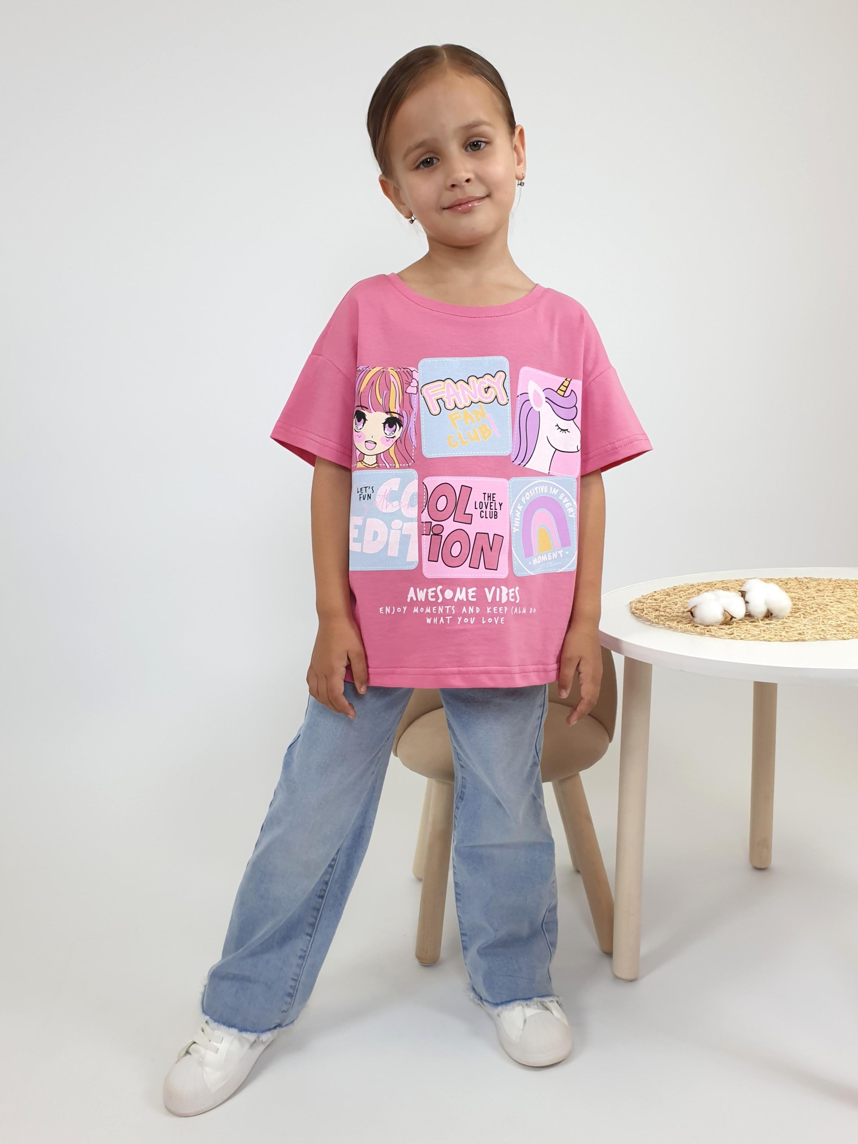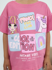 Кулирное полотно:100% х/б. Фуфайка(оверсайз)-спущенное плечо,короткий рукав.Печать на переде,горловина окантована планкой.