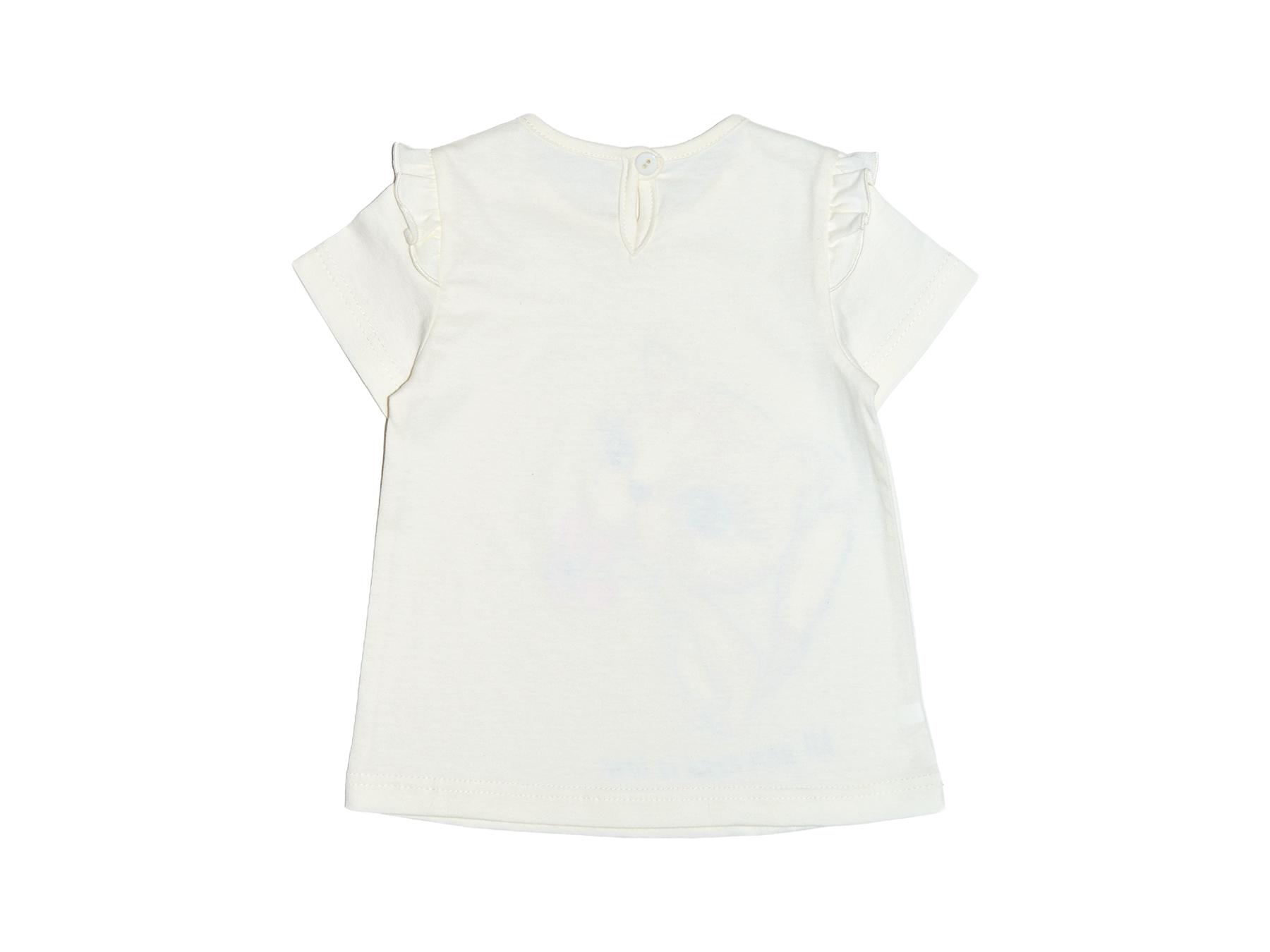 Кулирное полотно: 100% х/б. Фуфайка-силуэт трапеция,короткий втачной рукав,в пройме рюша.Горловина окантована,застежка на пуговицу по спинке.Печать на переде.