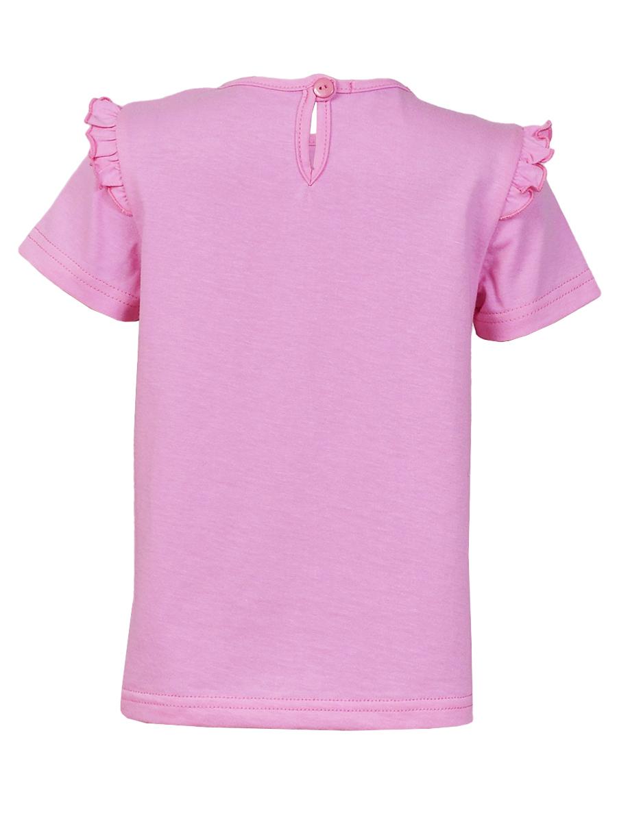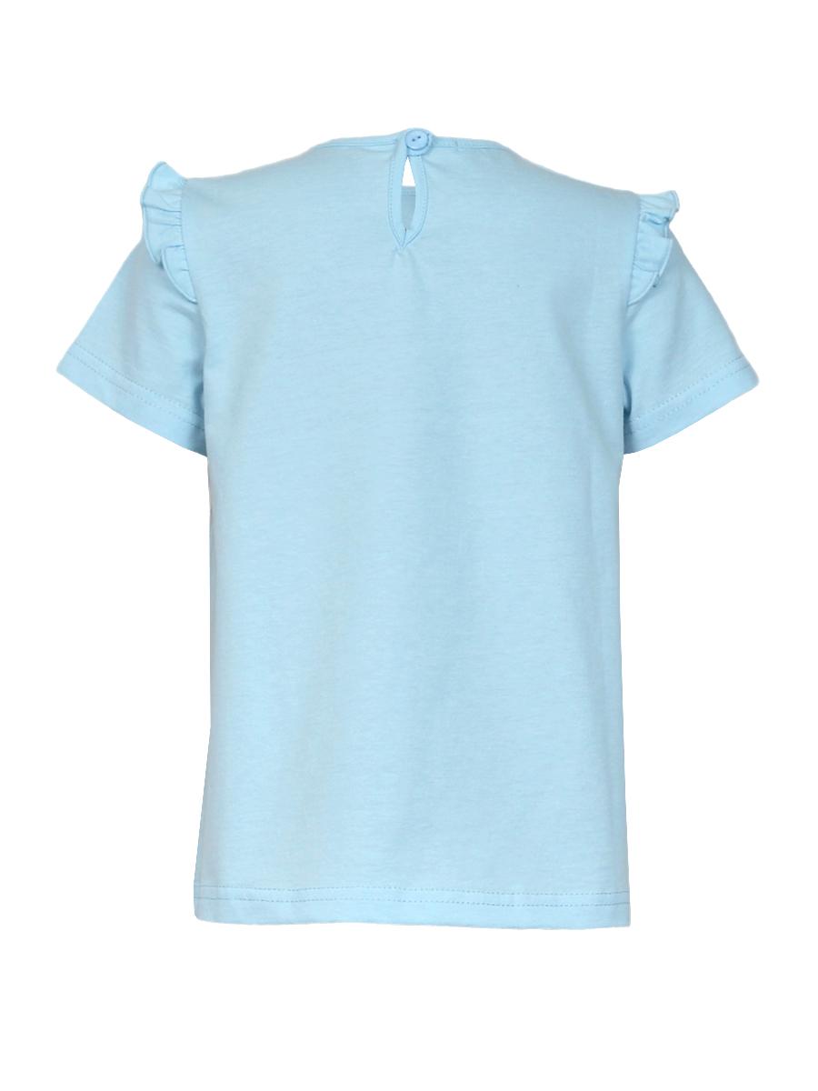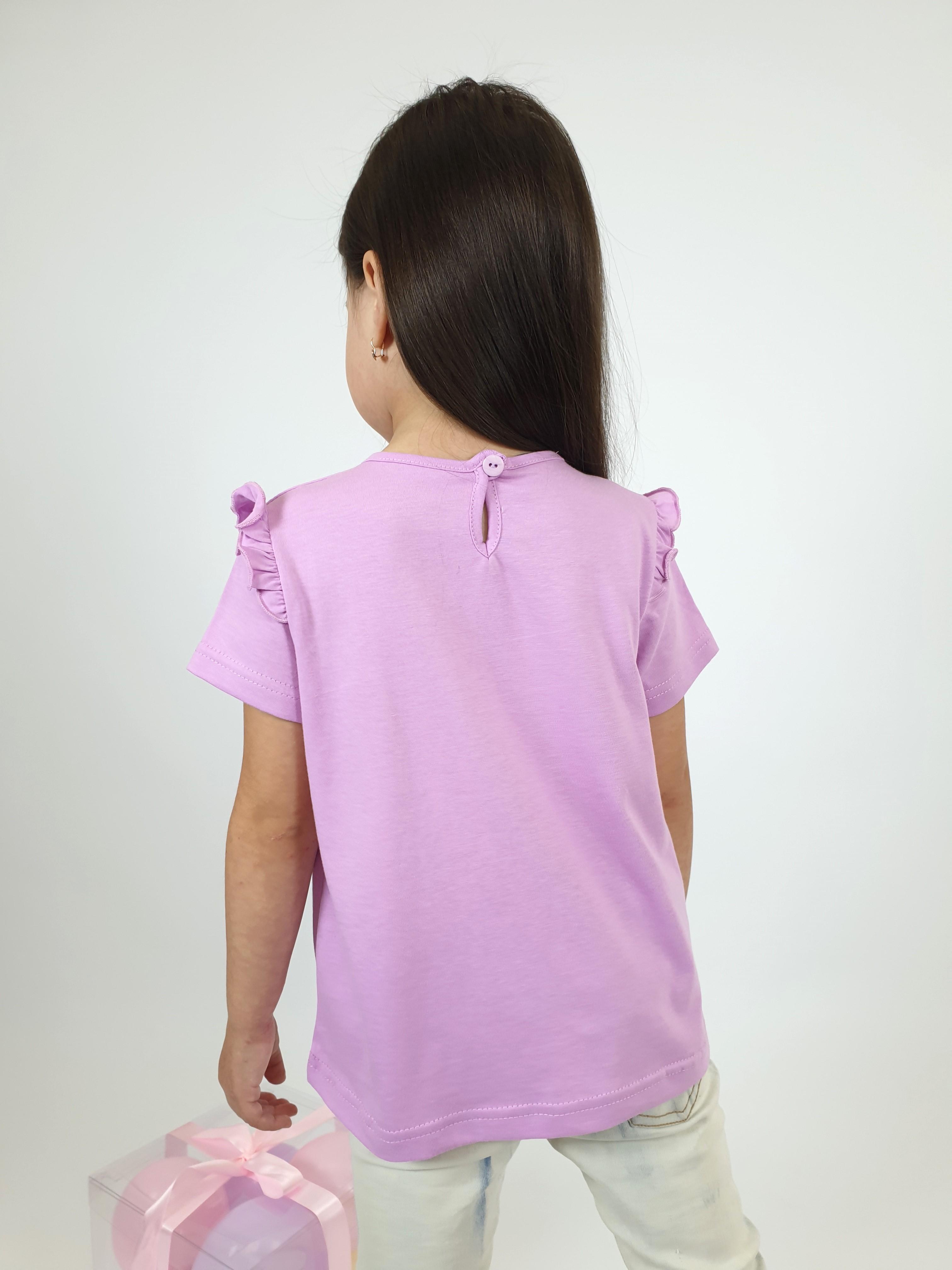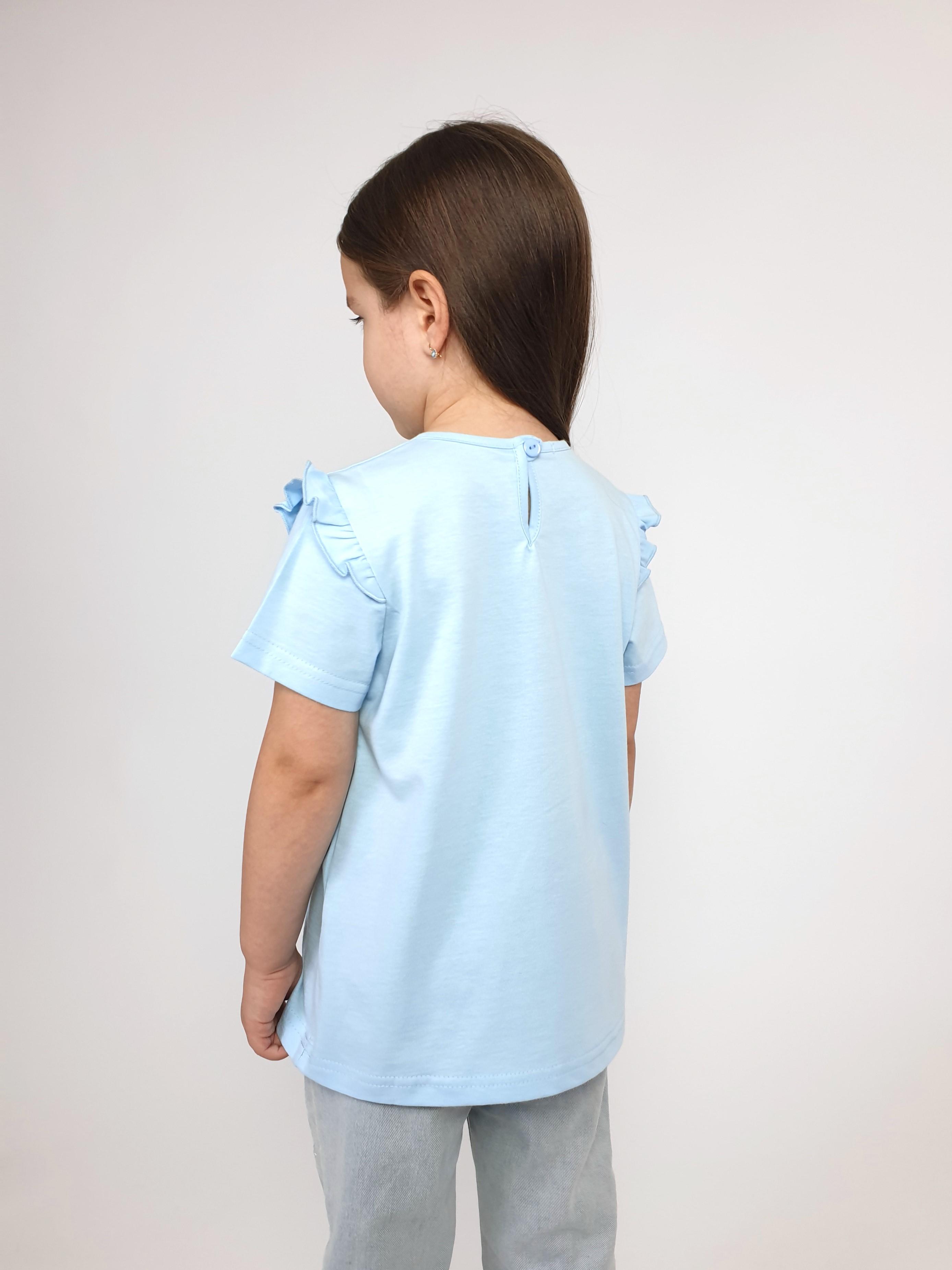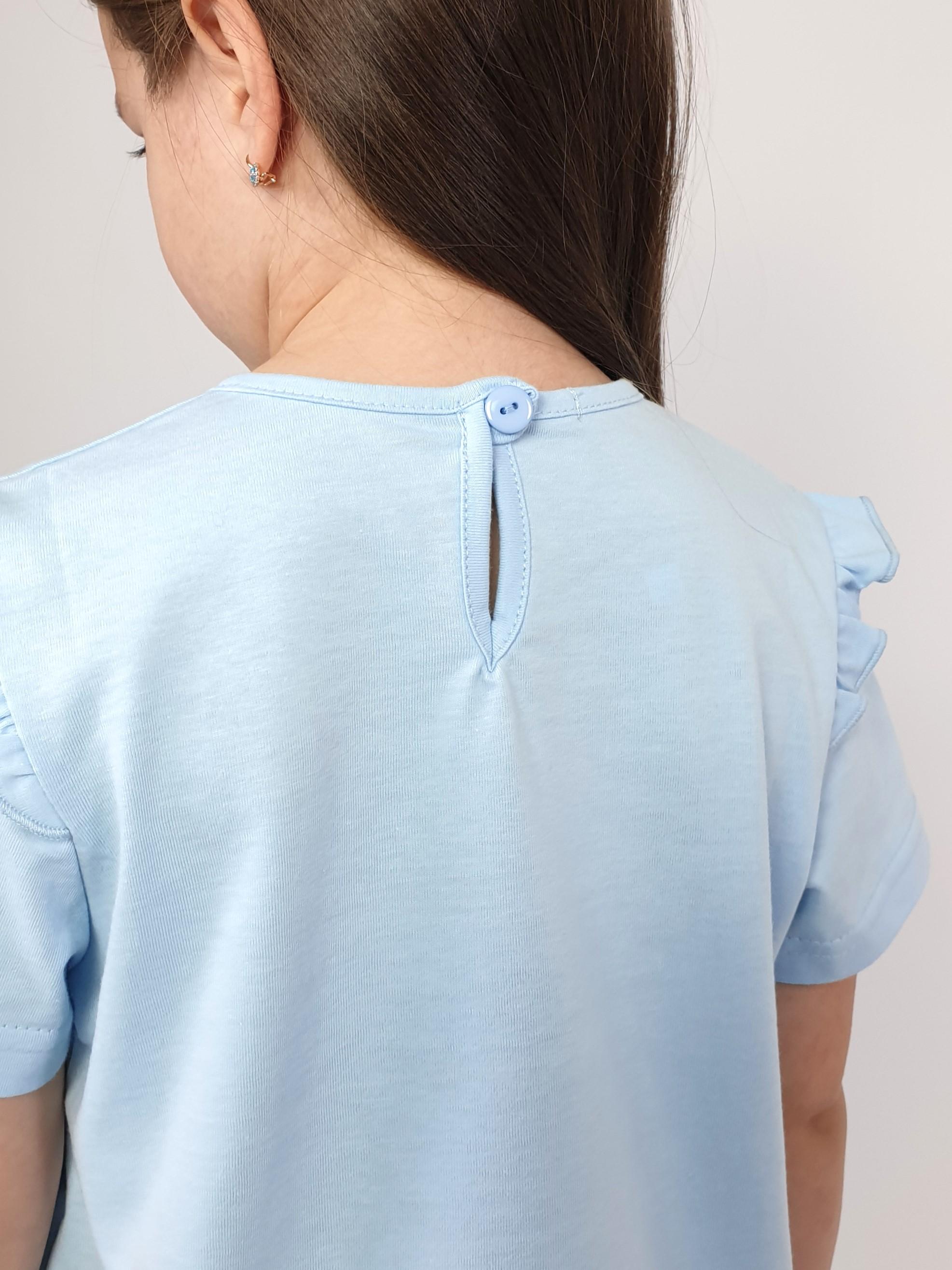 Кулирное полотно: 100% х/б. Фуфайка-силуэт трапеция,короткий втачной рукав,в пройме рюша.Горловина окантована,застежка на пуговицу по спинке.Печать на переде..