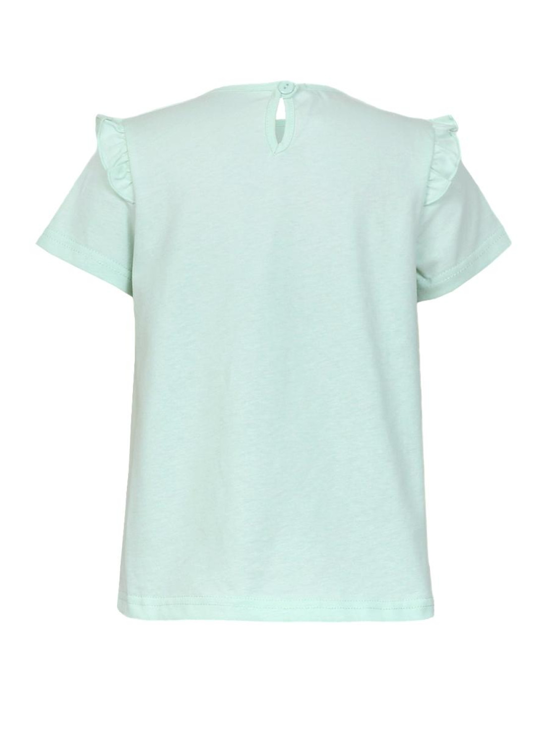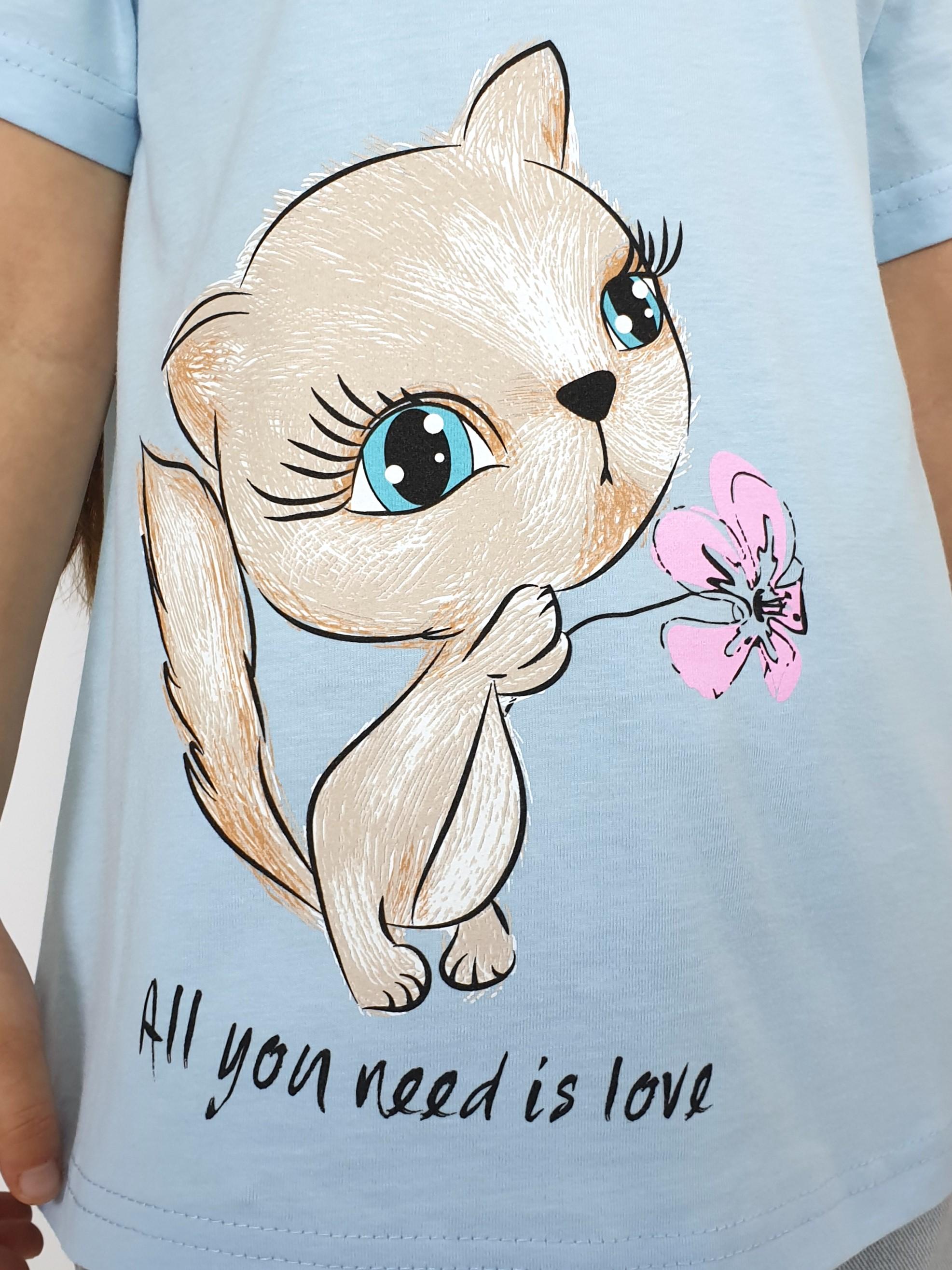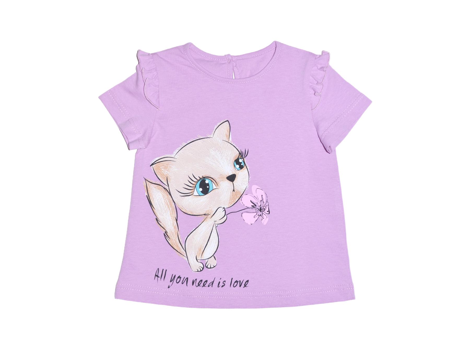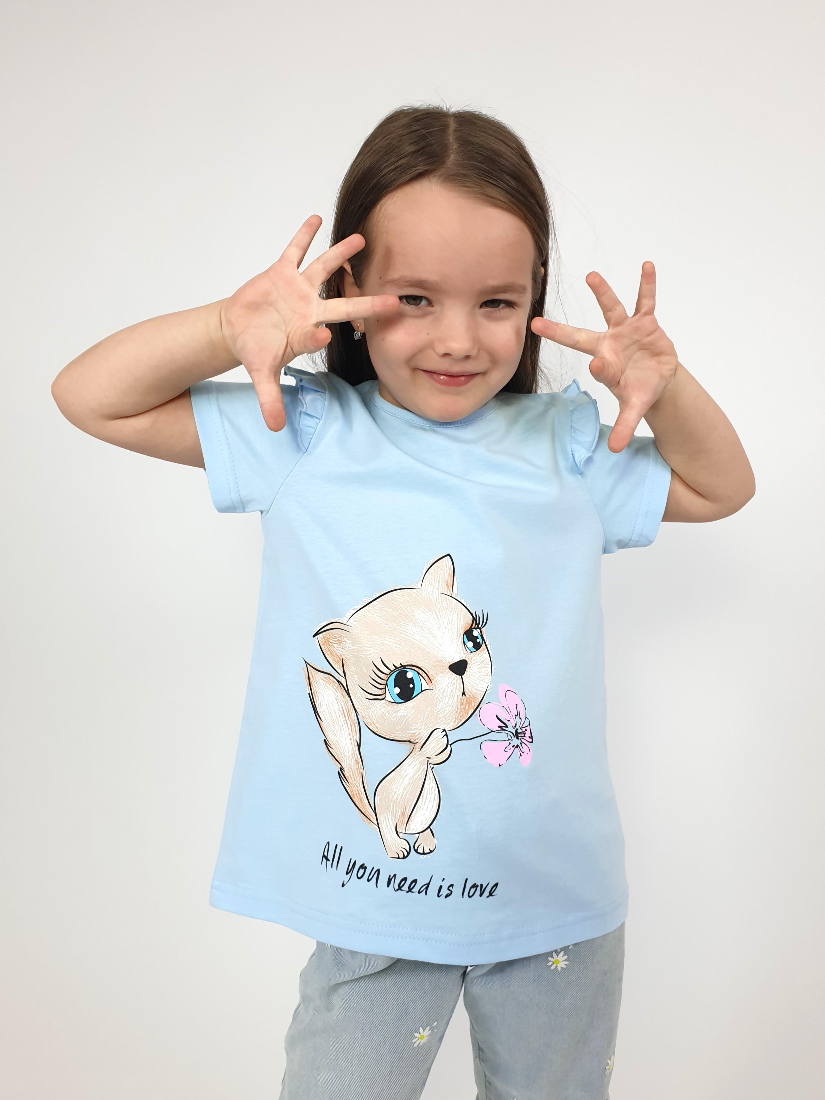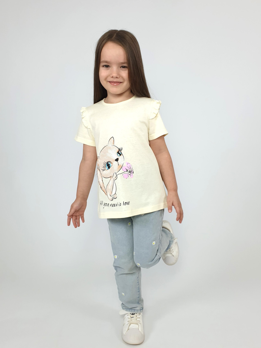 Кулирное полотно: 100% х/б. Фуфайка-силуэт трапеция,короткий втачной рукав,в пройме рюша.Горловина окантована,застежка на пуговицу по спинке.Печать на переде..