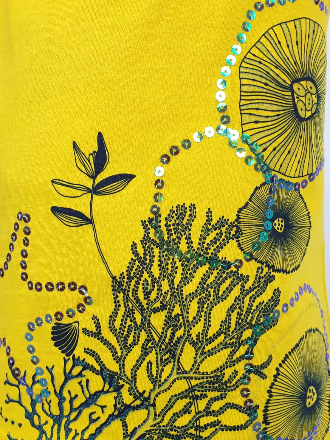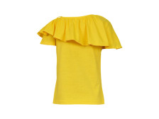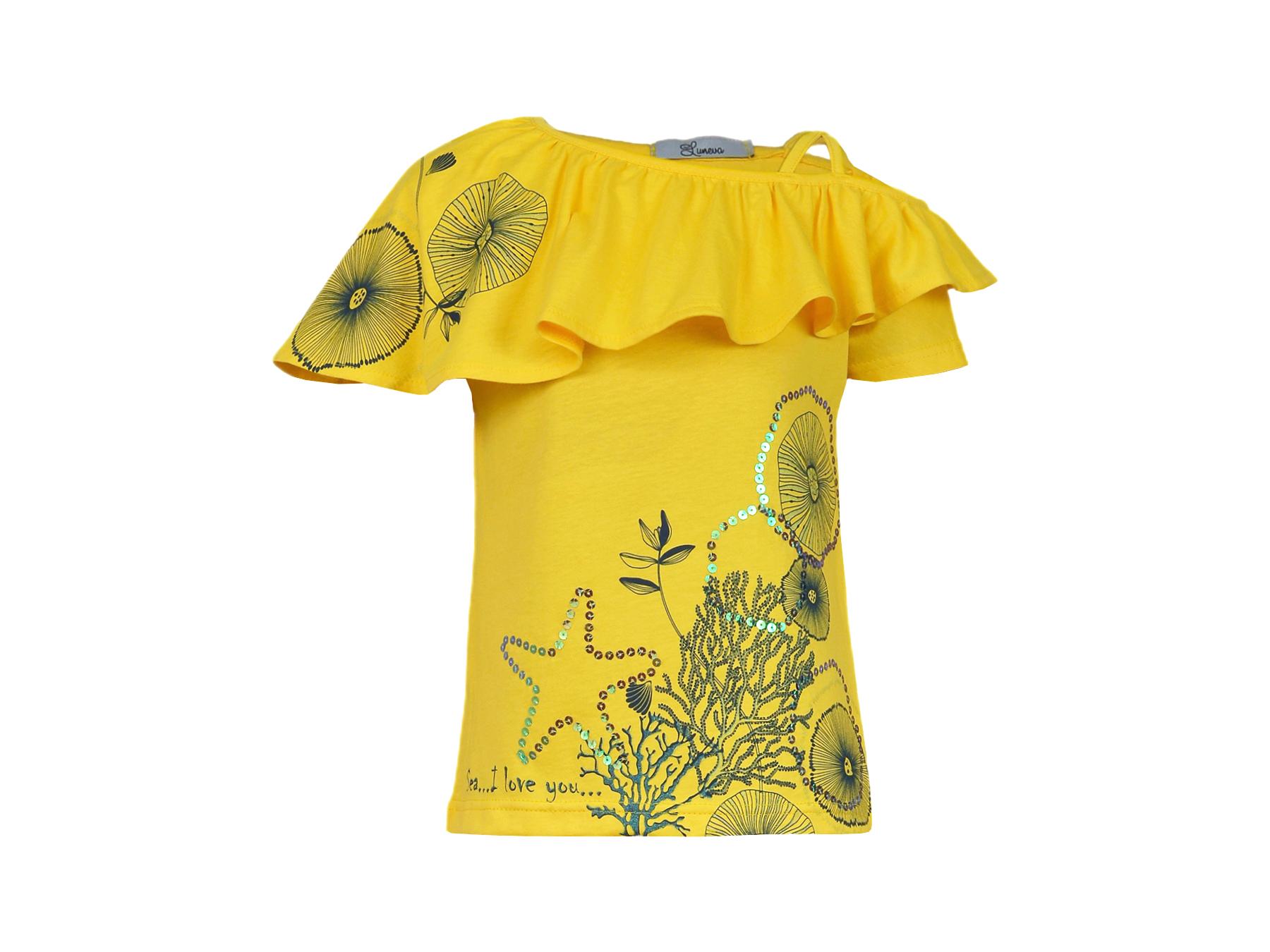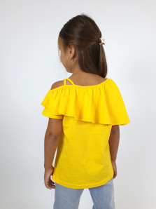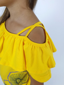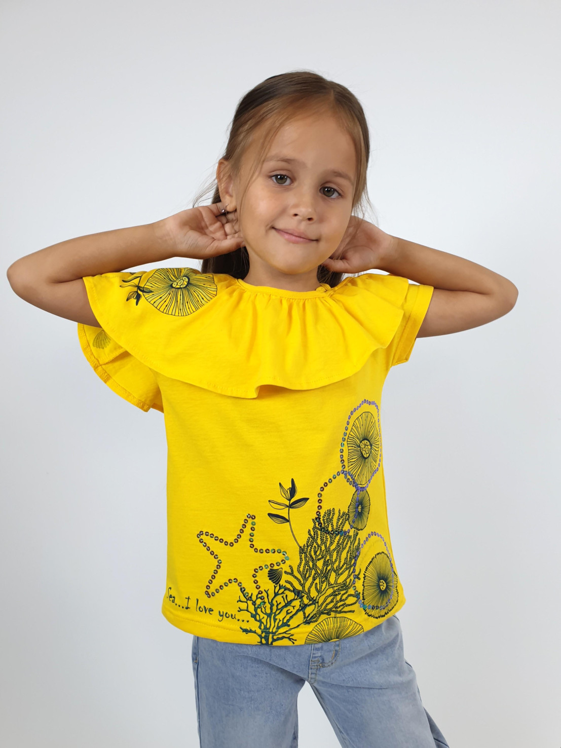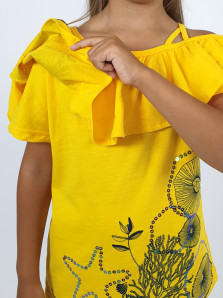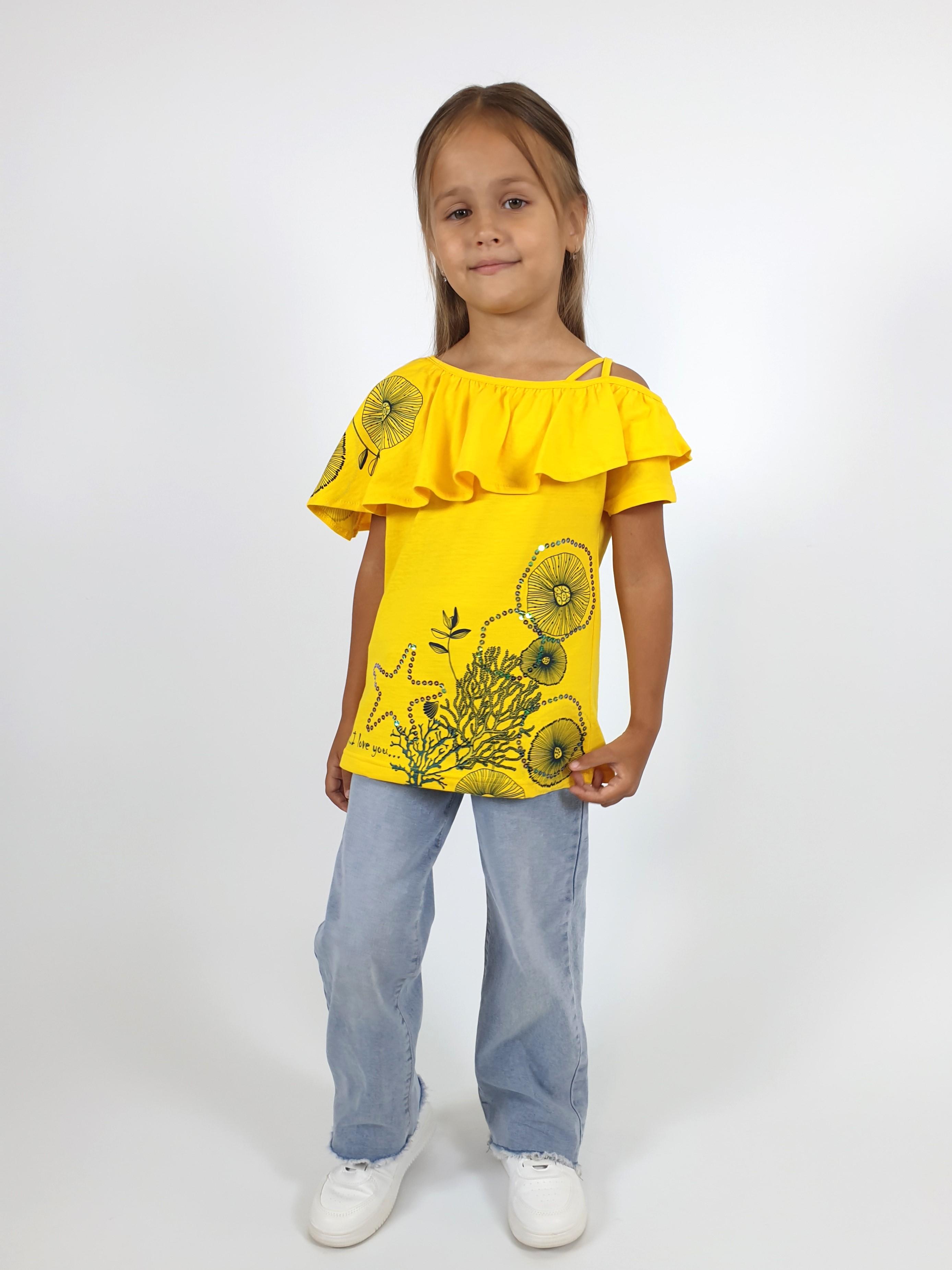 Кулирное полотно: 100% х/б. Фуфайка-полуприлегающий силуэт с открытым плечом,с бретелью и воланом.Вырез горловины окантован.Печать на переде и по волану справа.Вышивка-пайетки.