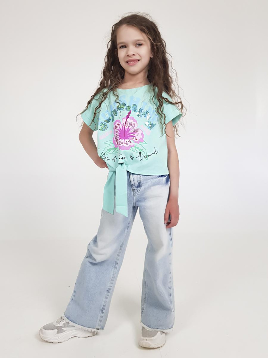Кулирное полотно: 100% х/б. Фуфайка-прямой силуэт,внизу завязан"узел".Цельнокроенный рукав с притачной манжетой.Горловина обработана планкой.Печать и вышивка пайетки на переде.