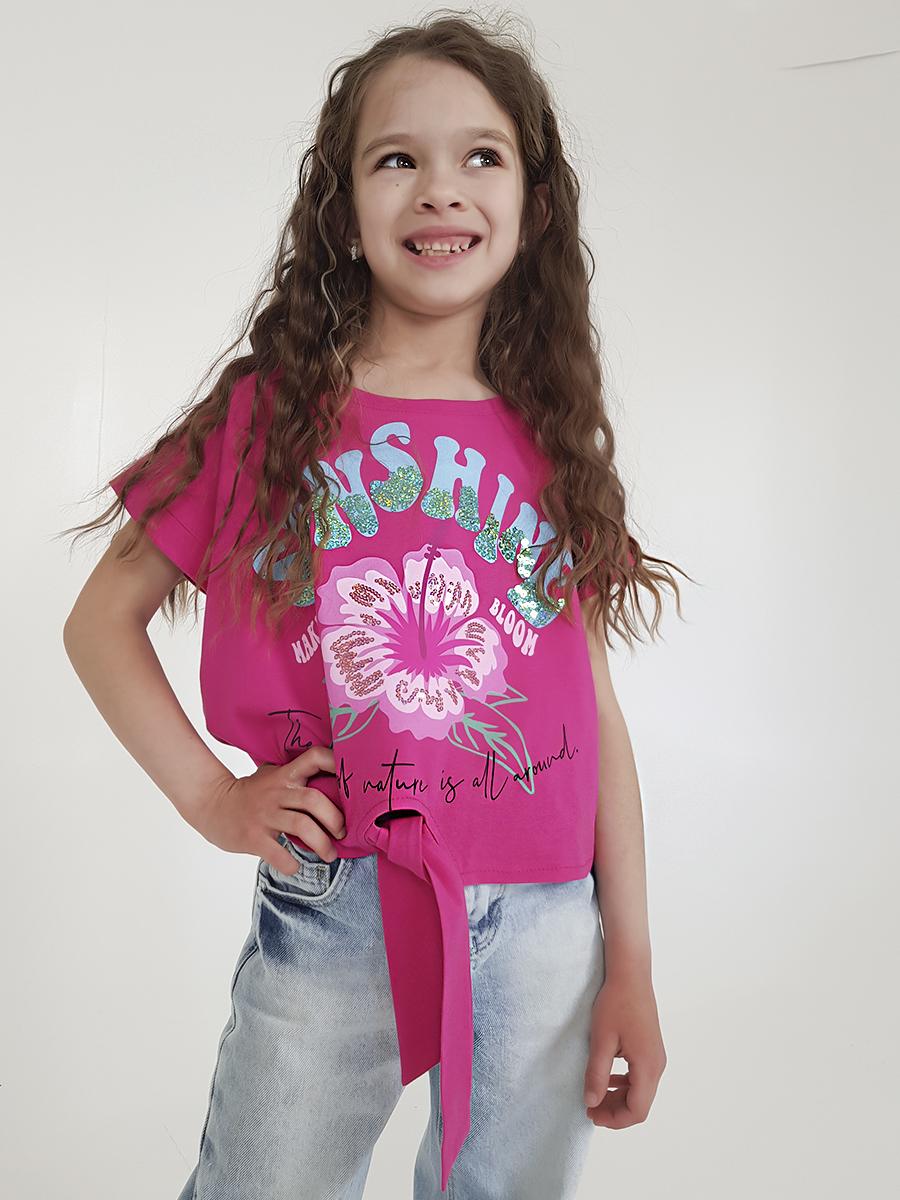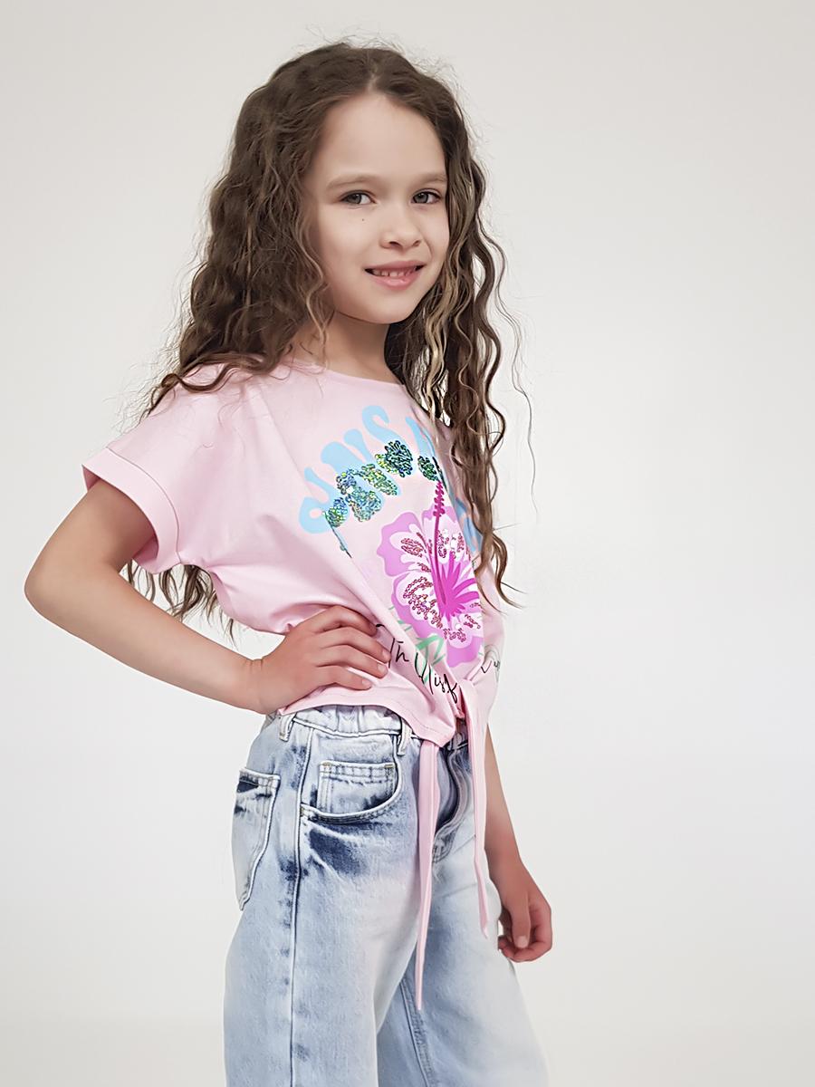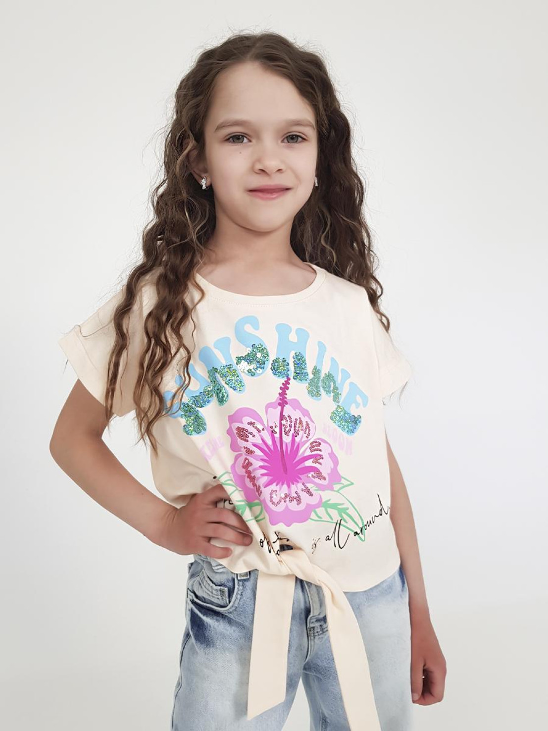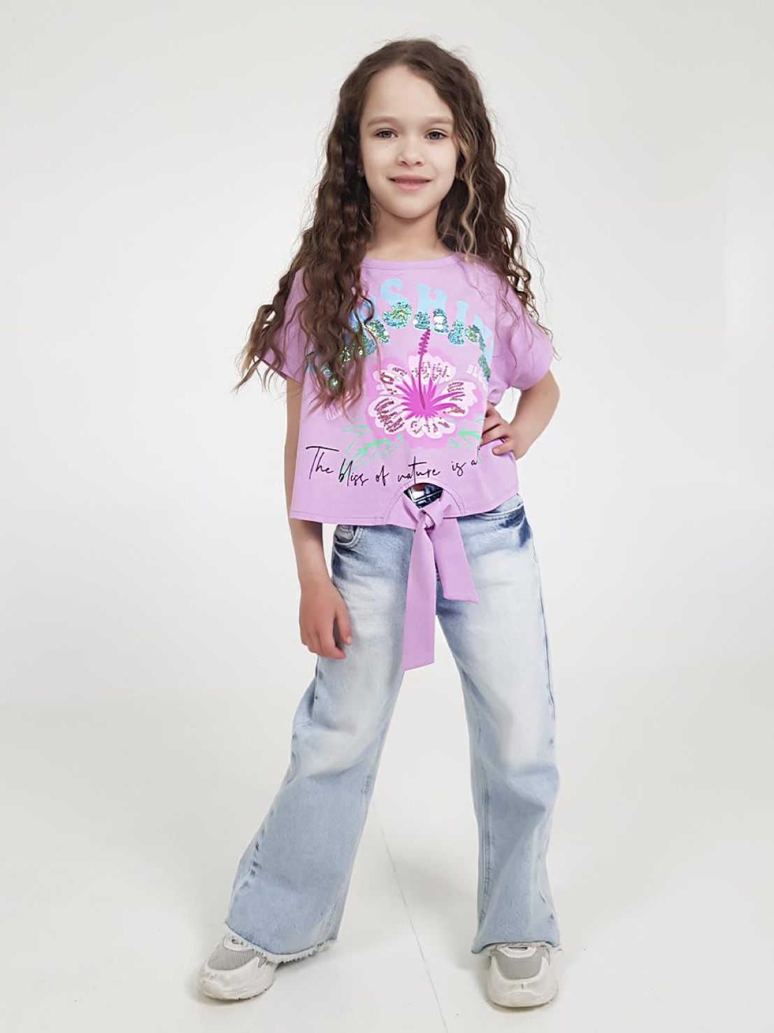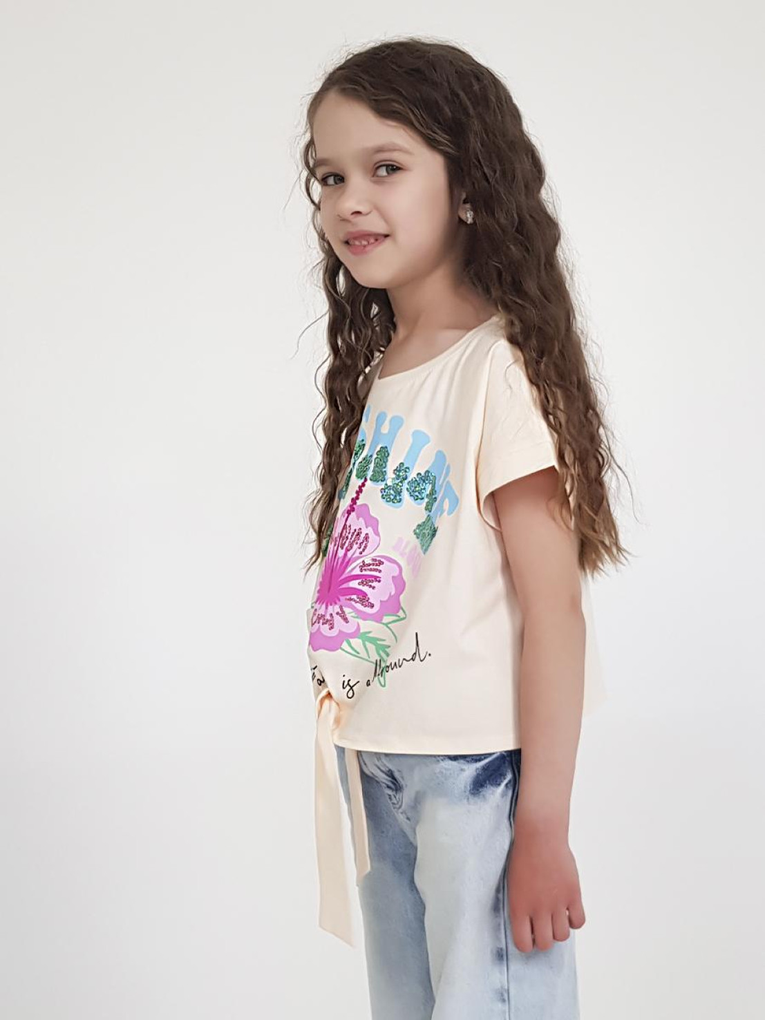 Кулирное полотно: 100% х/б. Фуфайка-прямой силуэт,внизу завязан"узел".Цельнокроенный рукав с притачной манжетой.Горловина обработана планкой.Печать и вышивка пайетки на переде.