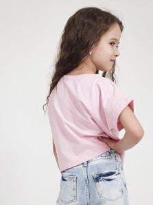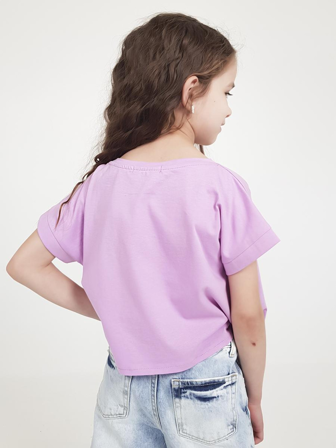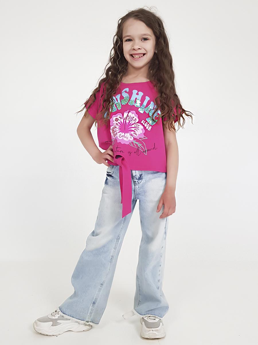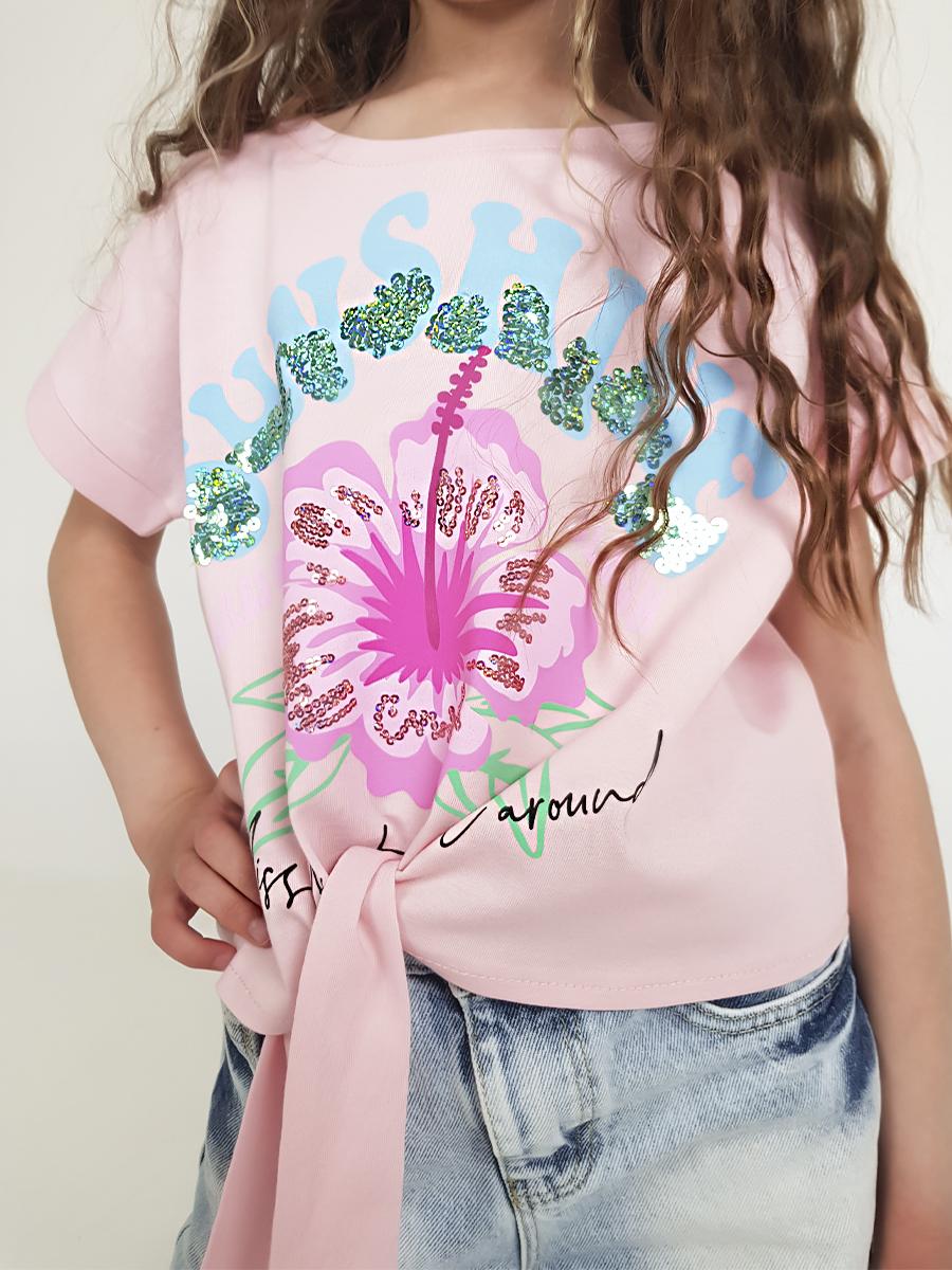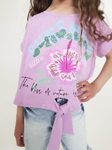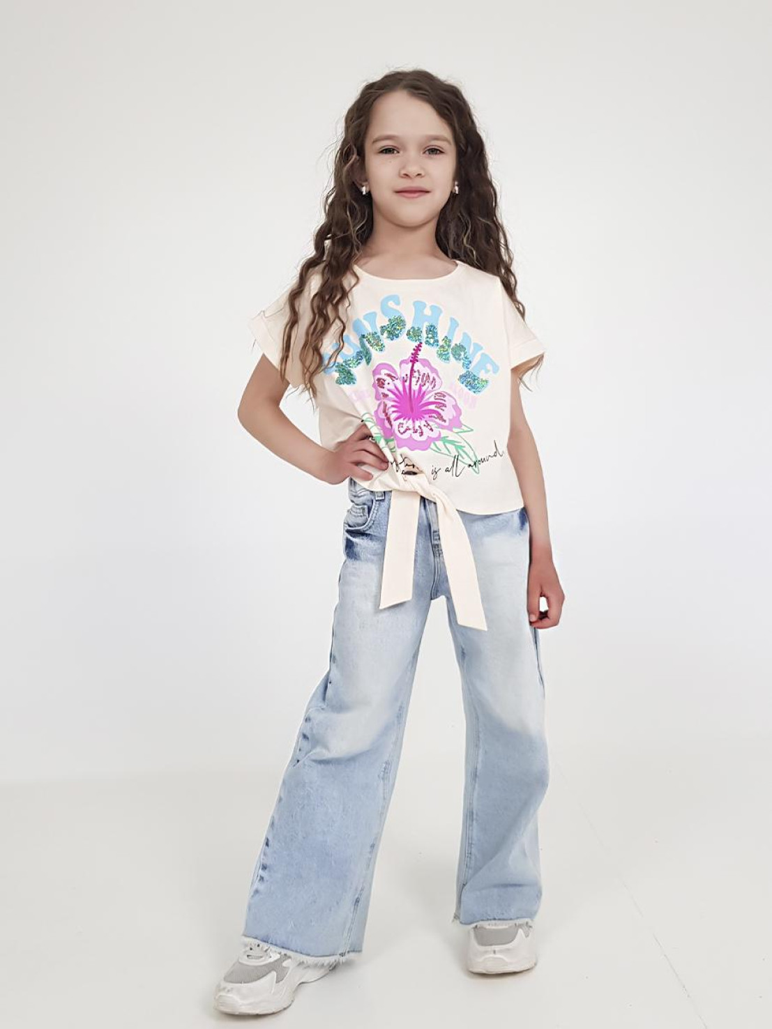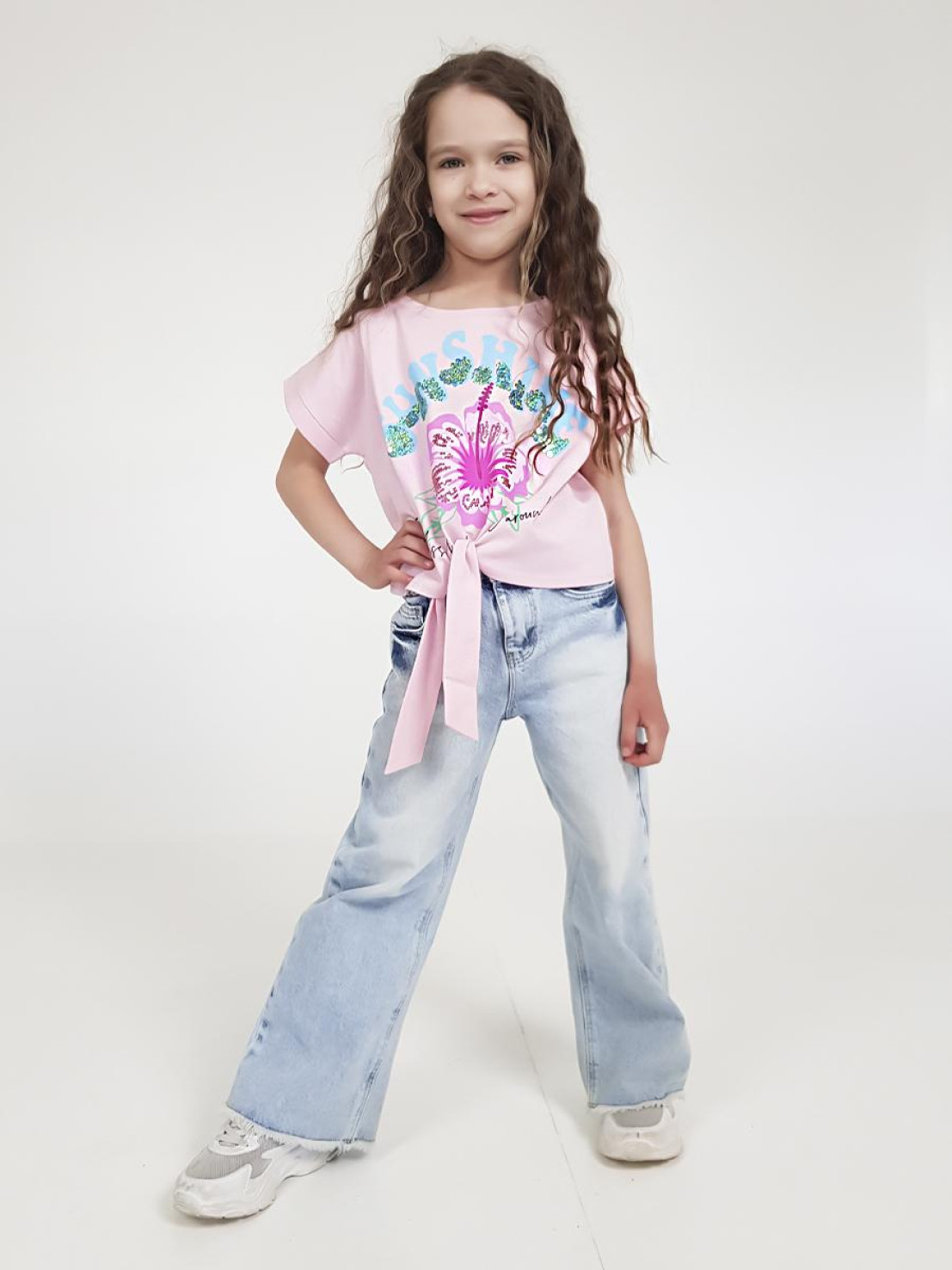 Кулирное полотно: 100% х/б. Фуфайка-прямой силуэт,внизу завязан"узел".Цельнокроенный рукав с притачной манжетой.Горловина обработана планкой.Печать и вышивка пайетки на переде.