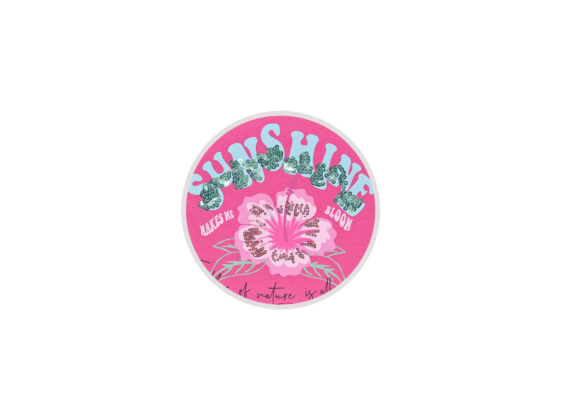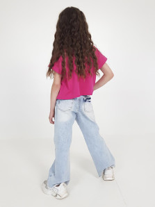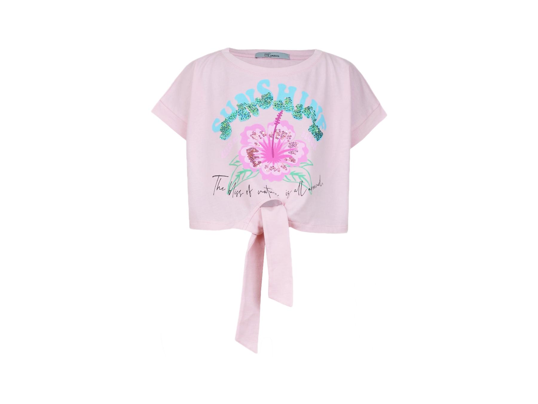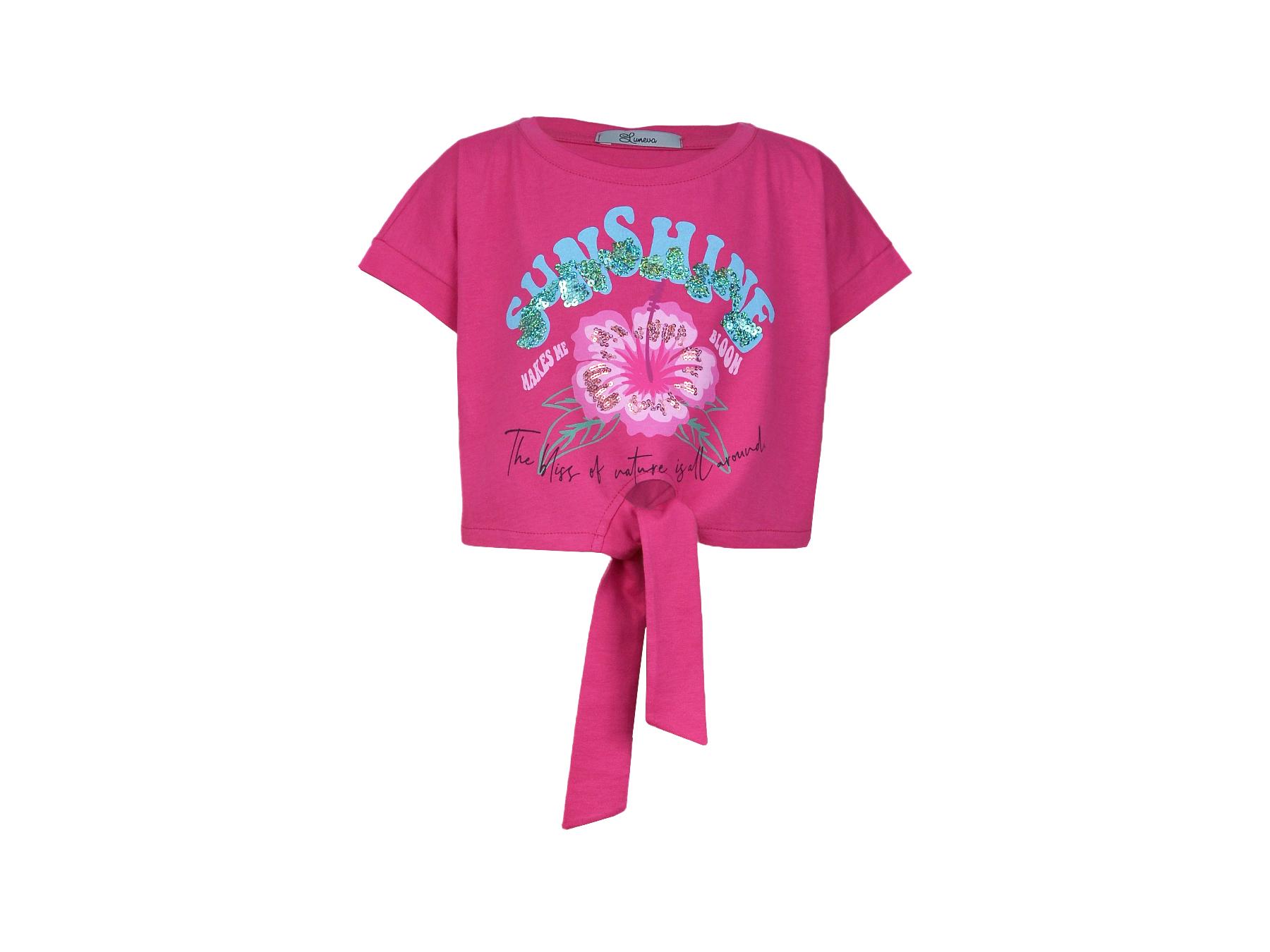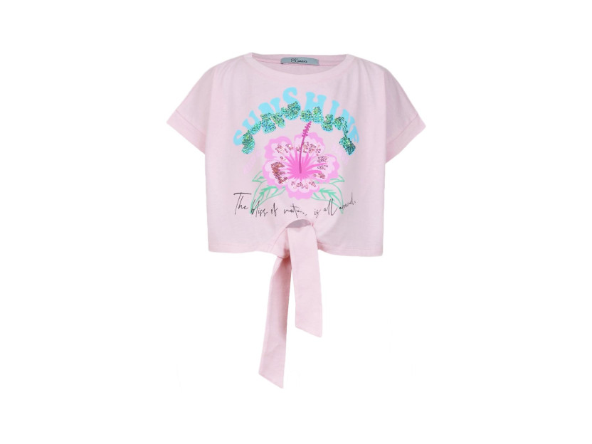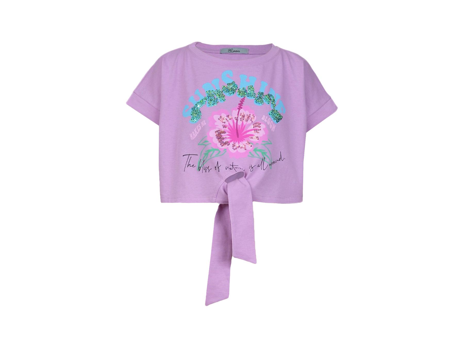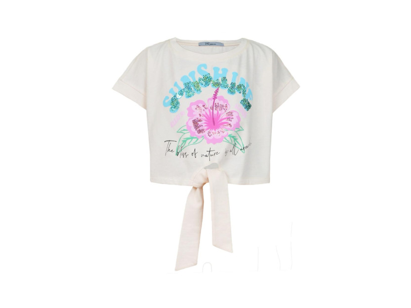 Кулирное полотно: 100% х/б. Фуфайка-прямой силуэт,внизу завязан"узел".Цельнокроенный рукав с притачной манжетой.Горловина обработана планкой.Печать и вышивка пайетки на переде.