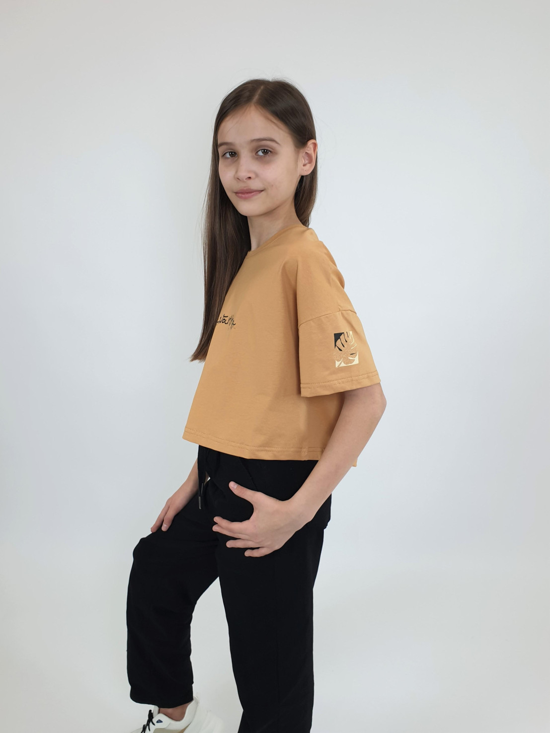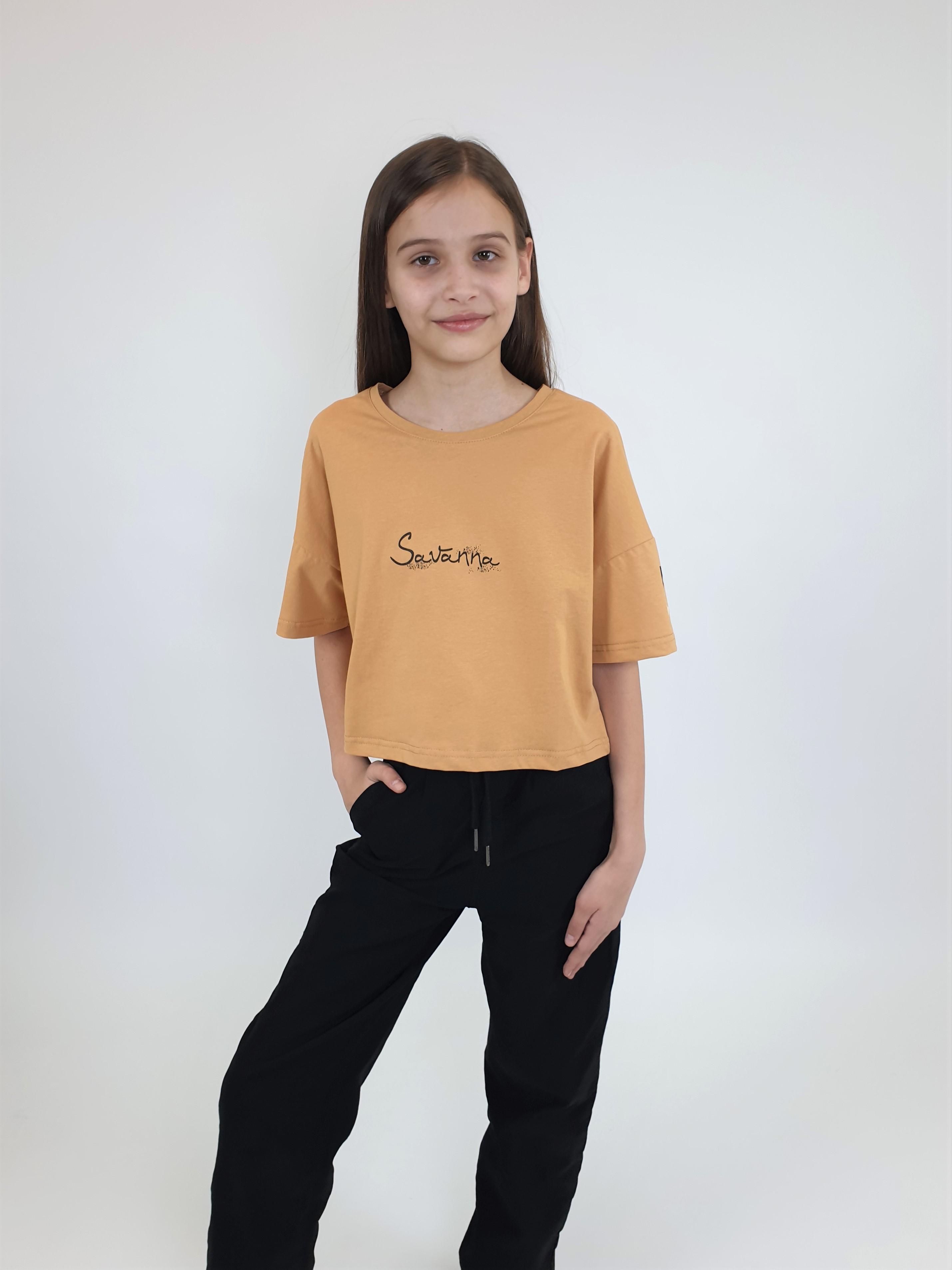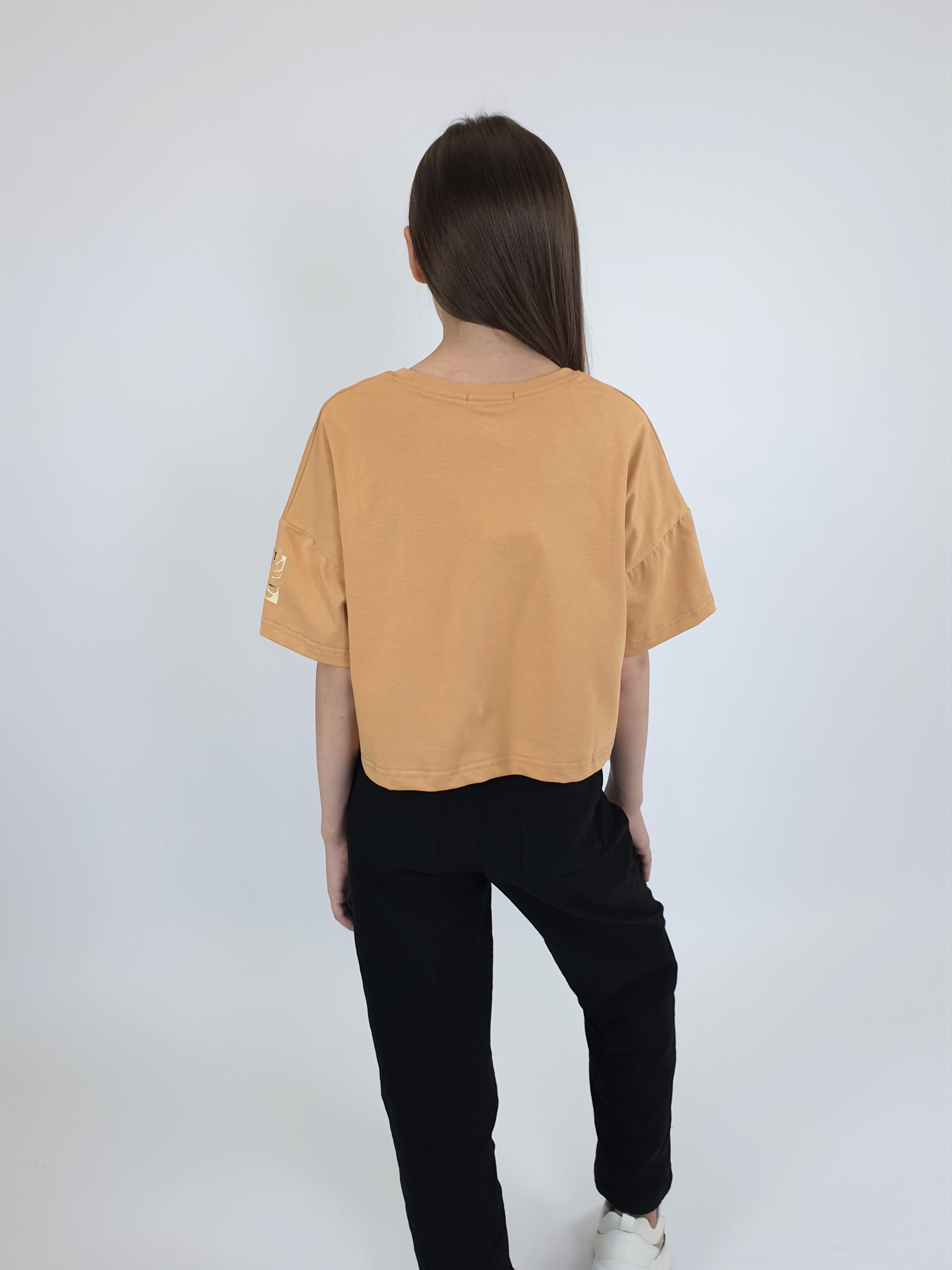 Кулирное полотно: 100% х/б. Фуфайка(оверсайз)-укороченная,спущенное плечо,короткий рукав.Печать на переде,горловина обработана планкой.