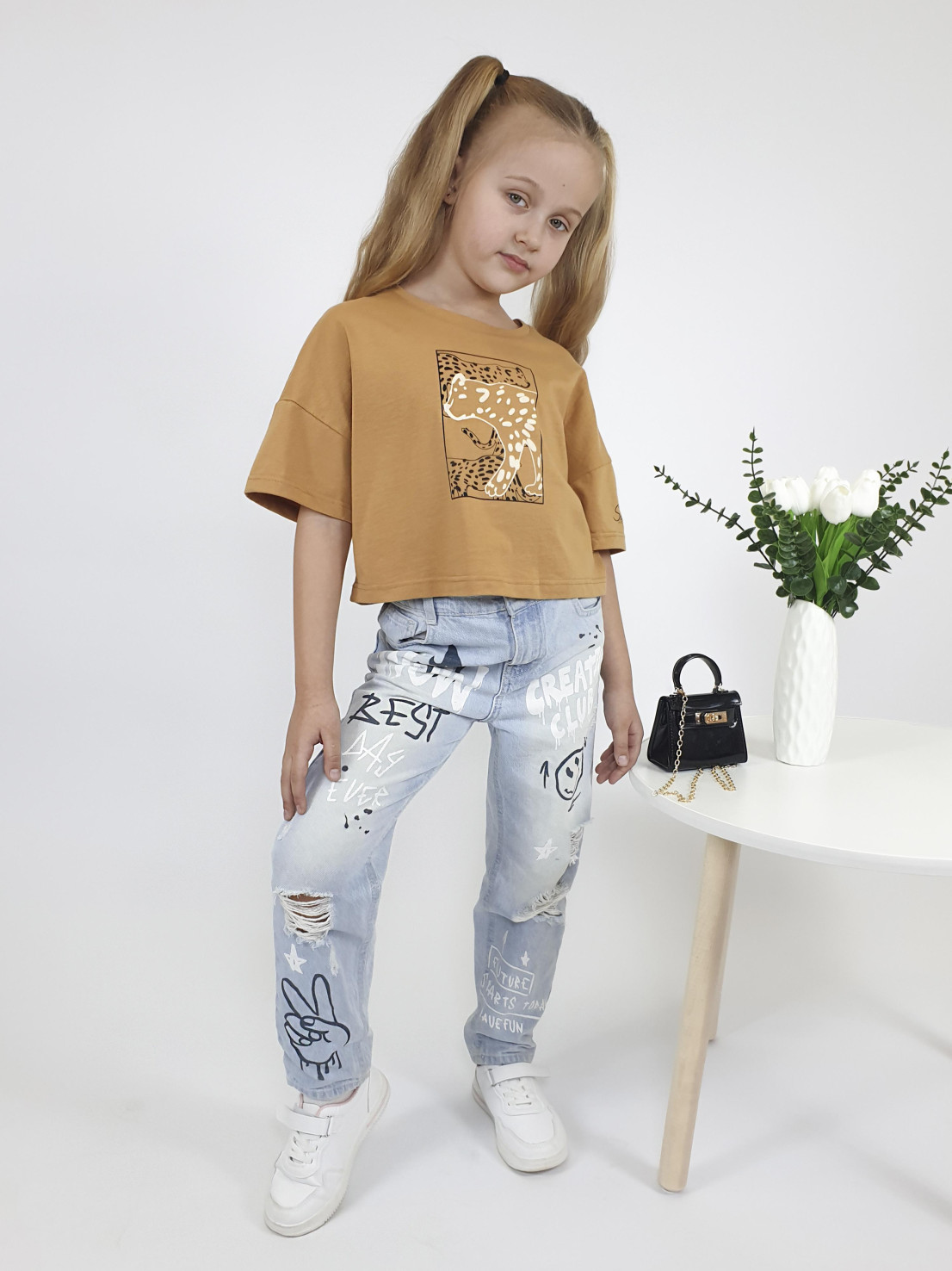 Кулирное полотно: 100% х/б. Фуфайка(оверсайз)-укороченная,спущенное плечо,короткий рукав.Печать на переде,горловина обработана планкой.