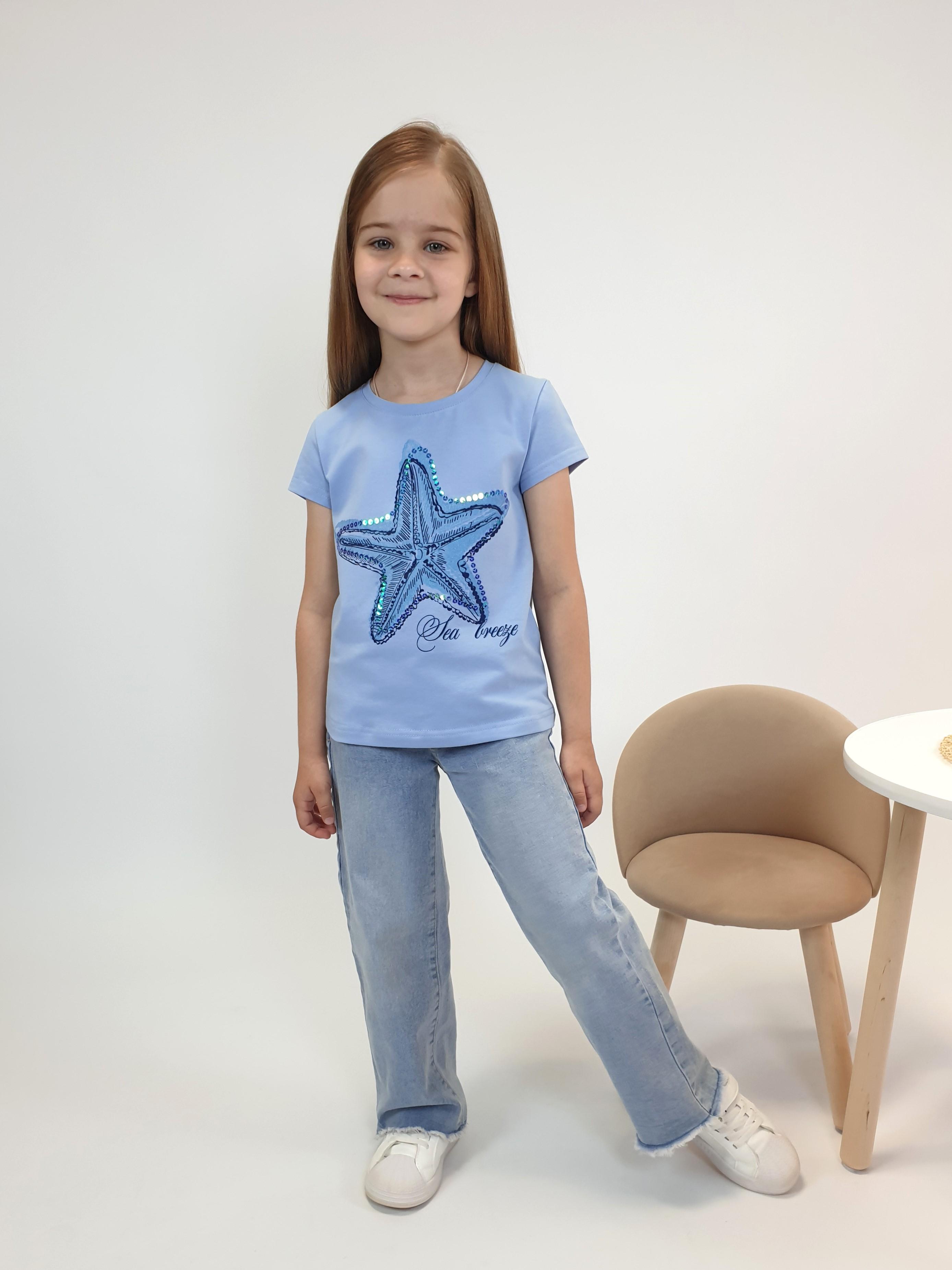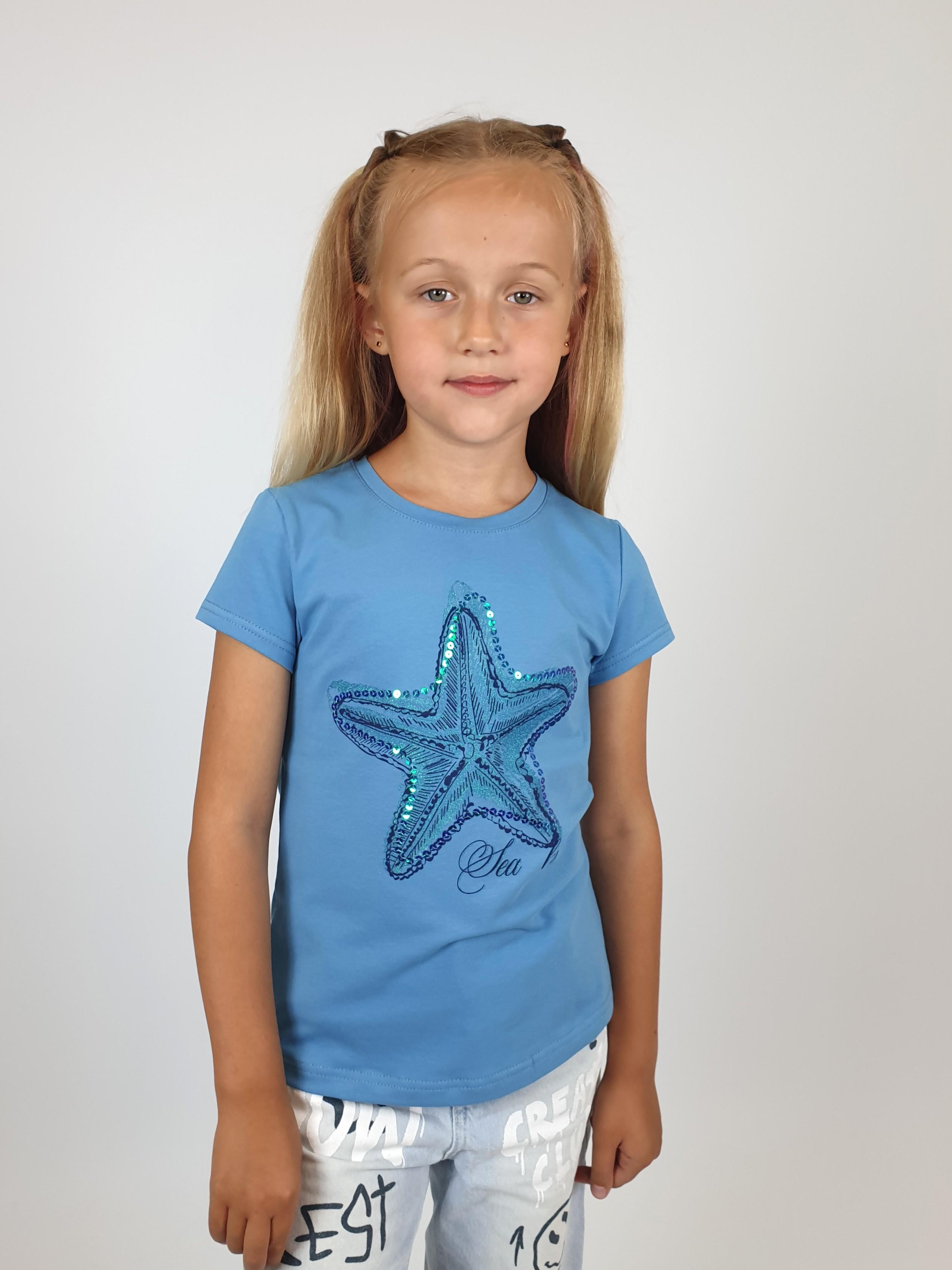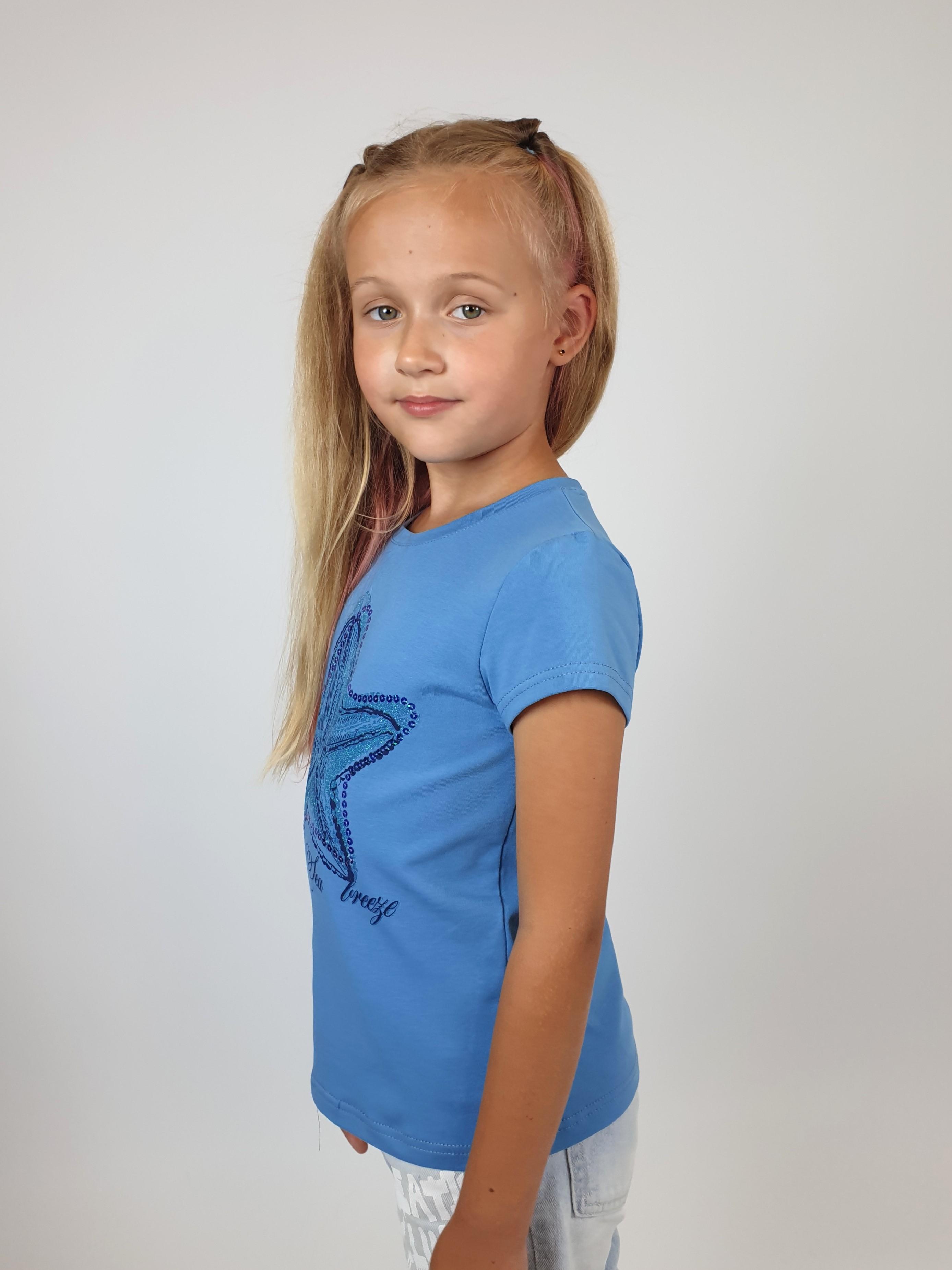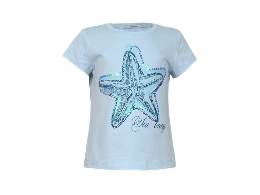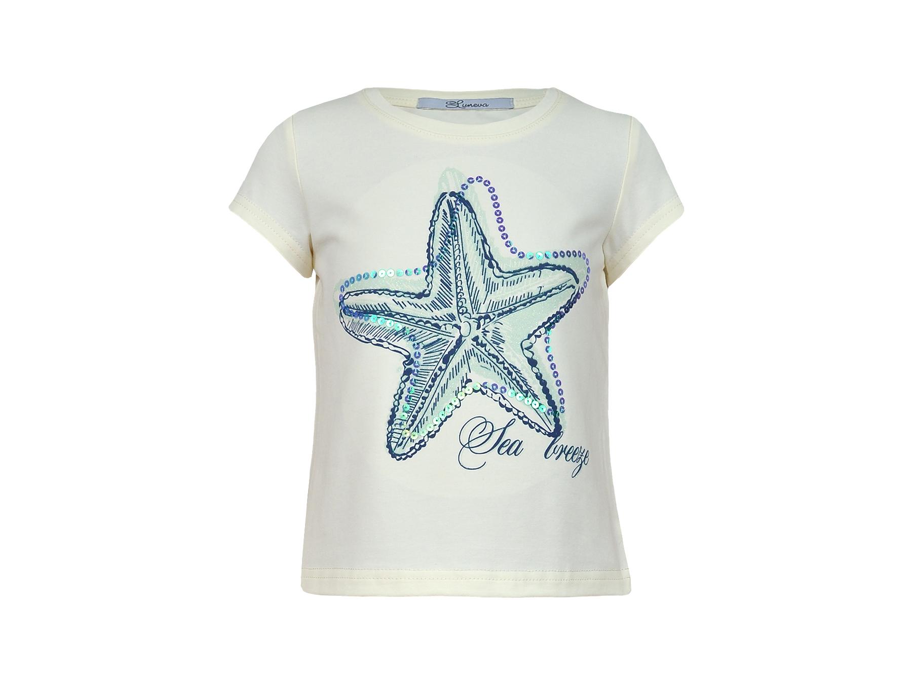 Кулирное полотно:95%х/б.,5% лайкра. Фуфайка-полуприлегающий силуэт,печать и вышивка пайетки на переде.Горловина обработана притачной планкой.Рукав короткий втачной.Низ рукава и низ изделия подшит.