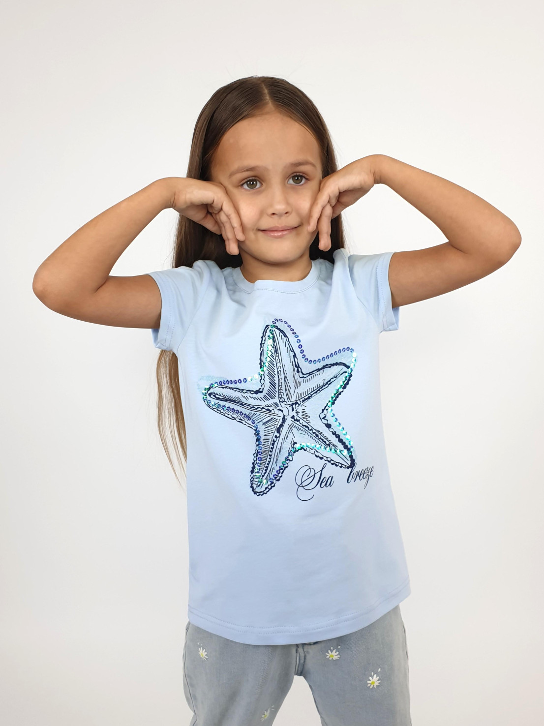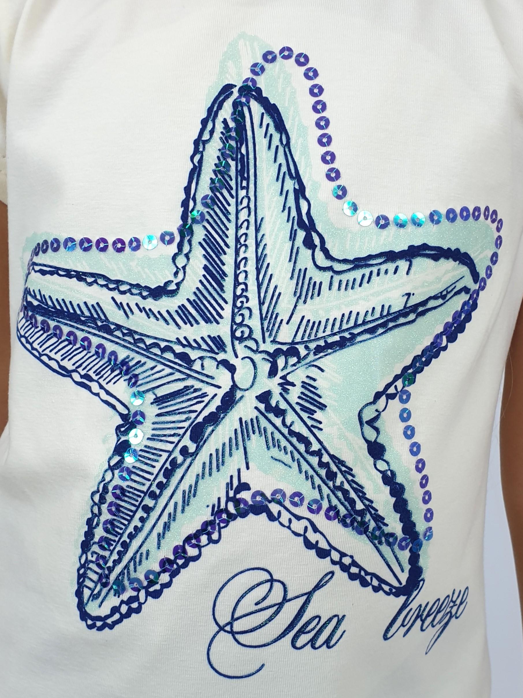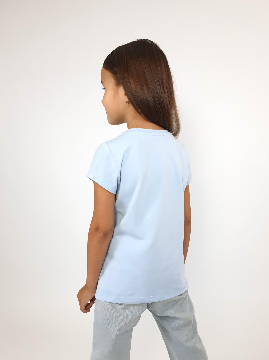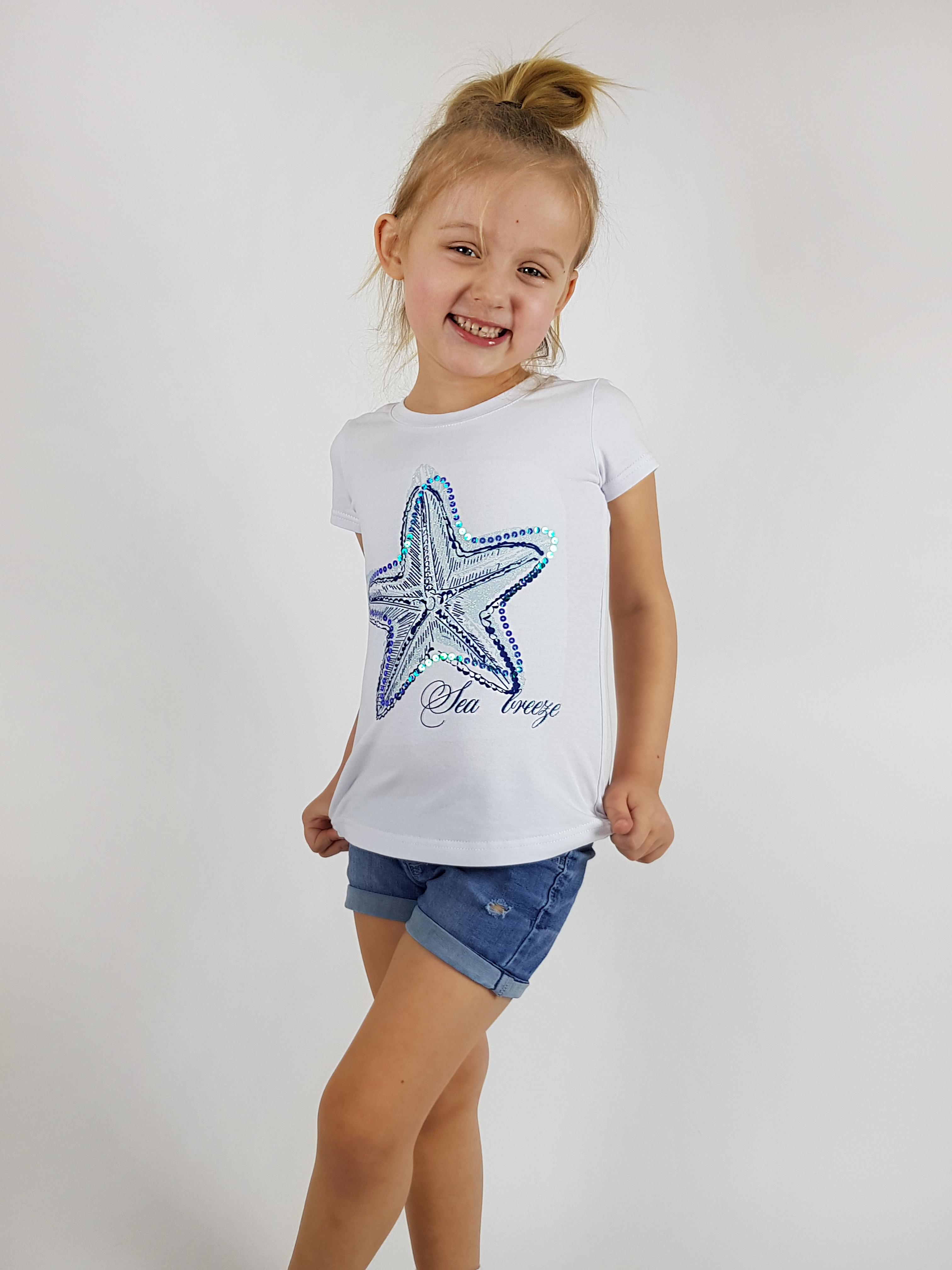 Кулирное полотно:95%х/б.,5% лайкра. Фуфайка-полуприлегающий силуэт,печать и вышивка пайетки на переде.Горловина обработана притачной планкой.Рукав короткий втачной.Низ рукава и низ изделия подшит.
