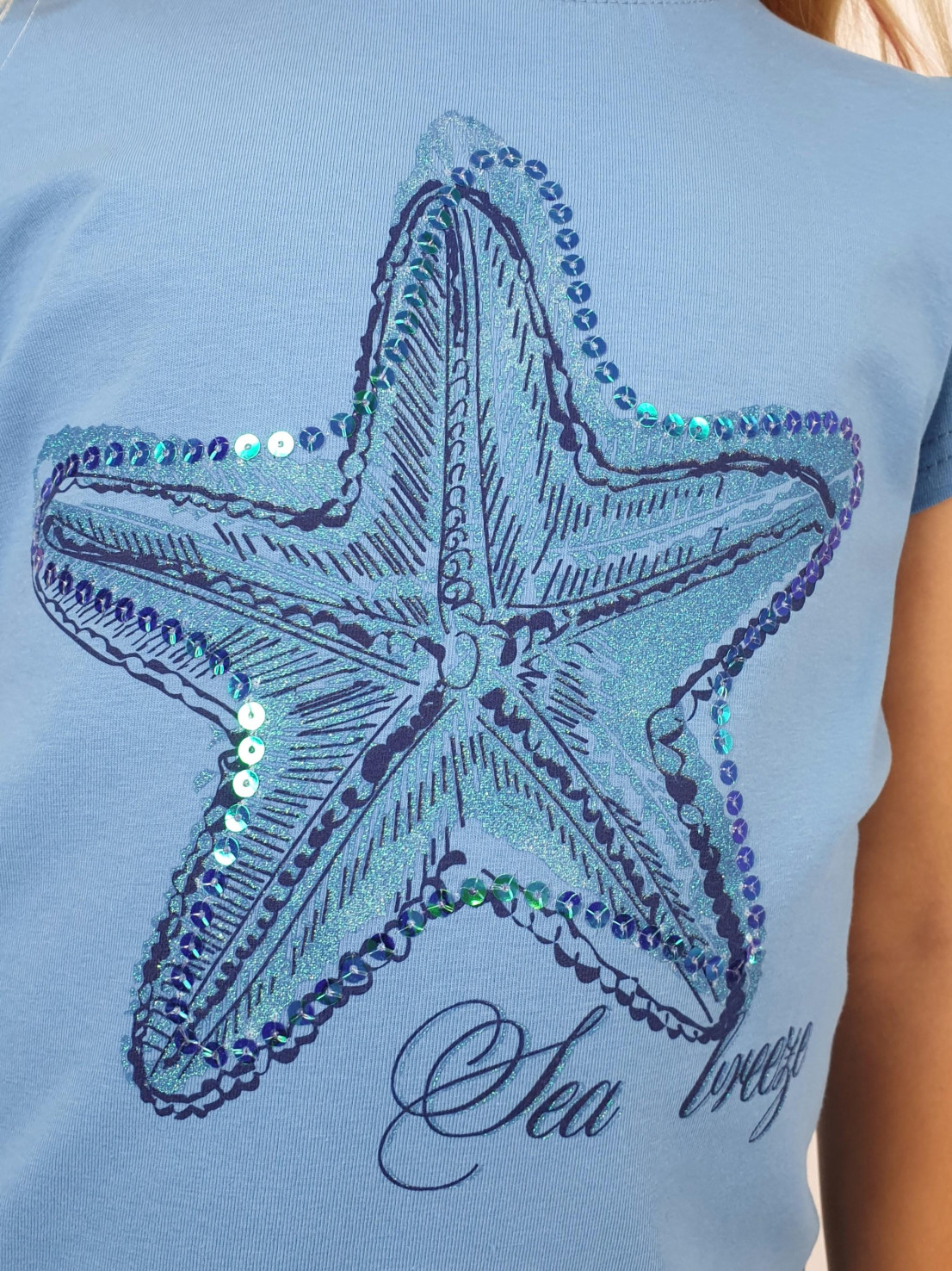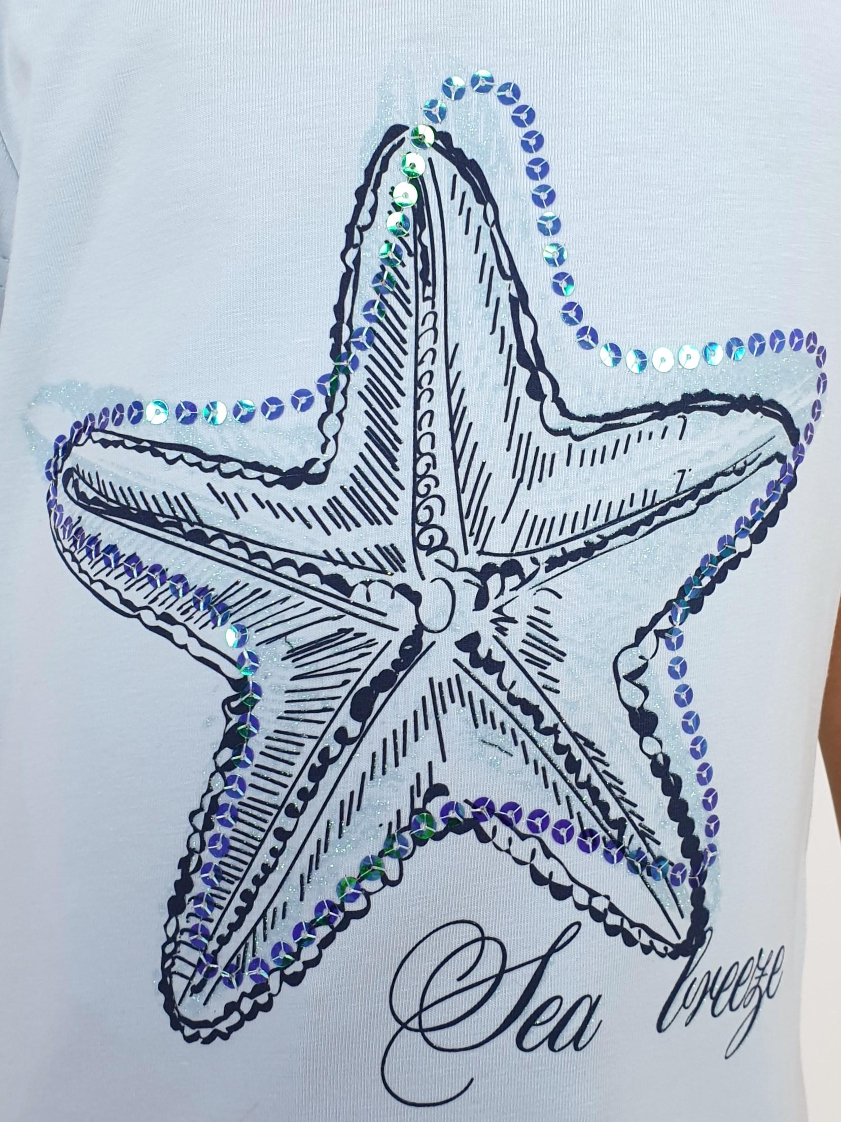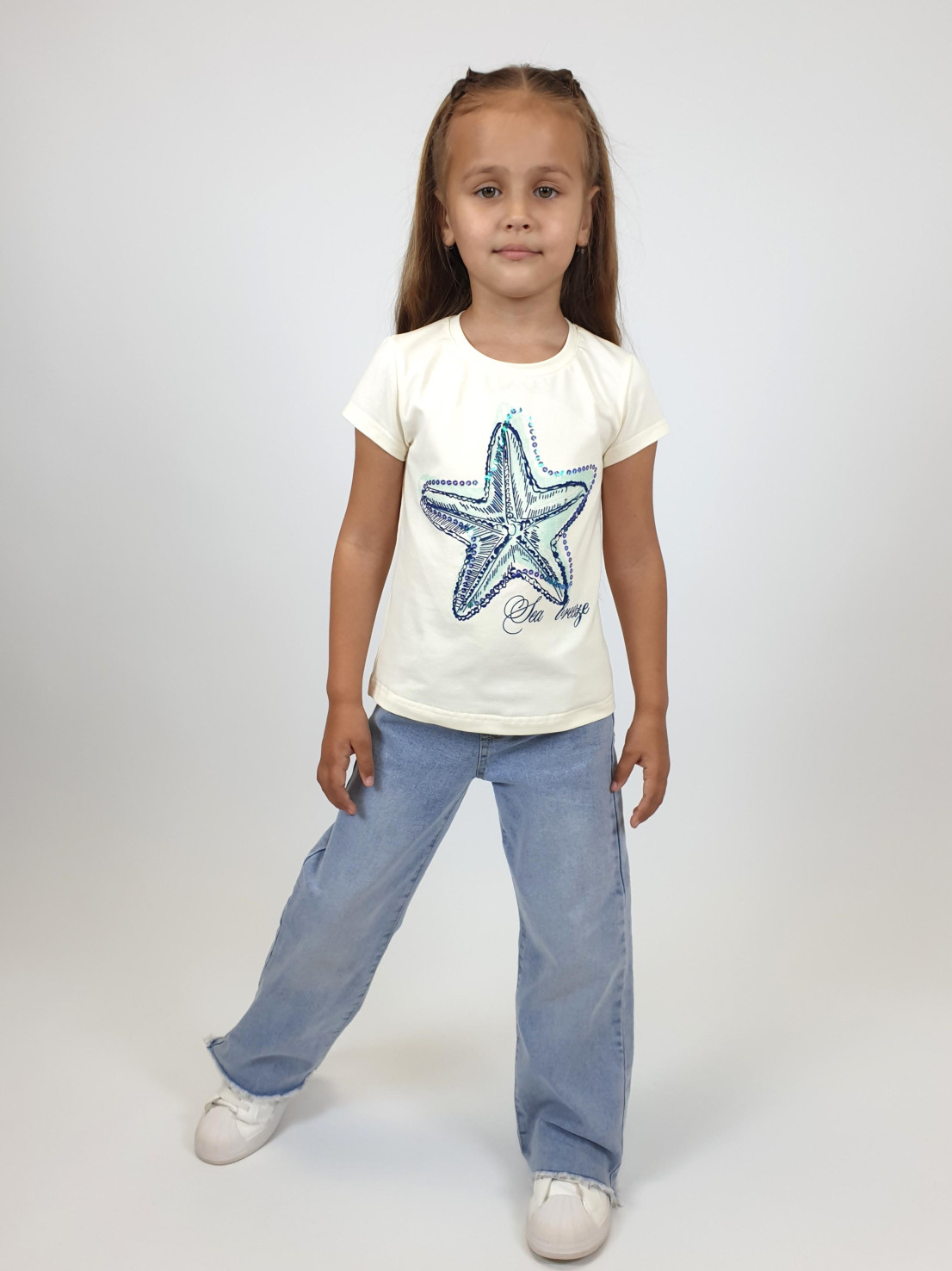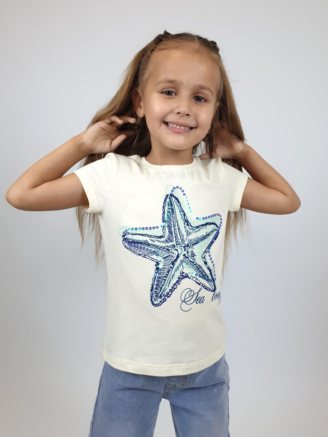Кулирное полотно:95%х/б.,5% лайкра. Фуфайка-полуприлегающий силуэт,печать и вышивка пайетки на переде.Горловина обработана притачной планкой.Рукав короткий втачной.Низ рукава и низ изделия подшит.