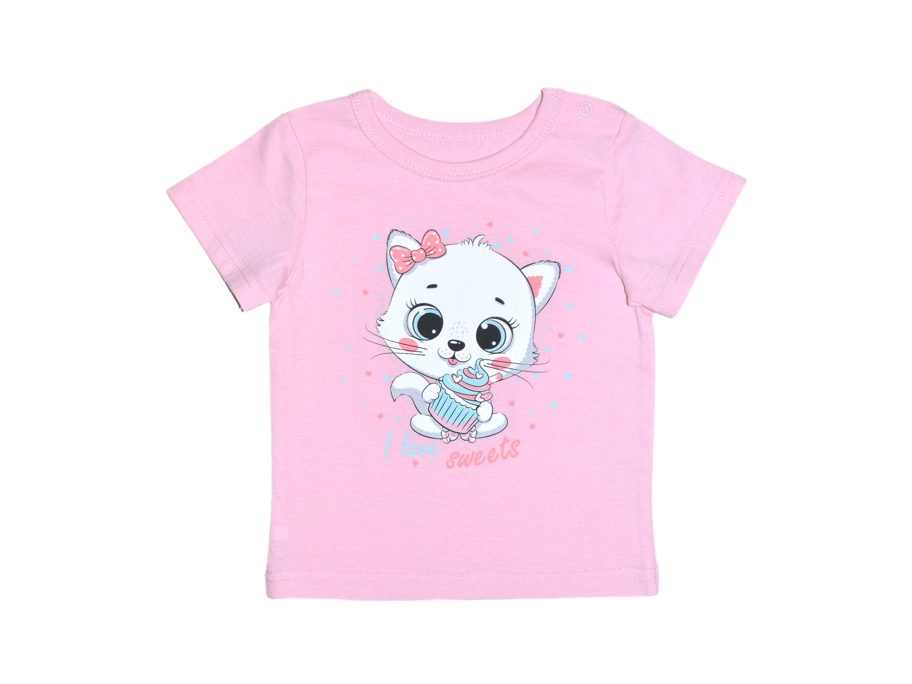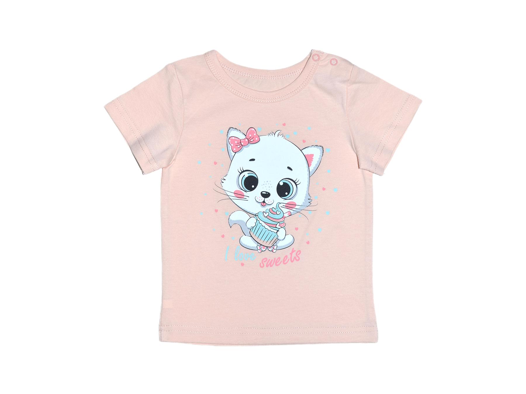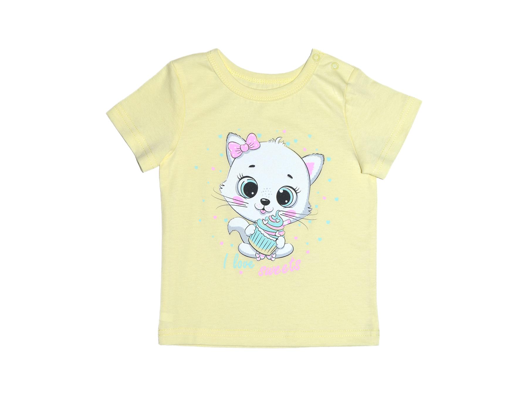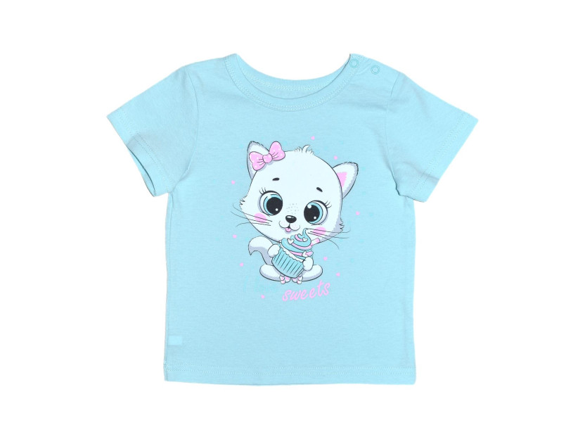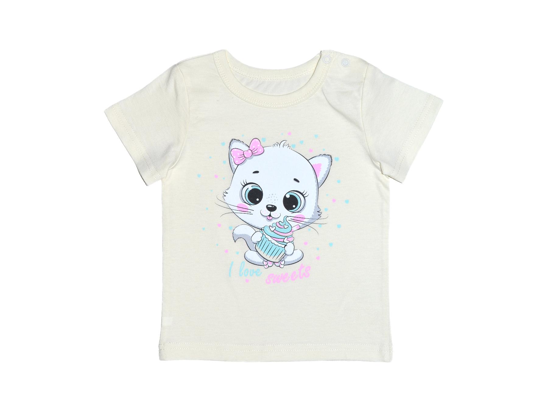 Кулирное полотно:100% х/б. Фуфайка-прямой силуэт,короткий втачной рукав. Горловина окантована,застежка в плечевом шве на кнопки.Печать на переде.