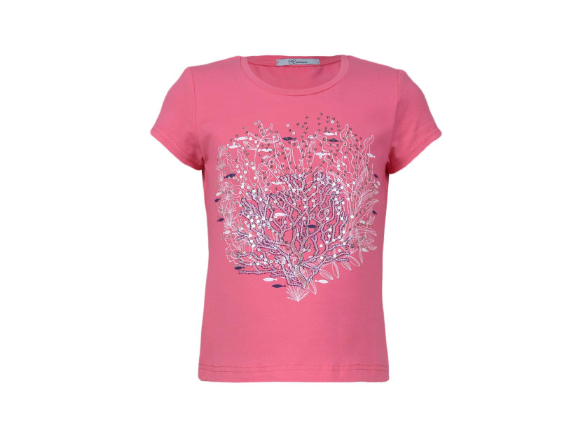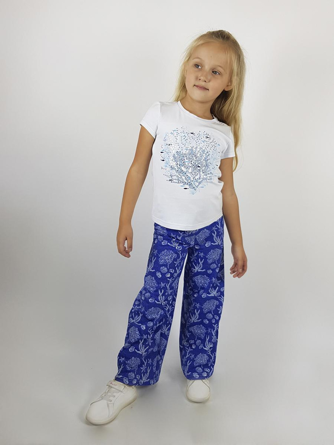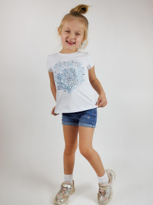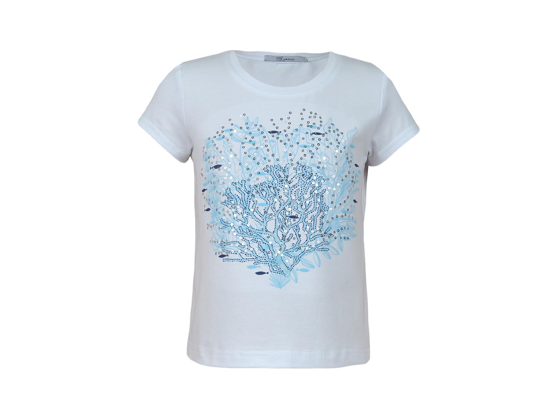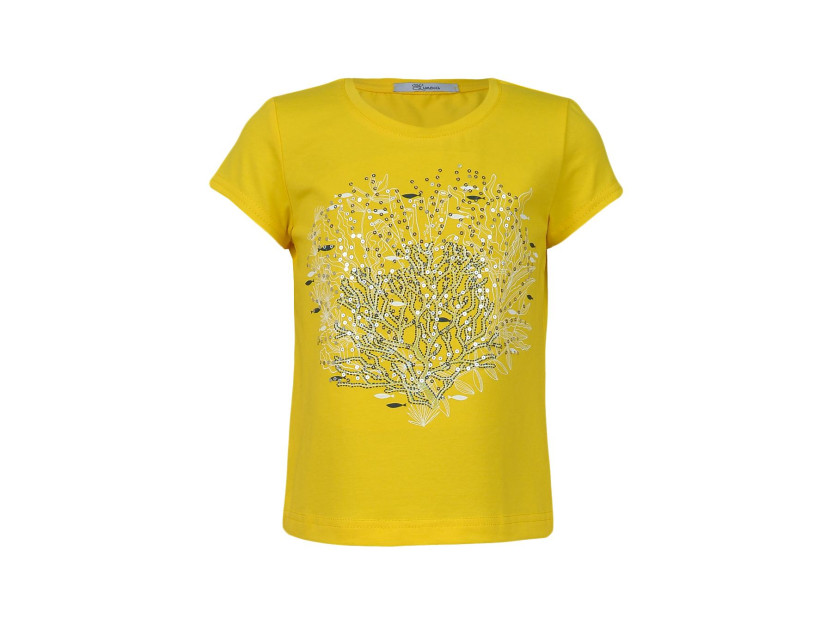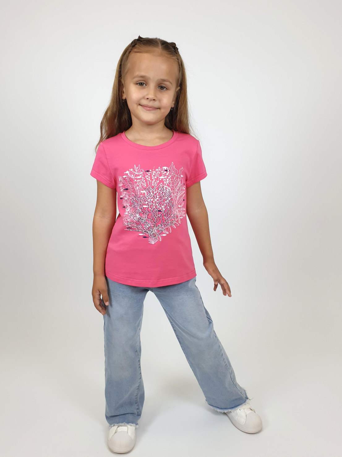 Футболка для девочки изготовлена из кулирного полотна (95% хлопок, 5% лайкра). Модель полуприлегающего силуэта, короткий втачной рукав. Оригинальный принт с вышивкой (пайетки) точно понравится юным модницам. Ткань изделия мягкая, дышащая и приятная к телу.