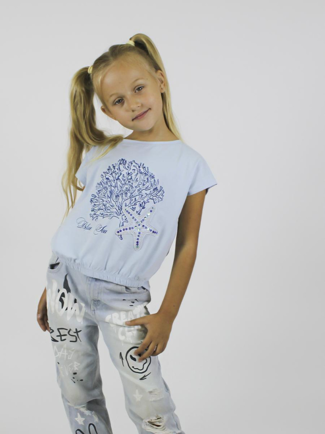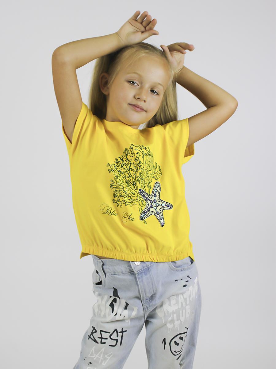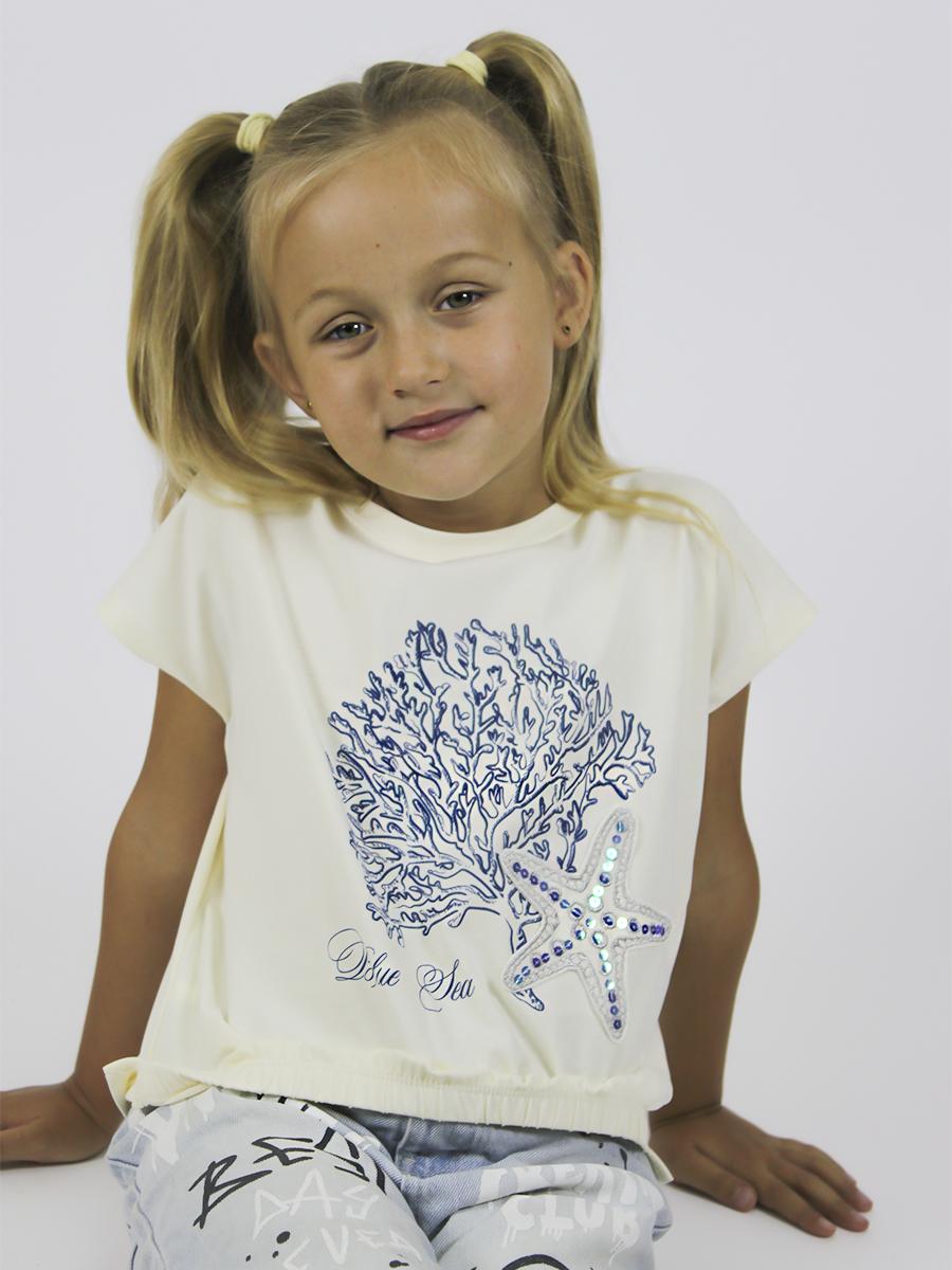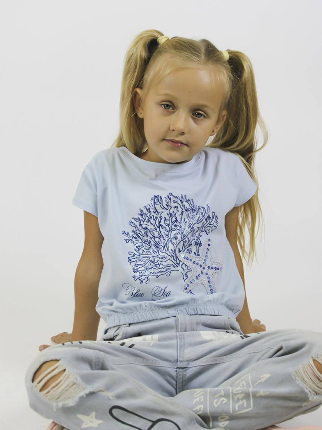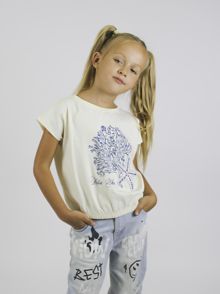 Футболка для девочки изготовлена из кулирного полотна (95 % хлопок, 5% лайкра). Модель прямого силуэта. Оригинальный принт с вышивкой (пайетки) точно понравится юным модницам. Ткань изделия мягкая, дышащая и приятная к телу.