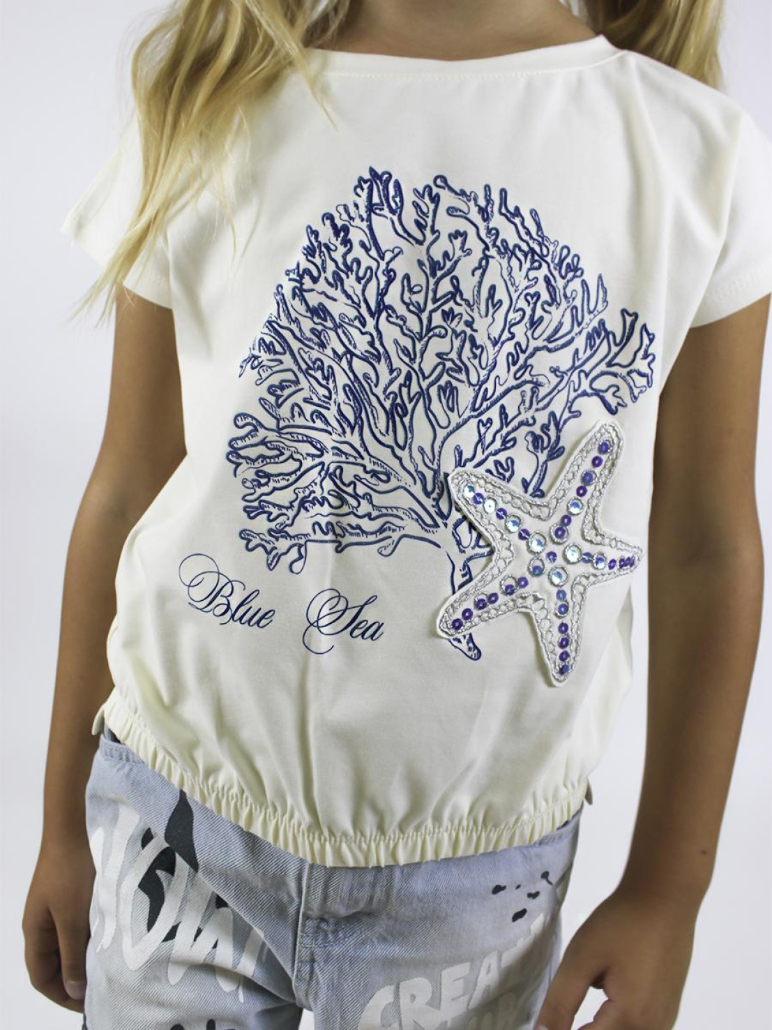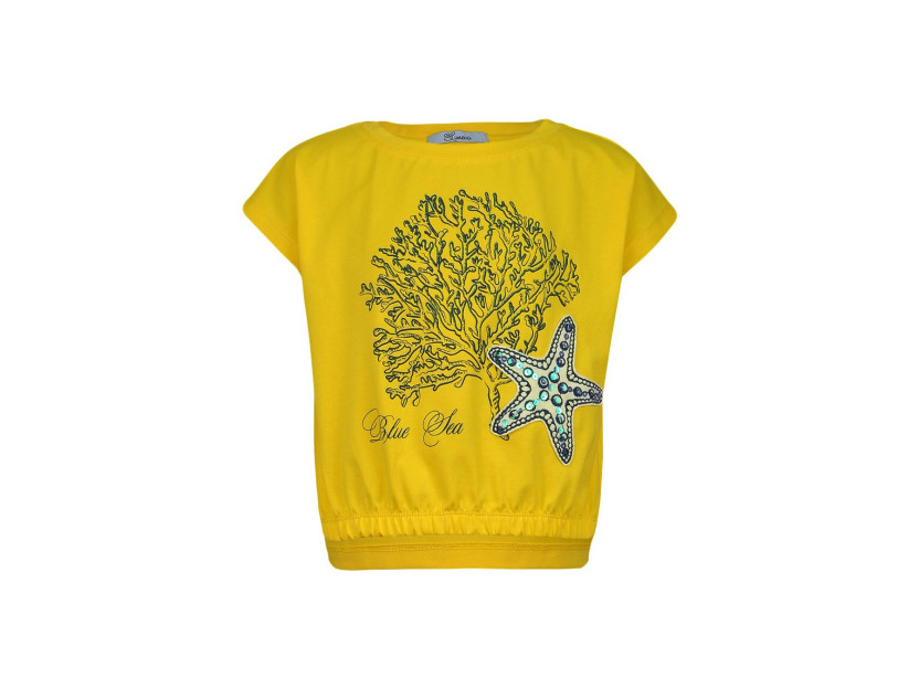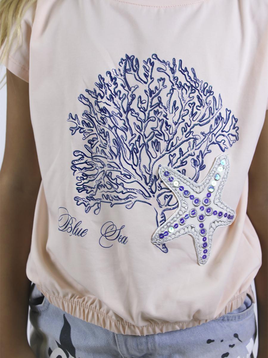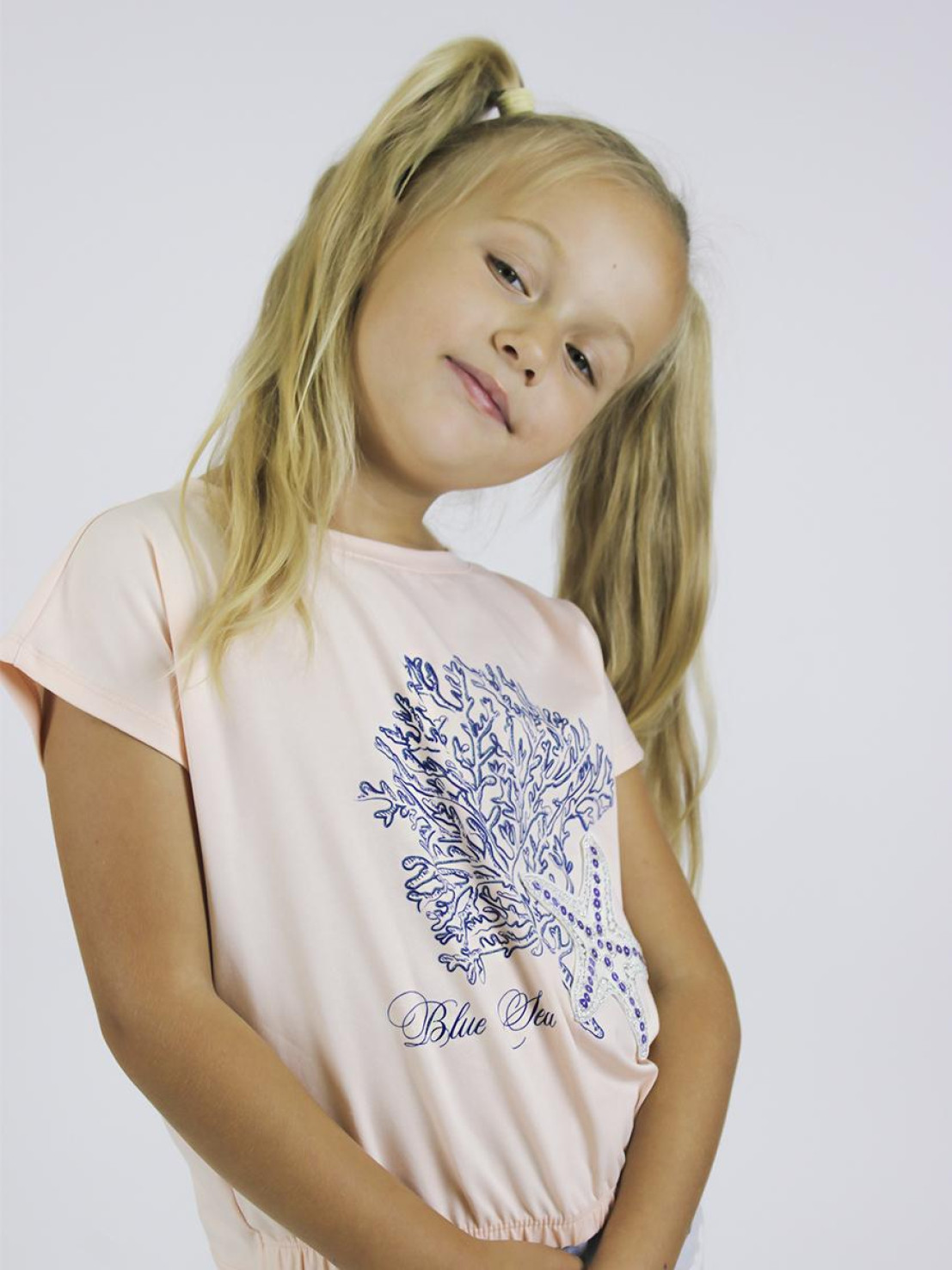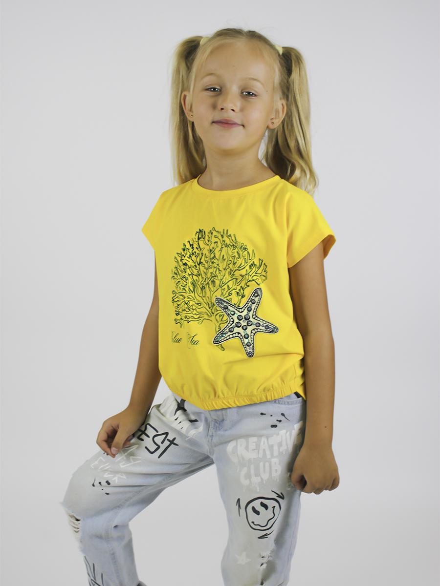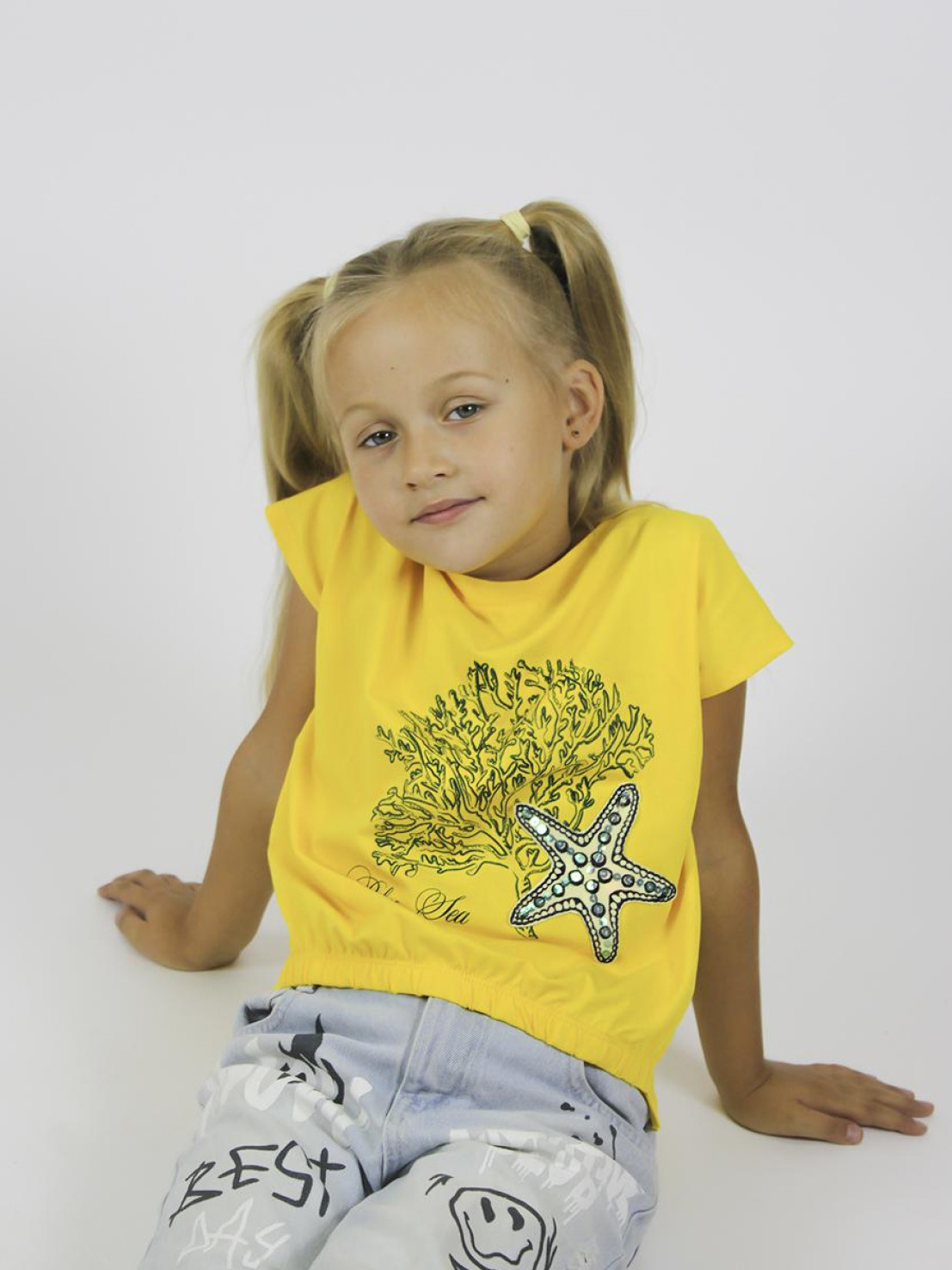 Футболка для девочки изготовлена из кулирного полотна (95 % хлопок, 5% лайкра). Модель прямого силуэта. Оригинальный принт с вышивкой (пайетки) точно понравится юным модницам. Ткань изделия мягкая, дышащая и приятная к телу.