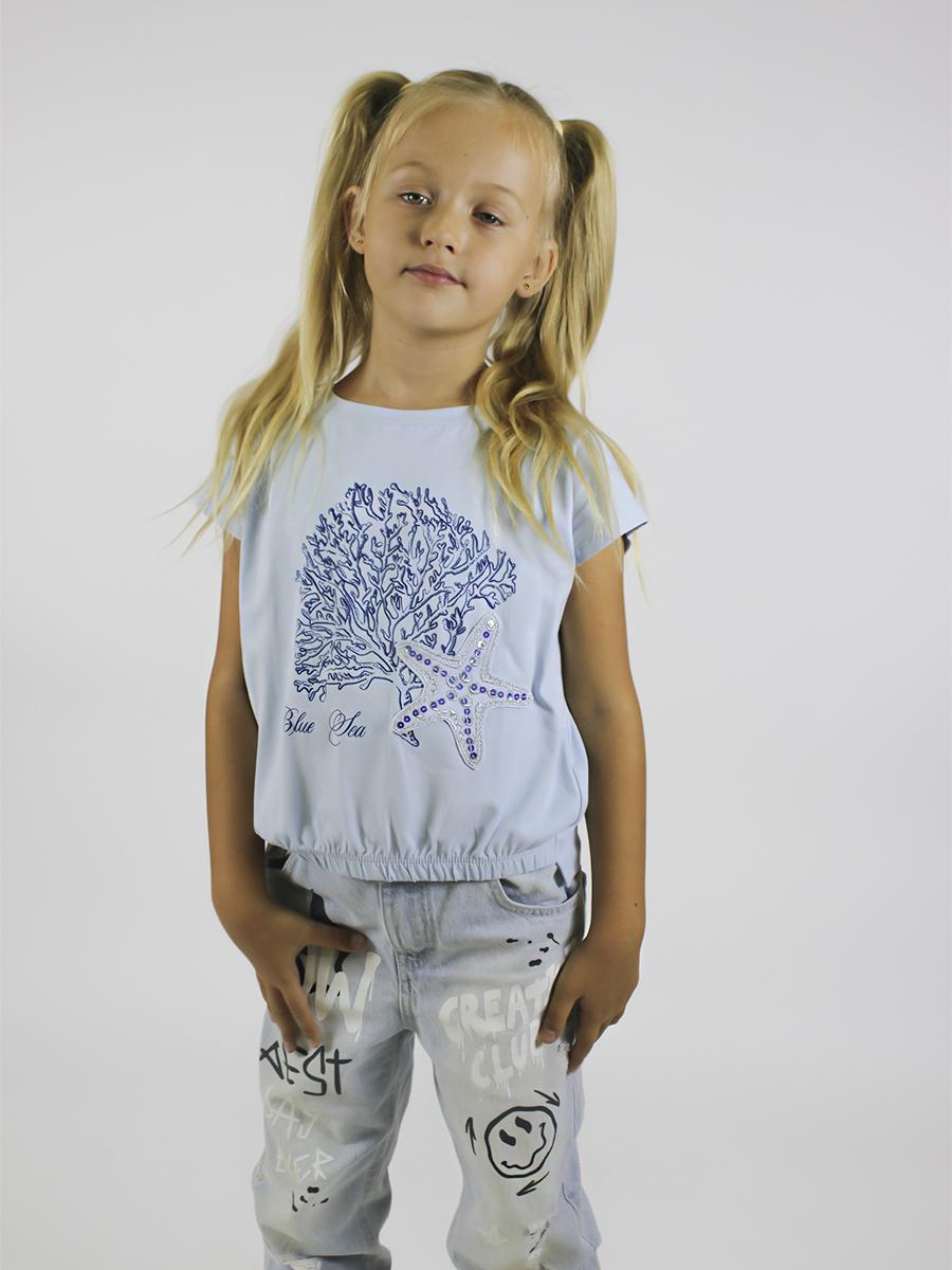 Футболка для девочки изготовлена из кулирного полотна (95 % хлопок, 5% лайкра). Модель прямого силуэта. Оригинальный принт с вышивкой (пайетки) точно понравится юным модницам. Ткань изделия мягкая, дышащая и приятная к телу.