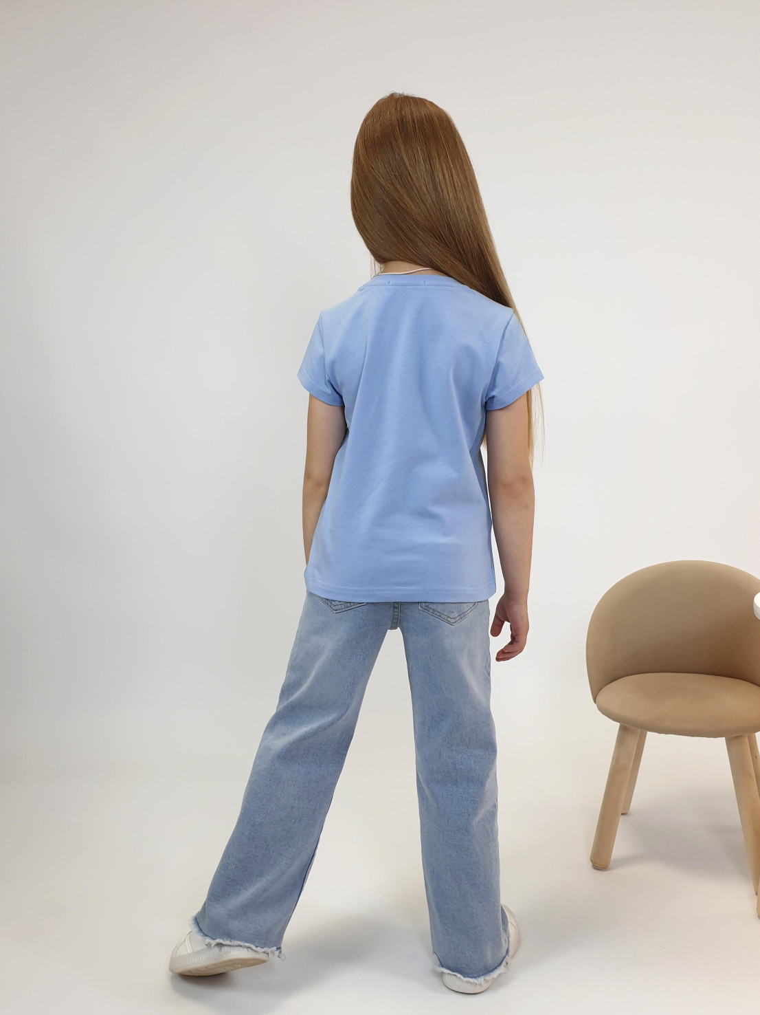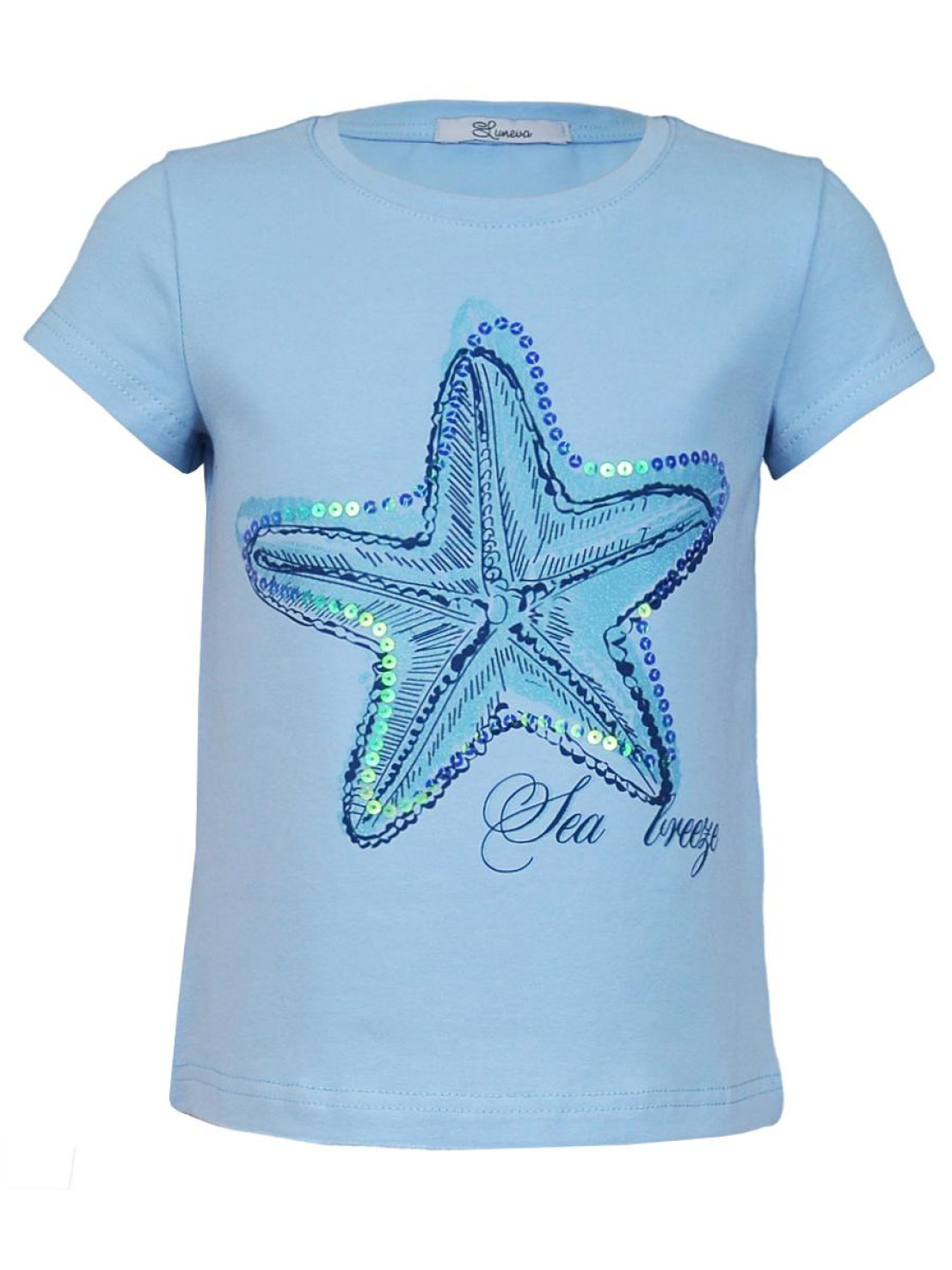 Кулирное полотно:95%х/б.,5% лайкра. Фуфайка-полуприлегающий силуэт,печать и вышивка пайетки на переде.Горловина обработана притачной планкой.Рукав короткий втачной.Низ рукава и низ изделия подшит.
