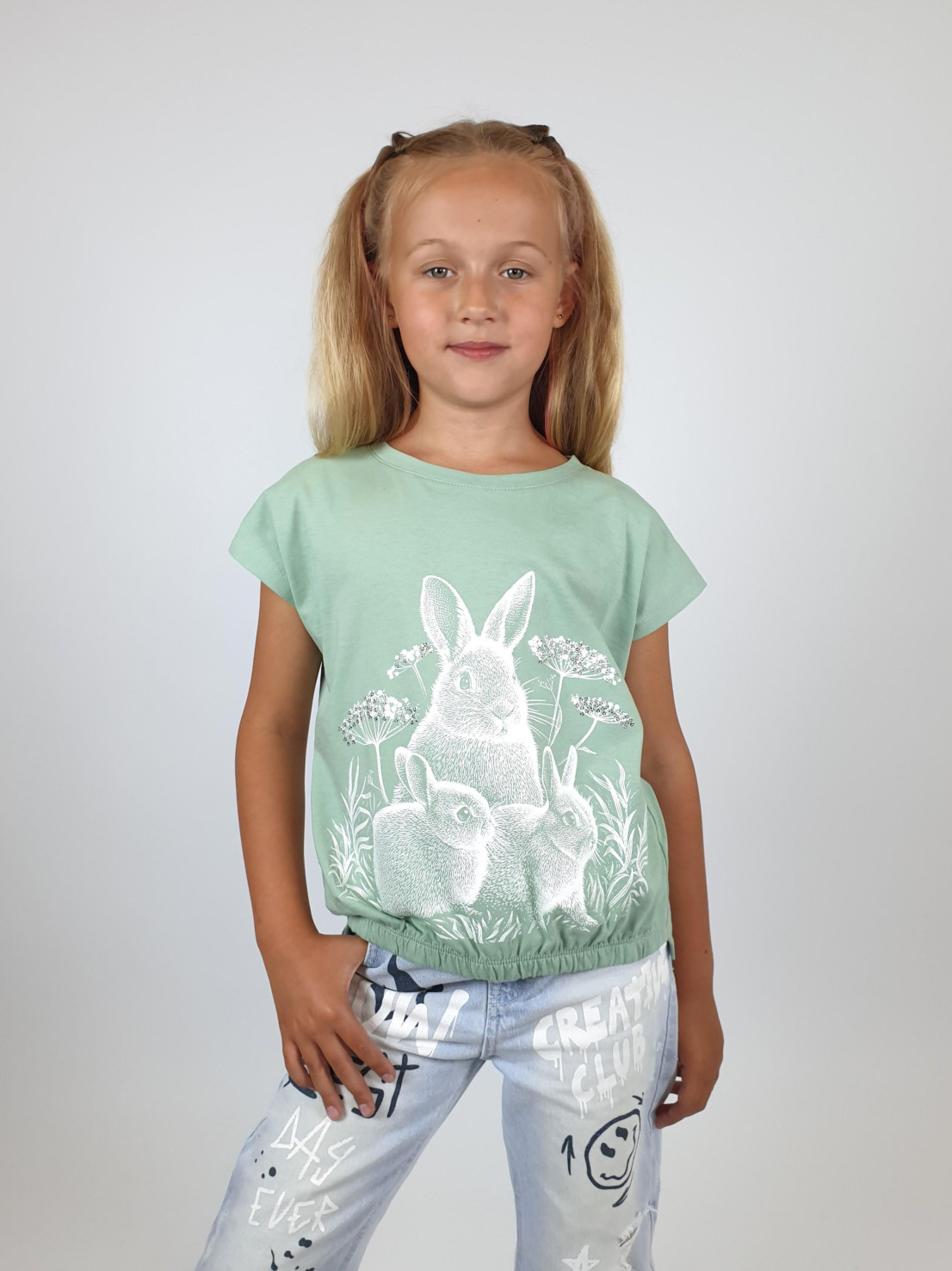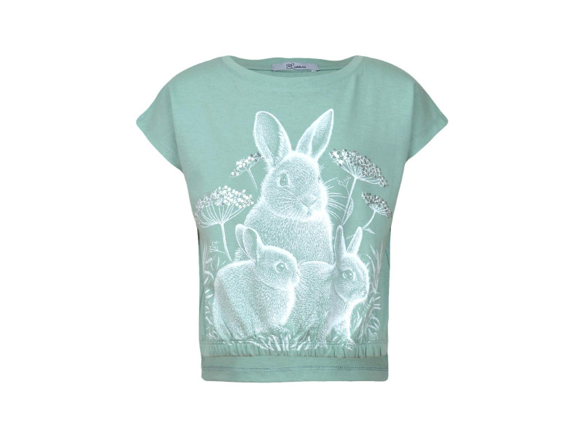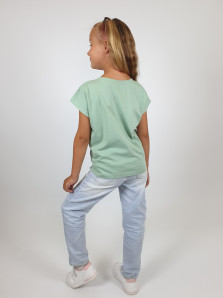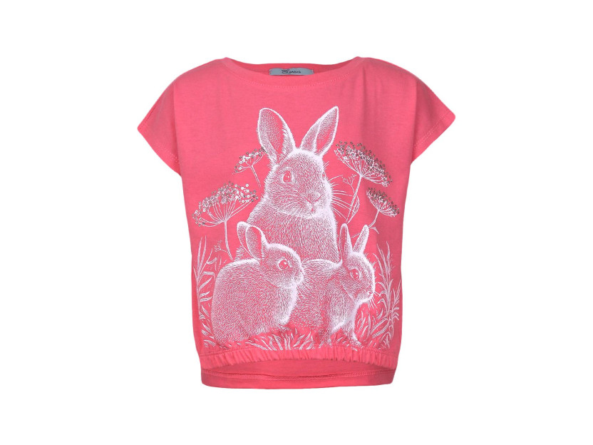 Кулирное полотно: 100% х/б. Фуфайка-прямой силуэт,печать и вышивка(пайетки) на переде,короткий спущенный рукав.Низ рукава и спинки фуфайки подшит.Горловина обработана притачной планкой.Перед внизу слегка собран на резинку.
