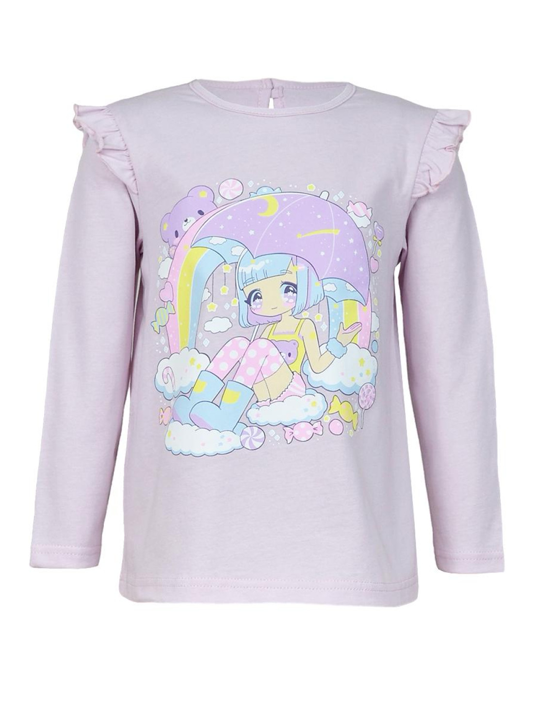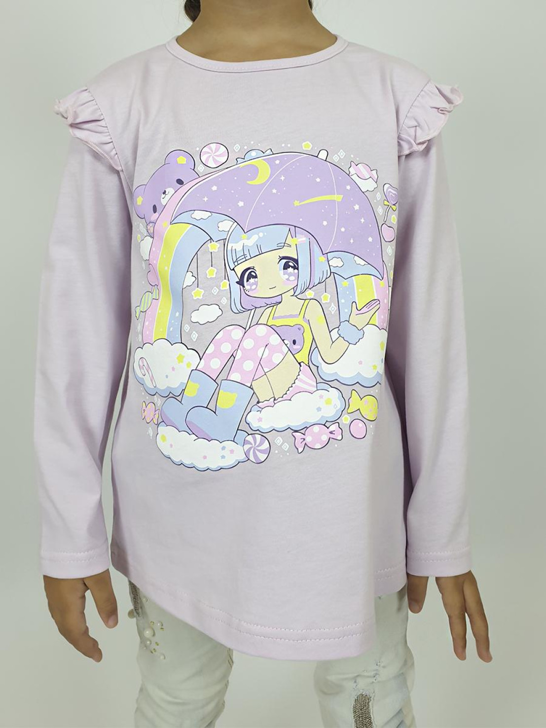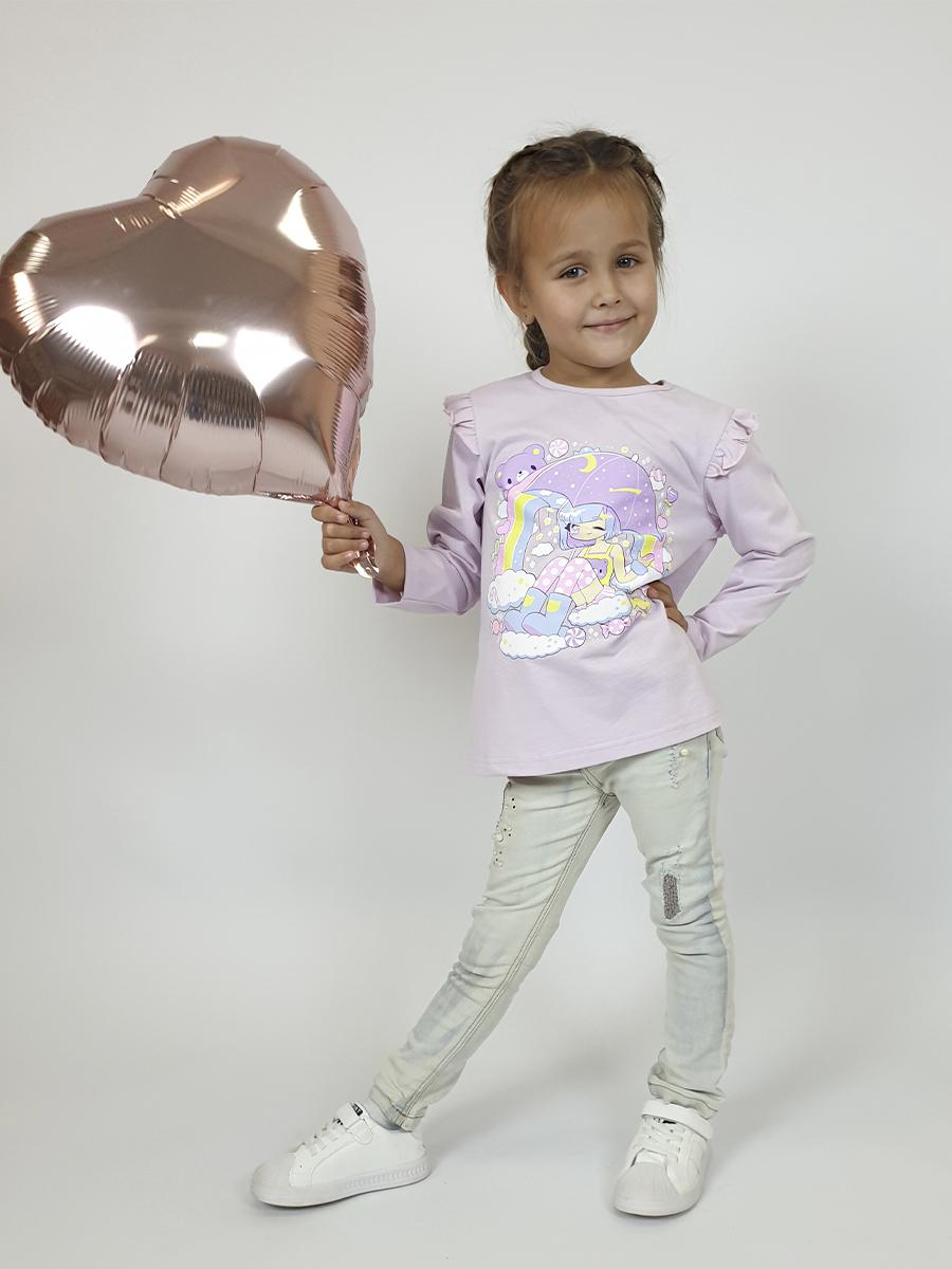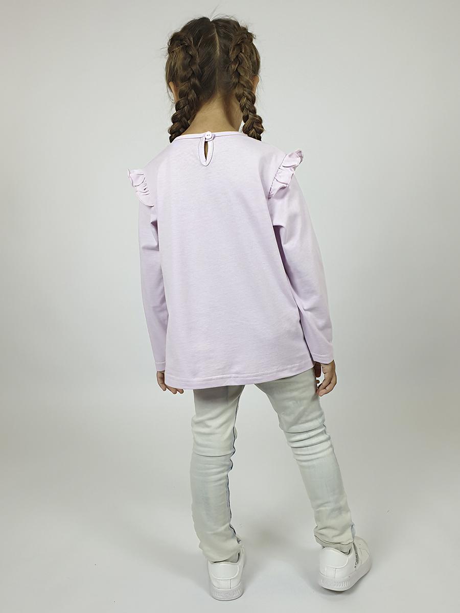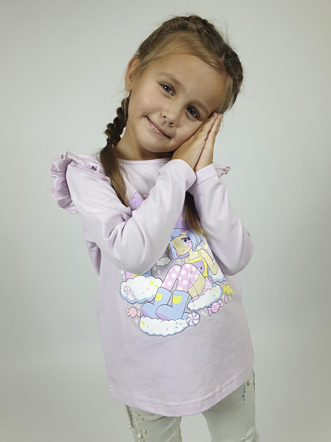 Кулирное полотно:100% х/б. Фуфайка-силуэт трапеция,длинный втачной рукав,в пройме рюша.Горловина окантована,застежка на пуговицу по спинке.Печать на переде.