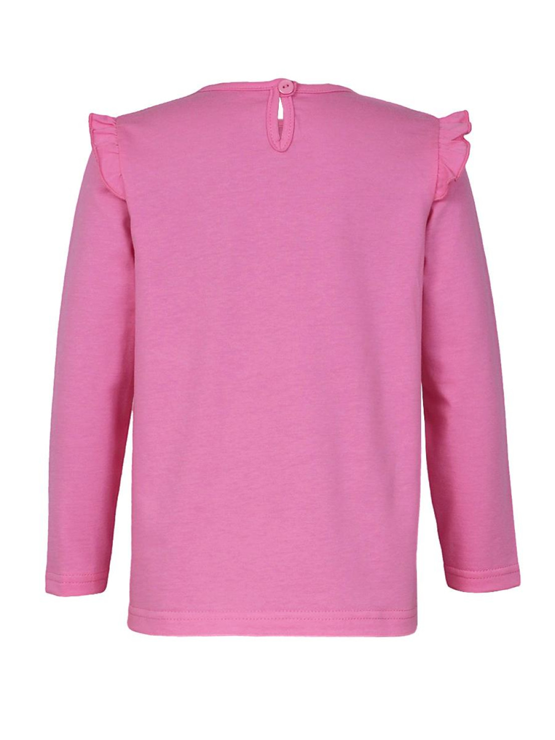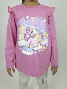 Кулирное полотно:100% х/б. Фуфайка-силуэт трапеция,длинный втачной рукав,в пройме рюша.Горловина окантована,застежка на пуговицу по спинке.Печать на переде.
