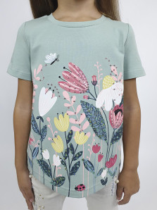Кулирное полотно:95% х/б.,5% лайкра. Фуфайка-прямой силуэт,печать и вышивка(пайетки)на переде,короткий втачной рукав.Низ рукава и фуфайки подшит.Горловина обработана планкой.