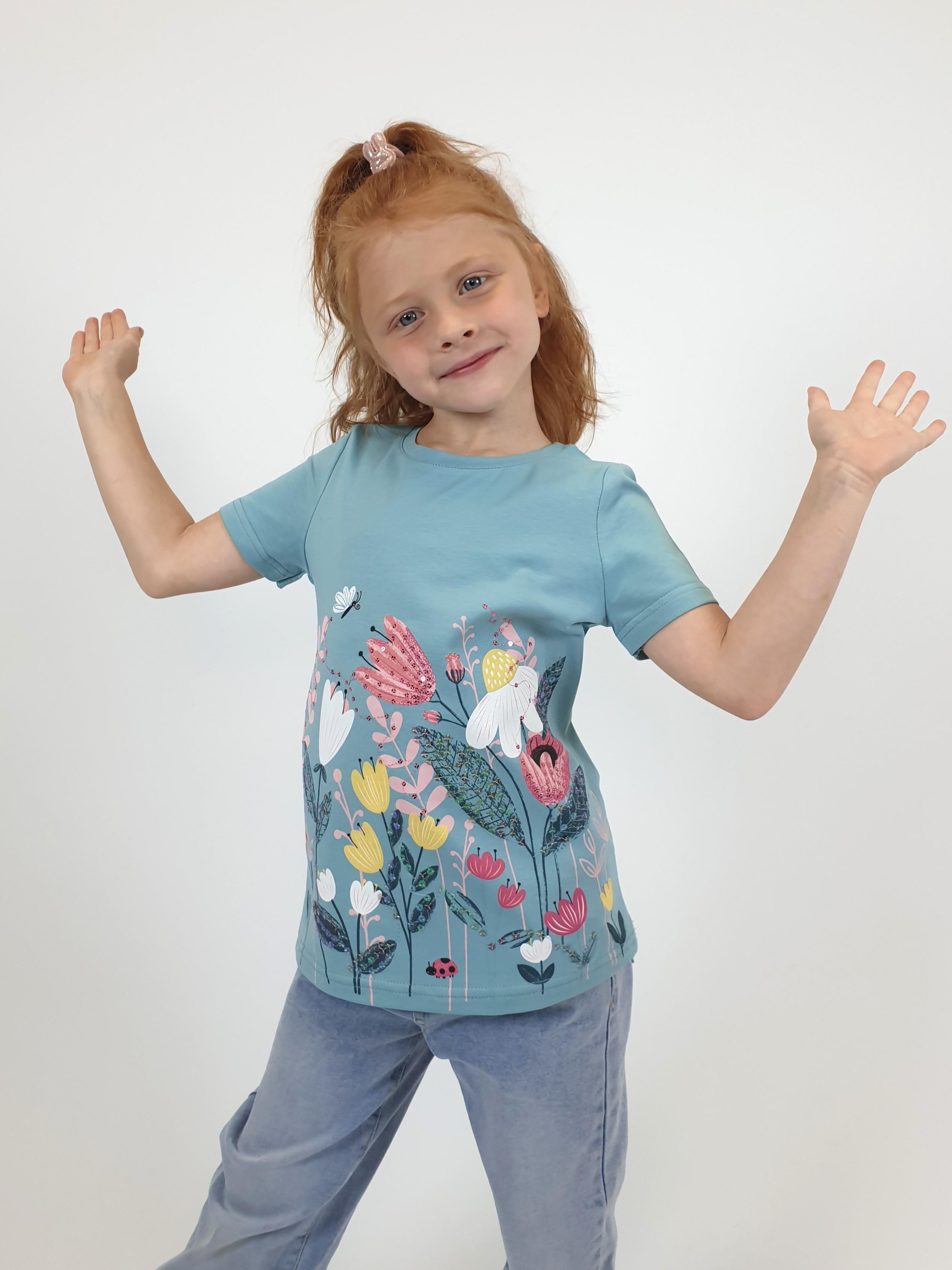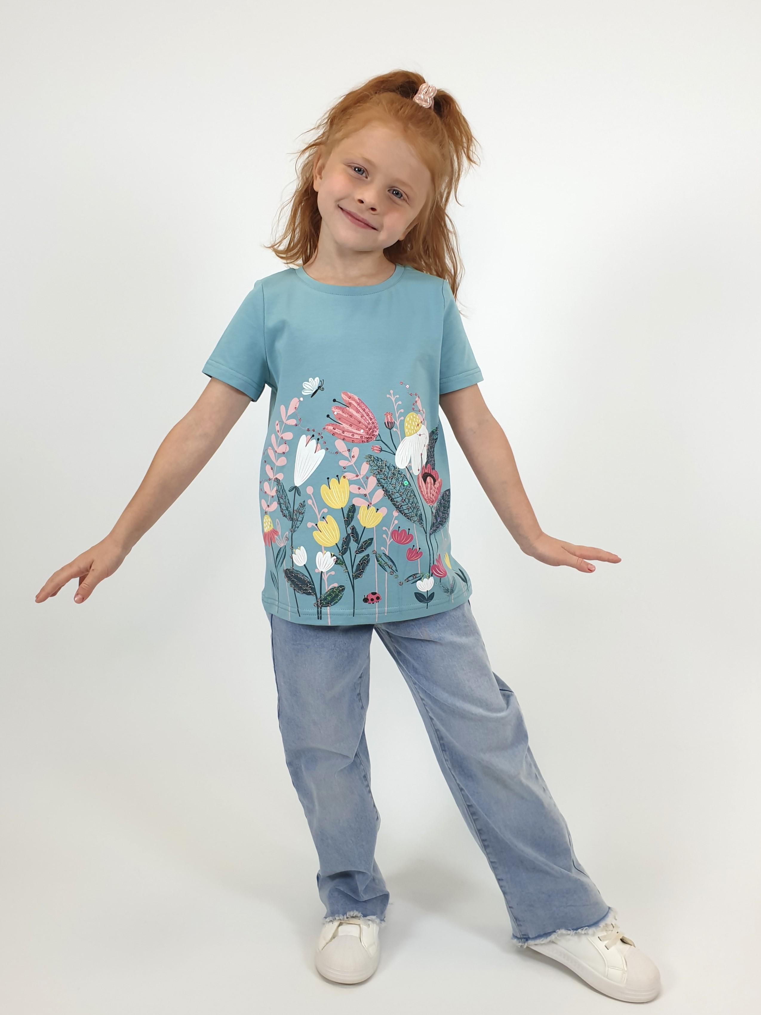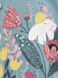 Кулирное полотно:95% х/б.,5% лайкра. Фуфайка-прямой силуэт,печать и вышивка(пайетки)на переде,короткий втачной рукав.Низ рукава и фуфайки подшит.Горловина обработана планкой.