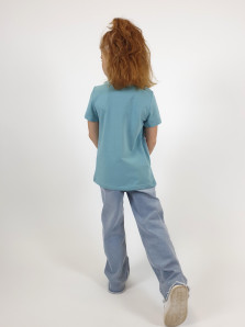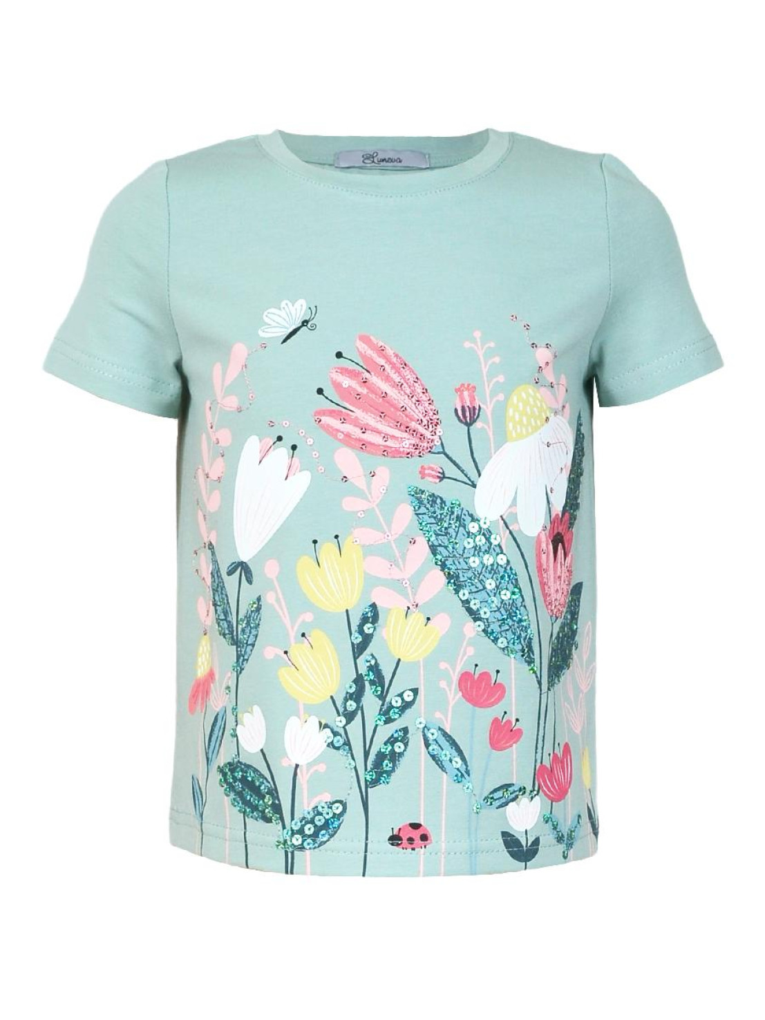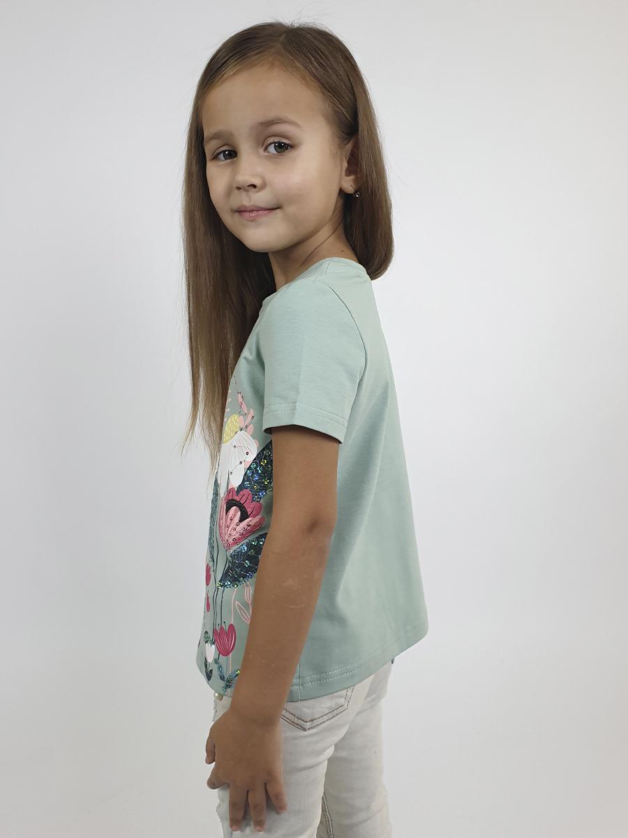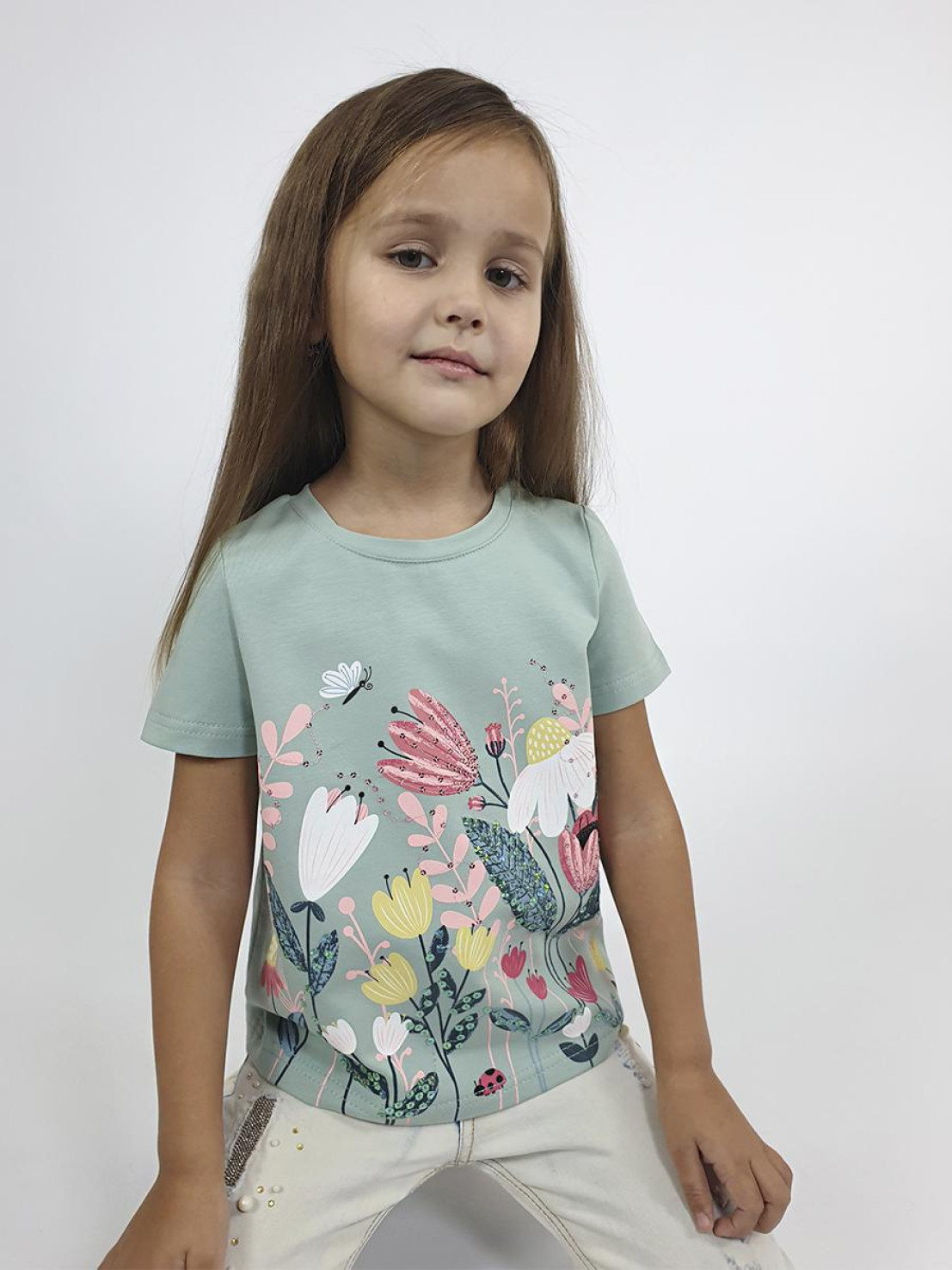 Кулирное полотно:95% х/б.,5% лайкра. Фуфайка-прямой силуэт,печать и вышивка(пайетки)на переде,короткий втачной рукав.Низ рукава и фуфайки подшит.Горловина обработана планкой.