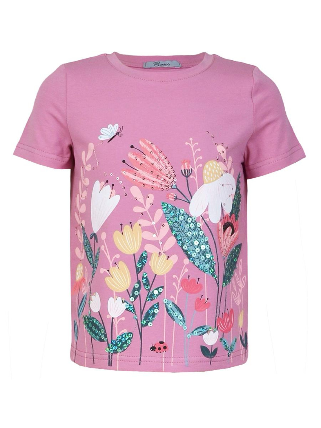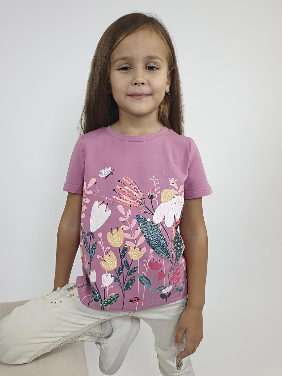 Кулирное полотно:95% х/б.,5% лайкра. Фуфайка-прямой силуэт,печать и вышивка(пайетки)на переде,короткий втачной рукав.Низ рукава и фуфайки подшит.Горловина обработана планкой.