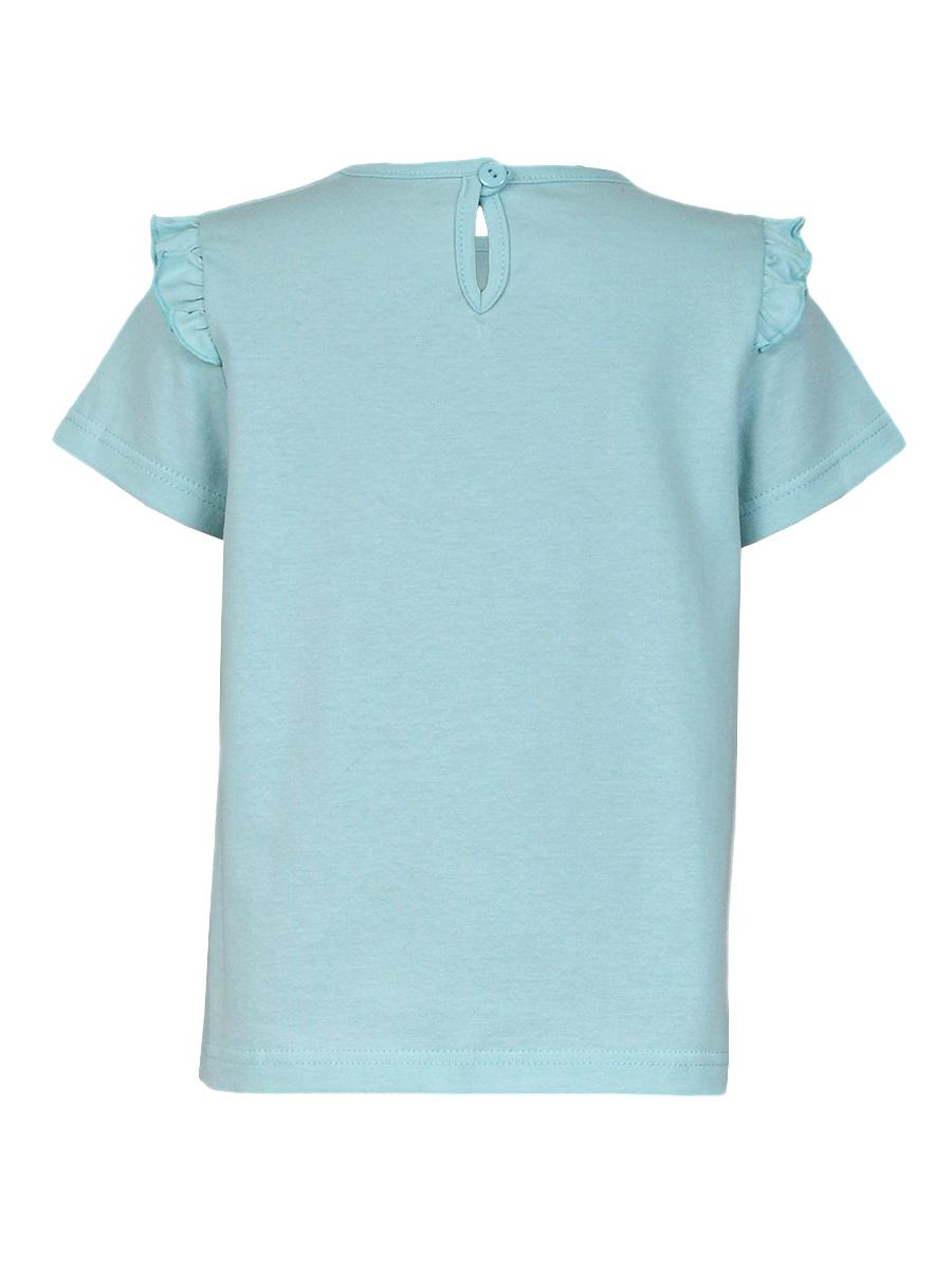 Кулирное полотно:100% х/б. Фуфайка-силуэт трапеция,короткий втачной рукав,в пройме рюша.Горловина окантована,застежка на пуговицу по спинке.Печать на переде.