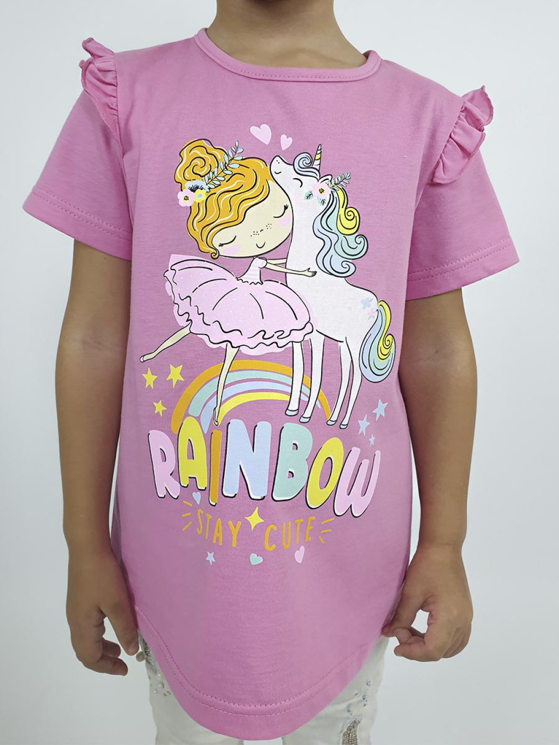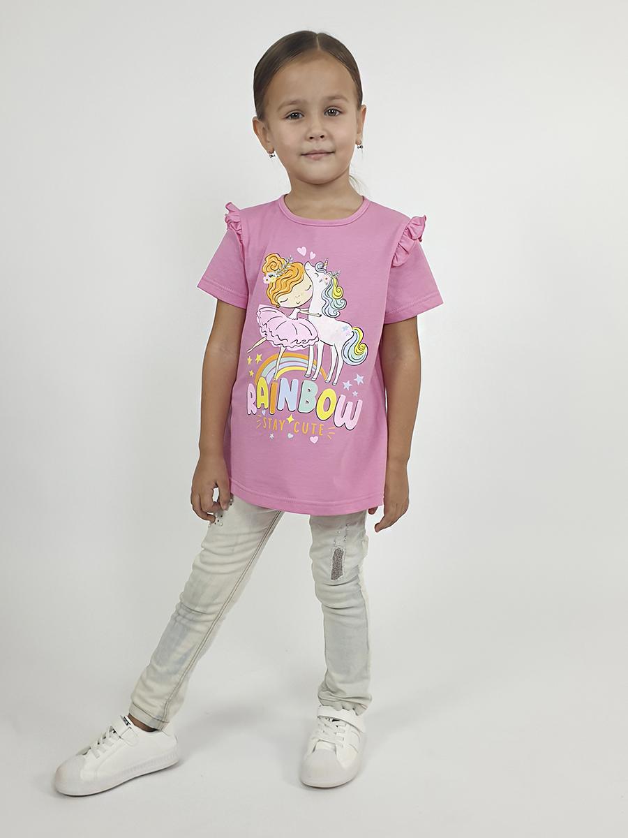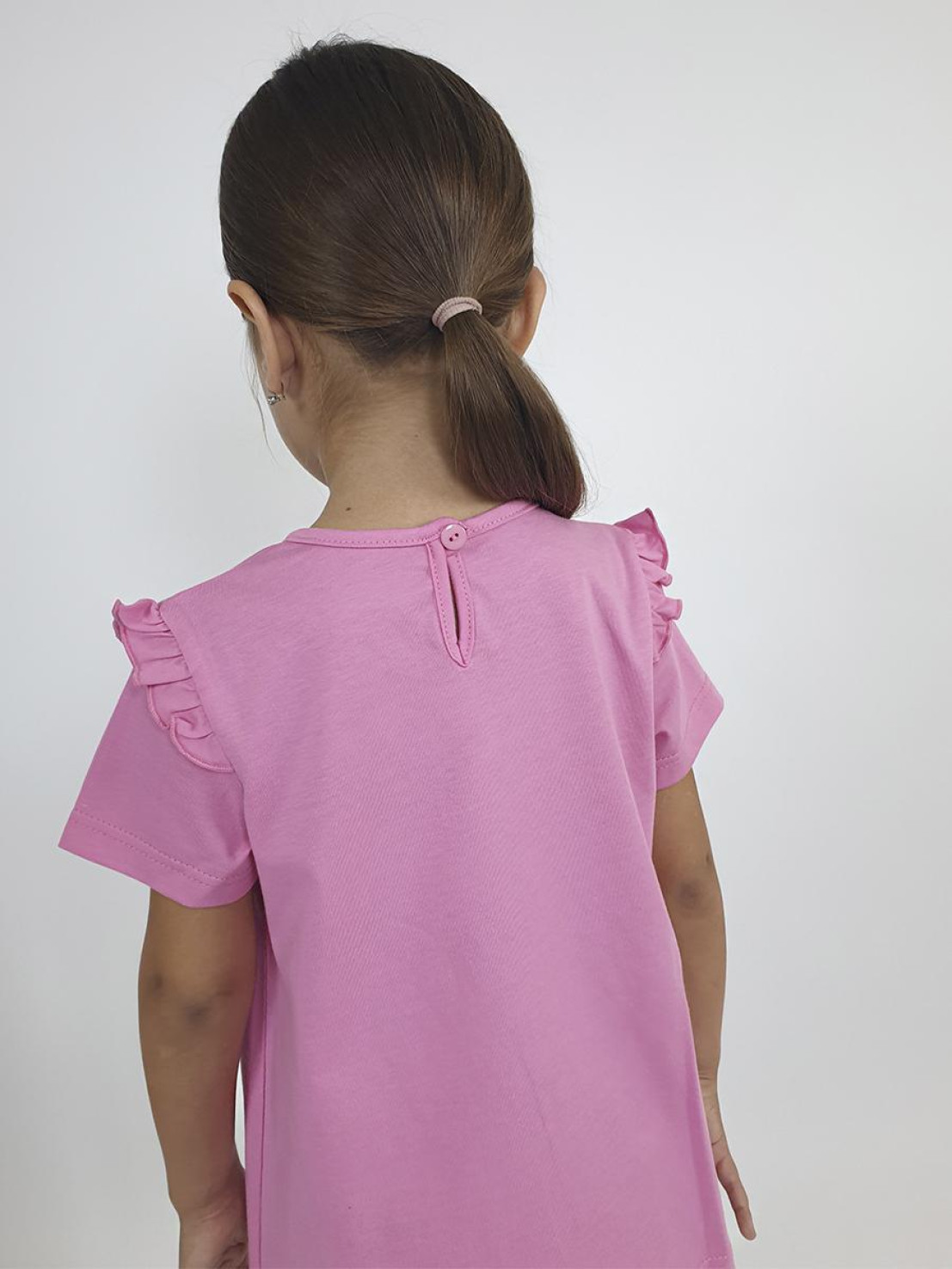 Кулирное полотно:100% х/б. Фуфайка-силуэт трапеция,короткий втачной рукав,в пройме рюша.Горловина окантована,застежка на пуговицу по спинке.Печать на переде.
